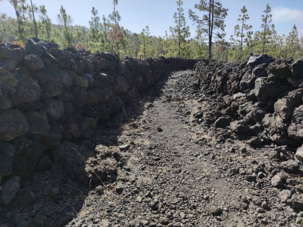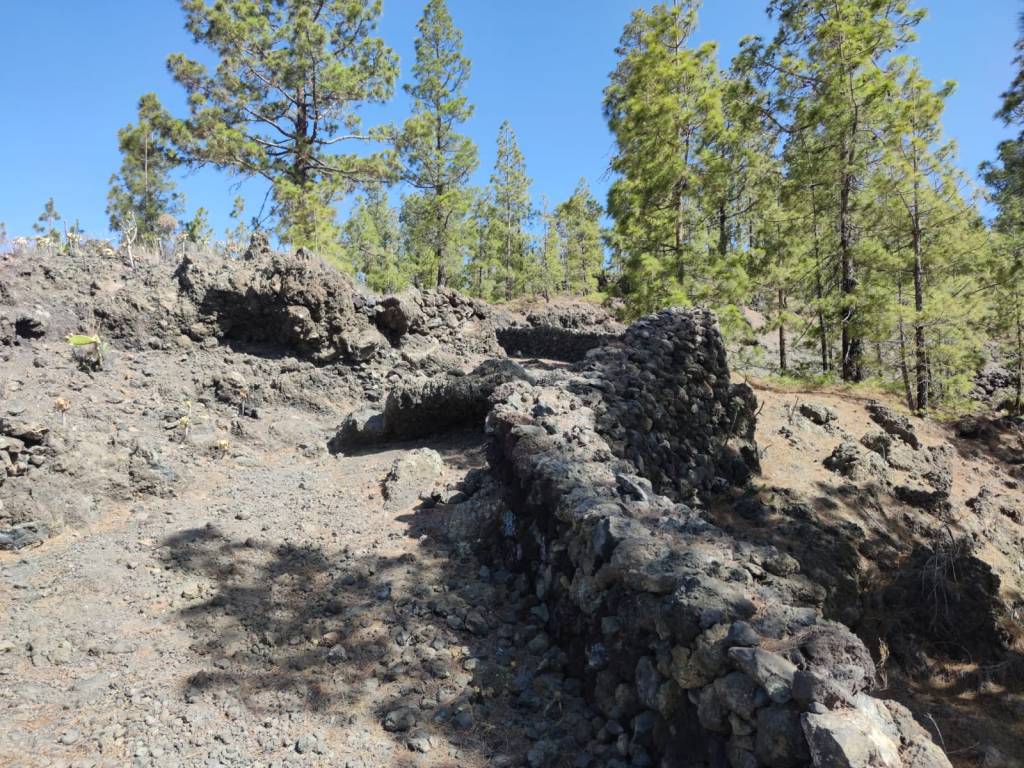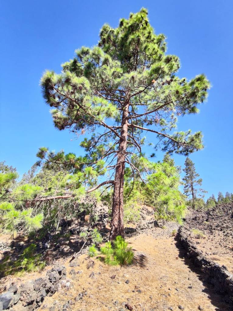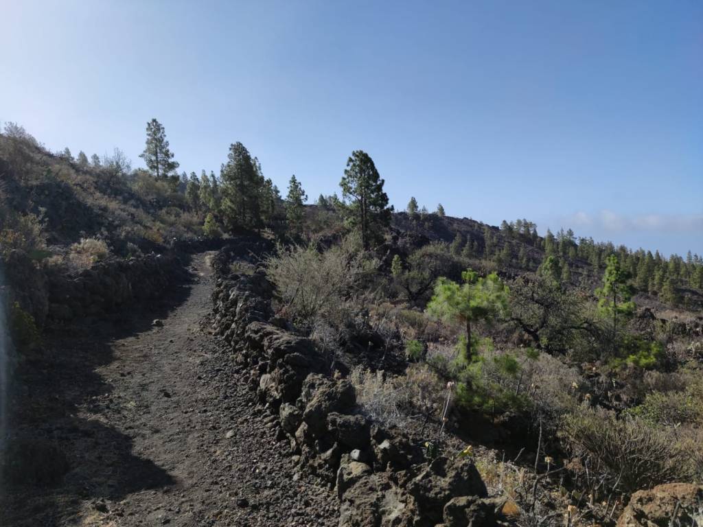 Son estos pinos canarios los que nos van a dar cobijo en nuestro andar, y entre las numerosas huertas de cultivo, viejos almendros que cuando están en flor son un autentico espectáculo haya por los meses de enero y febrero. Fincas que vamos a ir viendo entre las lavas que dejo el volcán Chinyero en su ultima erupción.