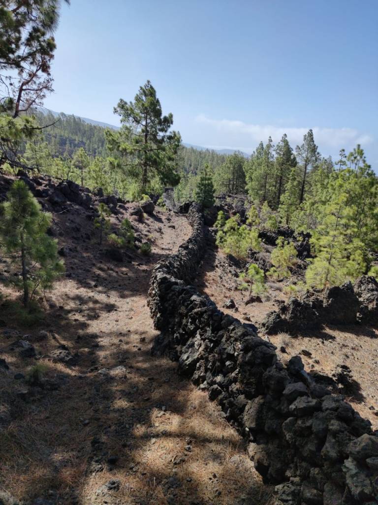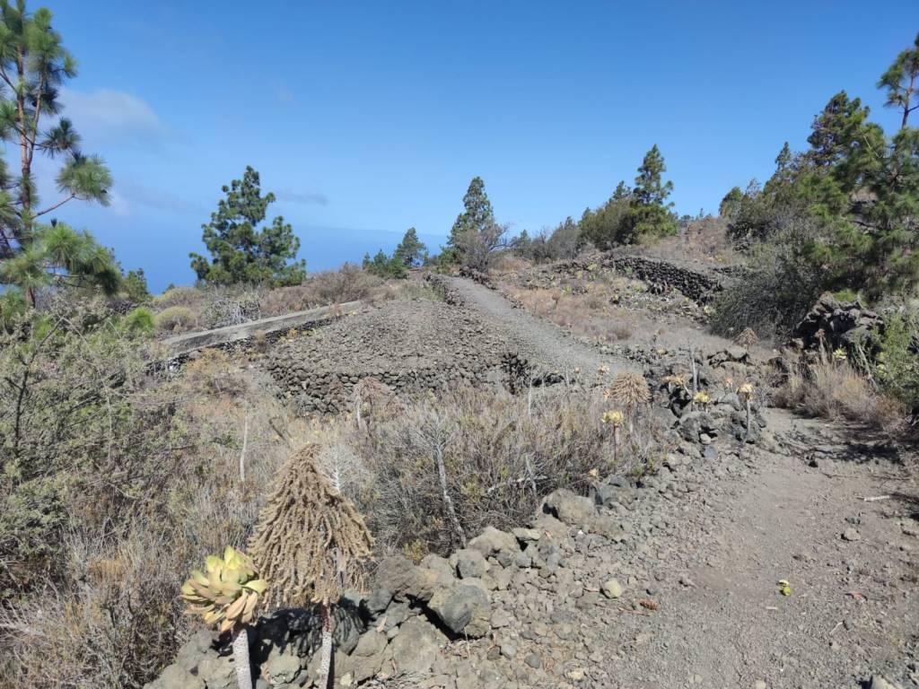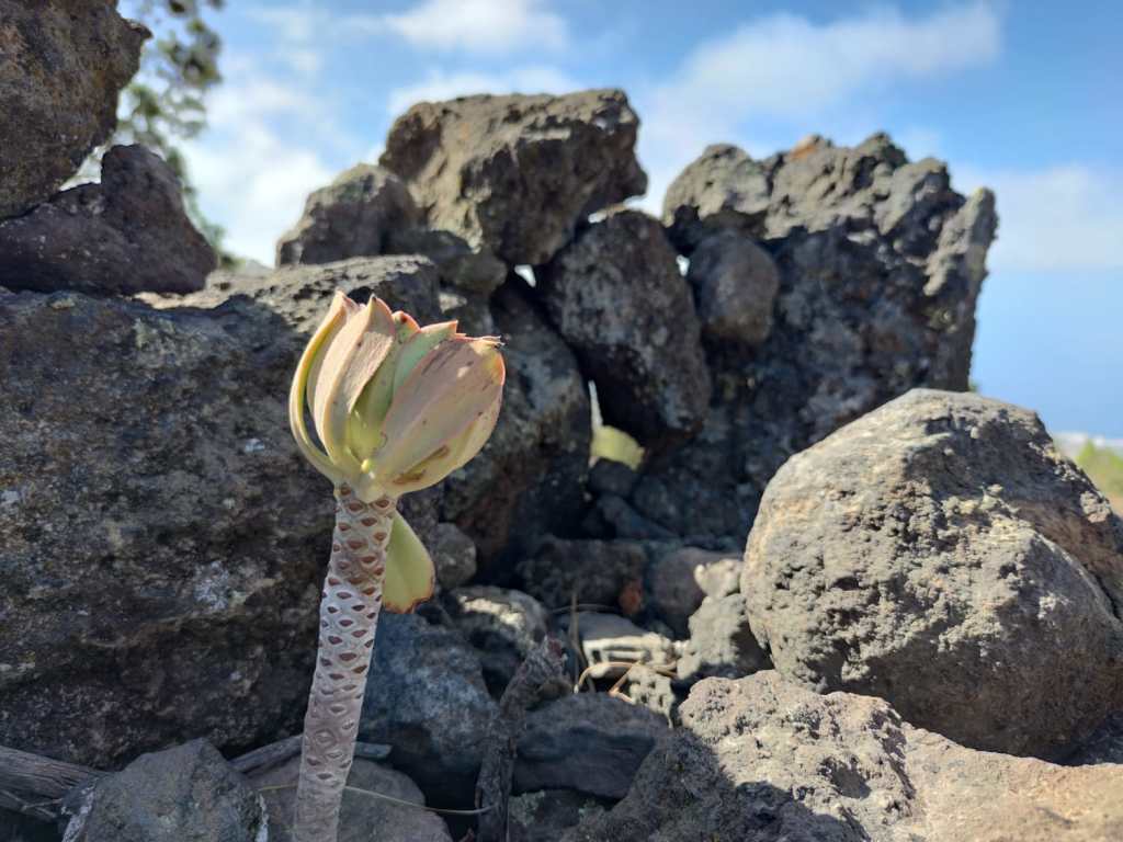 Arguayo, en el oeste de la isla cuenta con muchos de estos caminos. Nos adentramos por uno de ellos, en una ruta circular, entre huertas tradicionales y caminos delimitados por muros de piedra en los laterales que nos marcan la dirección a seguir. Una zona de malpaís, donde el camino se va alternando con veredas estrechas y donde la colonización vegetal se reduce a bejeques (Aeonium pseudourbicum) y pinos (Pinus Canariensis) aislados.