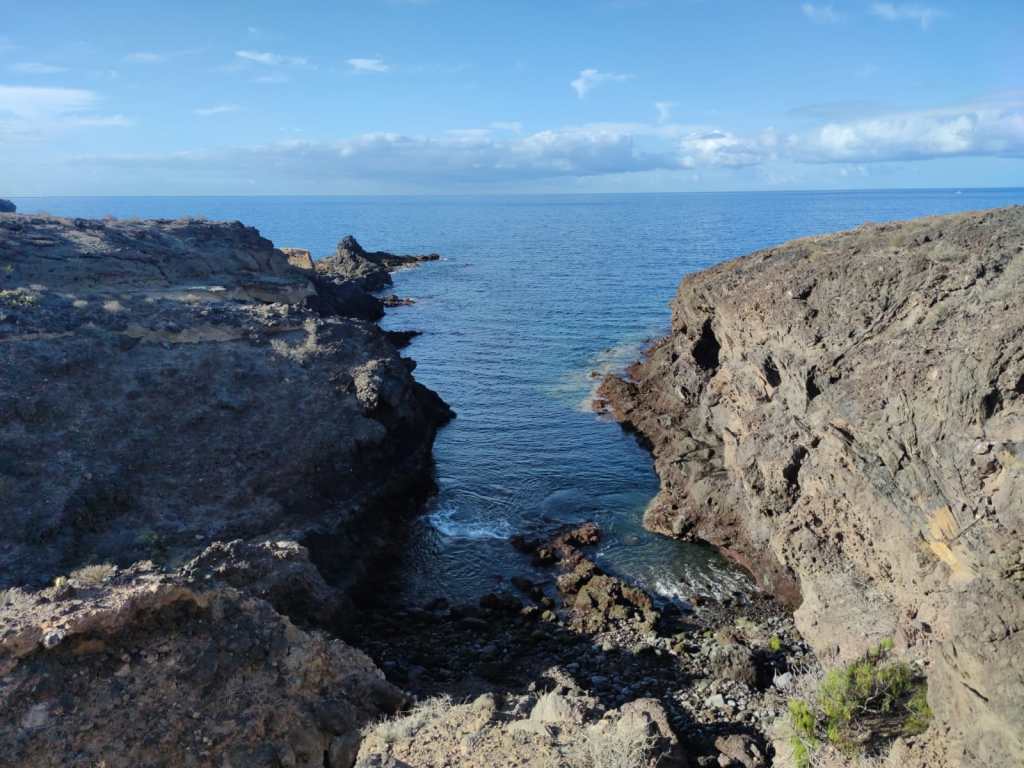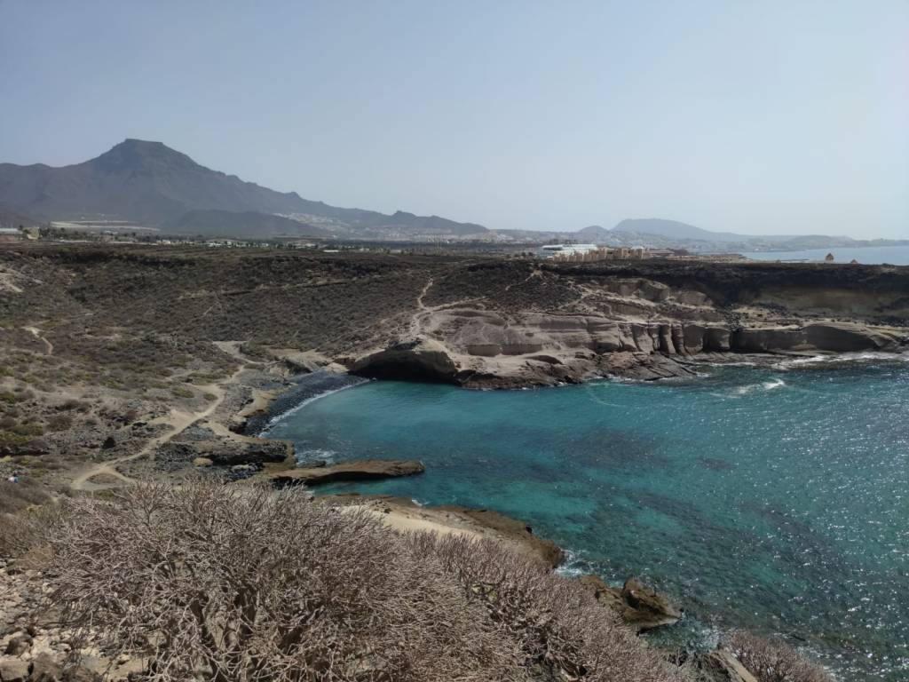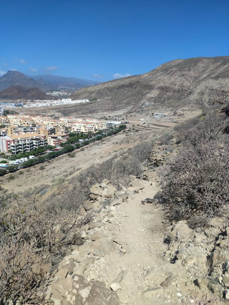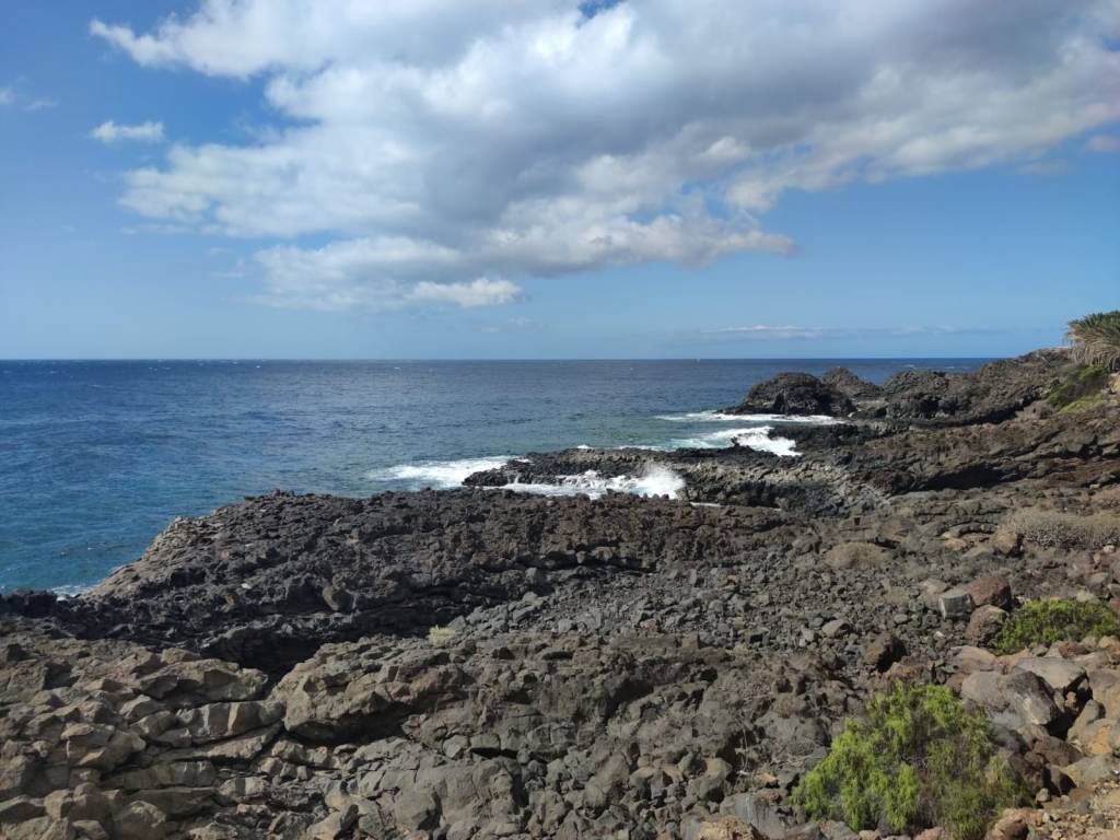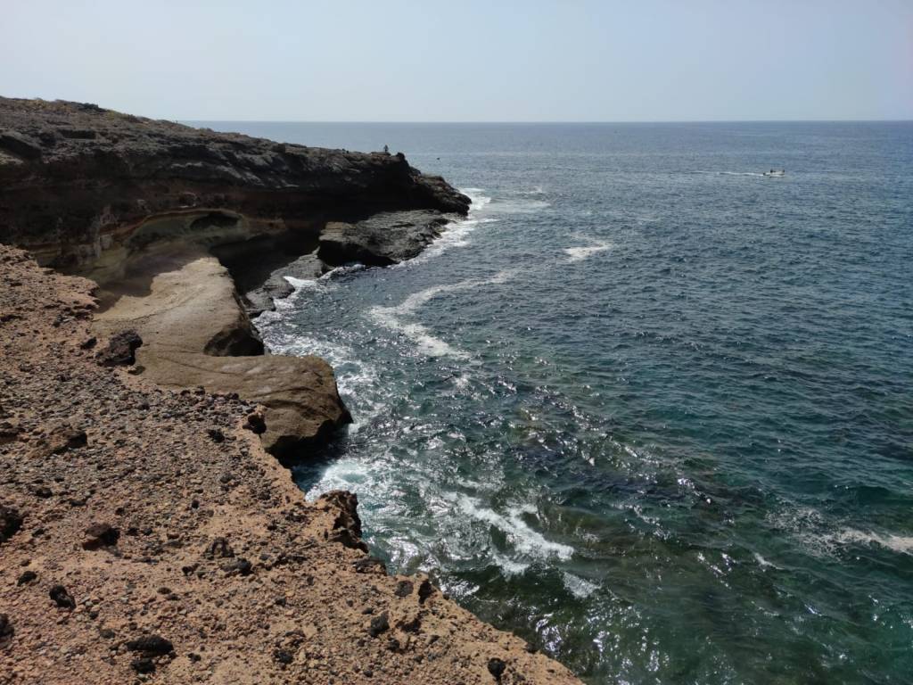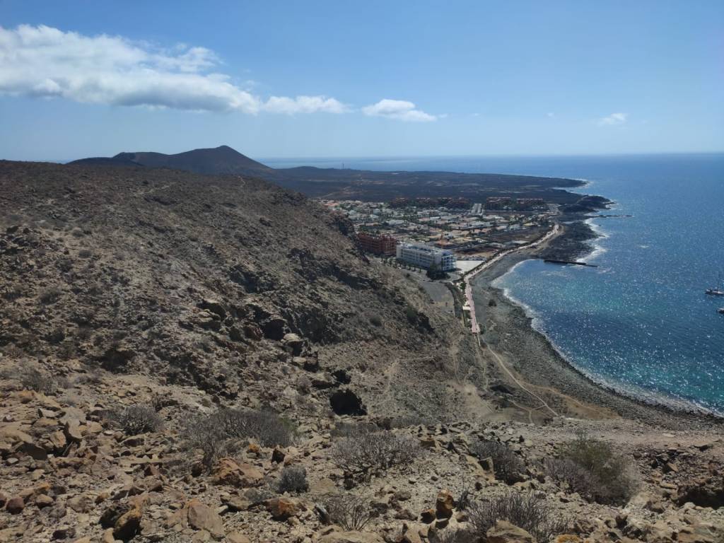 Saliendo de Las Galletas, la aridez y el calor empiezan a notarse fuertemente. El paisaje desértico es la constancia en nuestro camino. Colores rojizos y marrones pintan las laderas de las montañas en todo el horizonte. Solamente salpicado por el verde de los cardones y tabaibas que nos encontramos dibujando un paisaje singular. Y es que si algo destaca en esta etapa es, sin duda, atravesar el Espacio Natural Protegido del Malpais de Rasca. Un entorno volcánico con Montañas importantes como Montaña Grande. Característica es su forma en herradura y sus 153m de altura. También destaca la montaña Pardela, que con sus coladas se extiende en este paisaje hasta el mar a lo largo de unos tres kilómetros de costa.