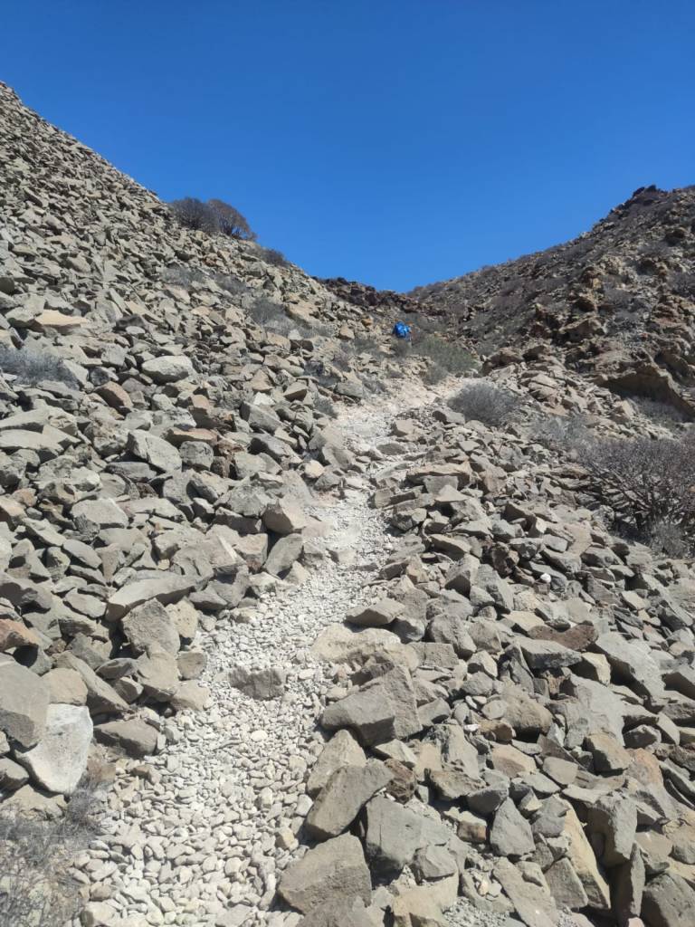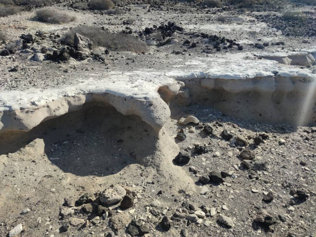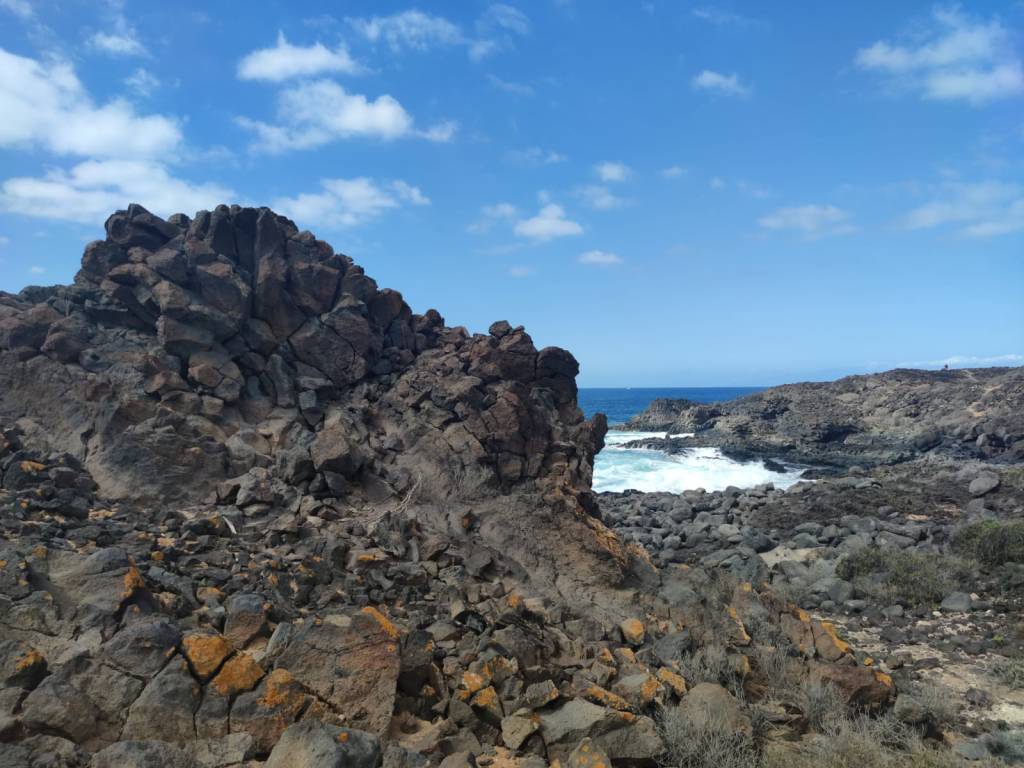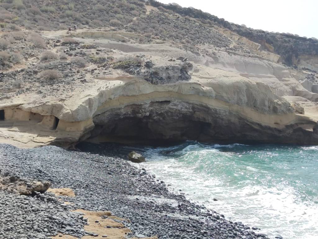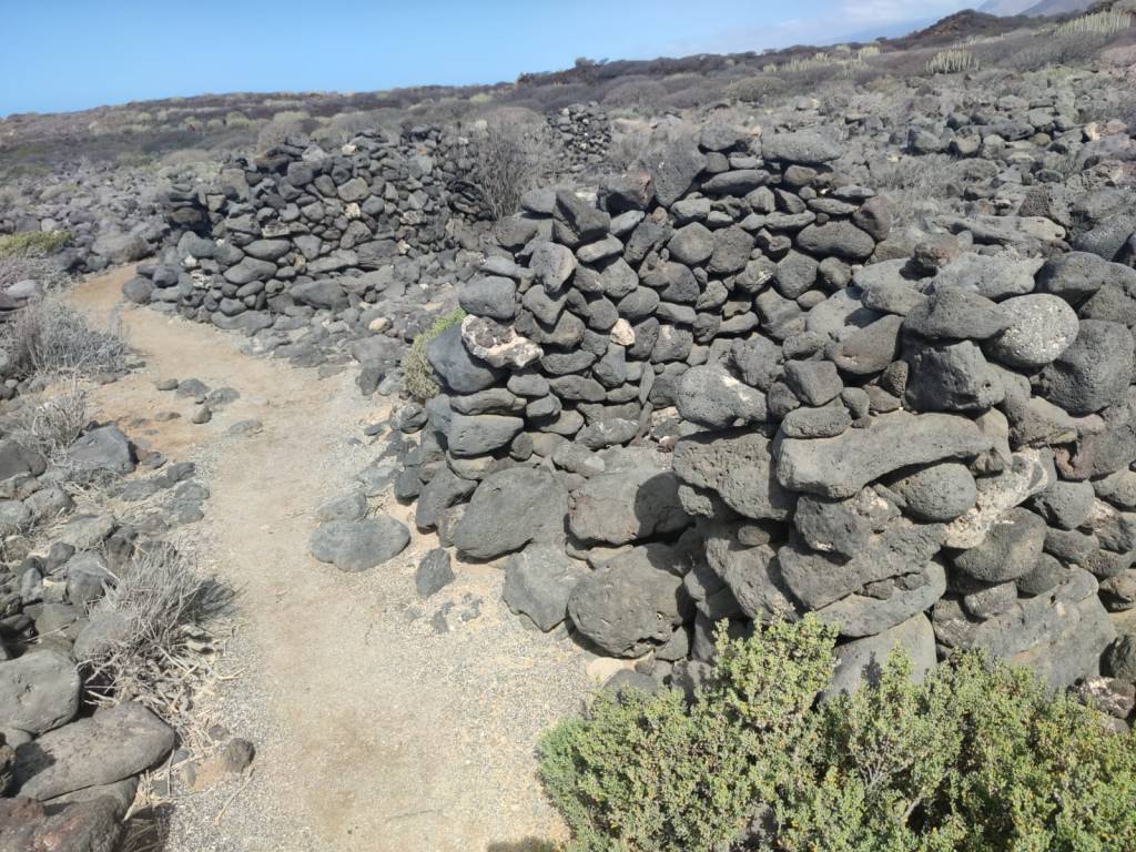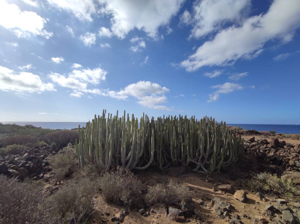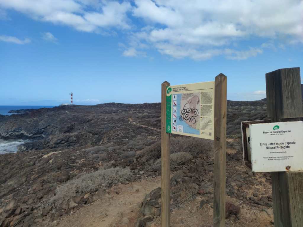 Saliendo de Las Galletas, la aridez y el calor empiezan a notarse fuertemente. El paisaje desértico es la constancia en nuestro camino. Colores rojizos y marrones pintan las laderas de las montañas en todo el horizonte. Solamente salpicado por el verde de los cardones y tabaibas que nos encontramos dibujando un paisaje singular. Y es que si algo destaca en esta etapa es, sin duda, atravesar el Espacio Natural Protegido del Malpais de Rasca. Un entorno volcánico con Montañas importantes como Montaña Grande. Característica es su forma en herradura y sus 153m de altura. También destaca la montaña Pardela, que con sus coladas se extiende en este paisaje hasta el mar a lo largo de unos tres kilómetros de costa.