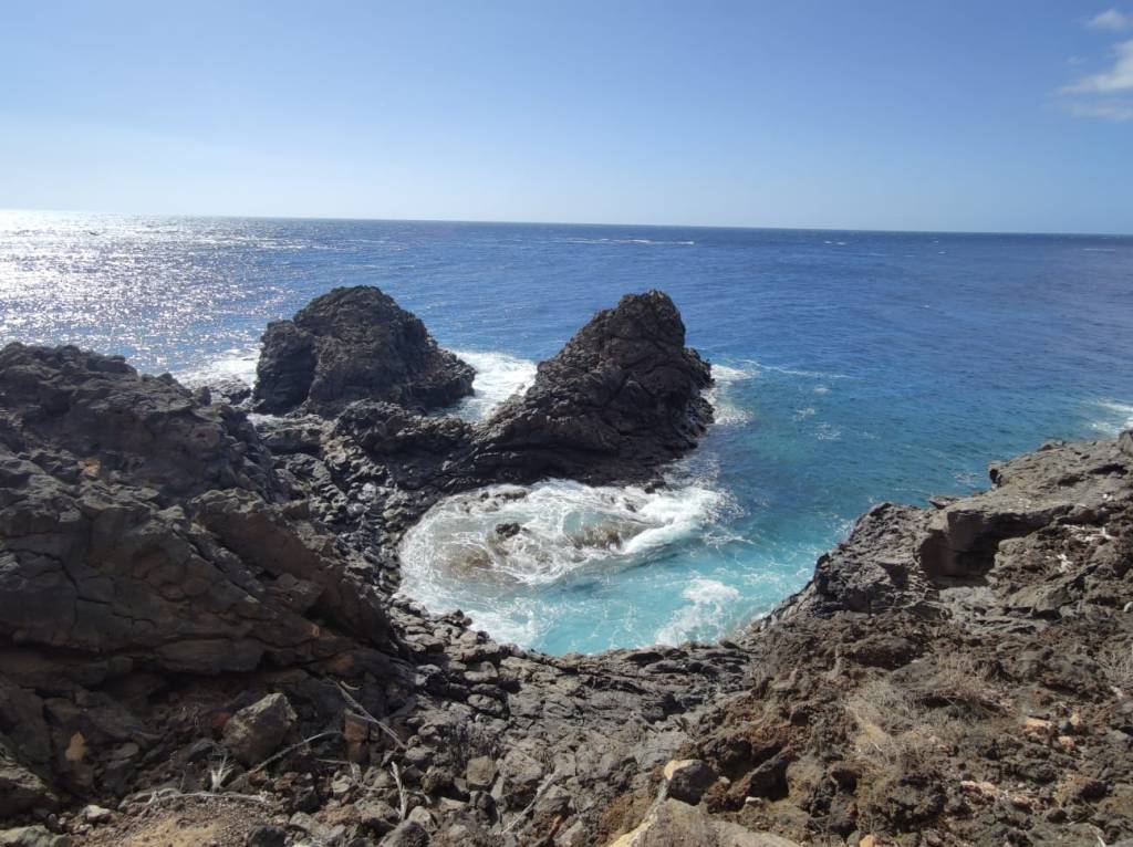 En esta etapa, nos llevamos nuestro primer baño de realidad, al intentar dar la vuelta a la isla por la costa. Lo que parecía una etapa tranquila se convirtió en toda una aventura por encontrar un sendero que nos llevara cerca del mar. Las grandes fincas de plátanos que hay en la zona tienen sus muros hasta bien pegados a los acantilados, por lo que pasar por el borde de estas fincas es una ardua tarea.