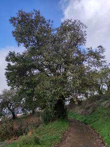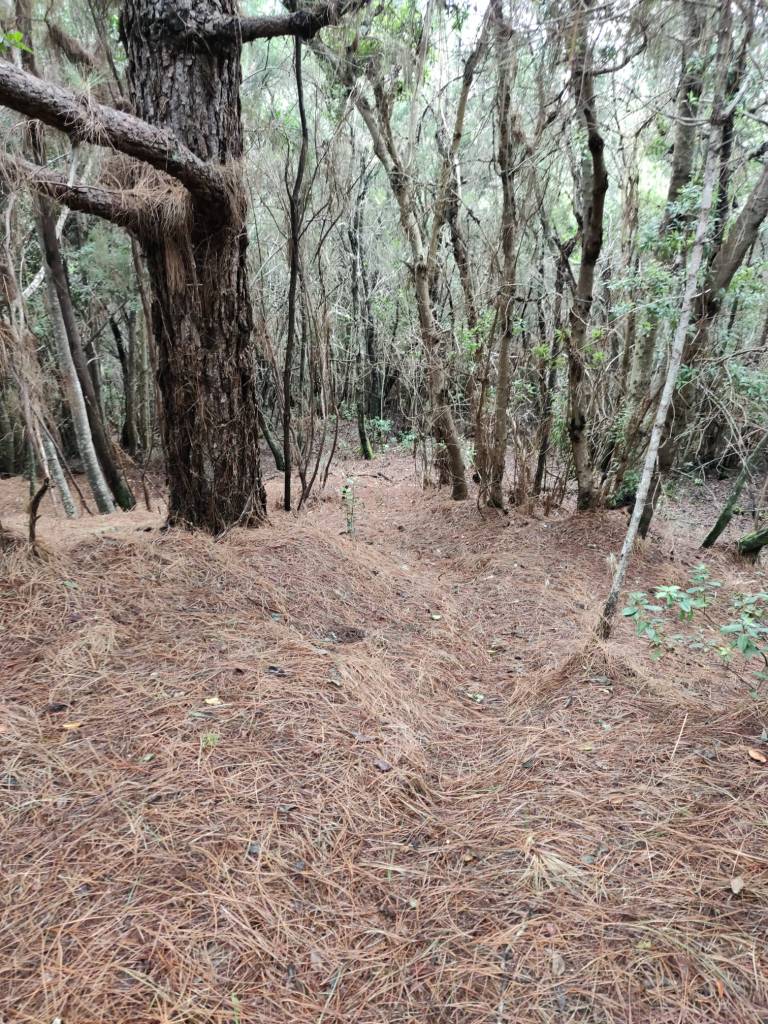 Y es que no solo la laurisilva va a estar presente en nuestro recorrido. Castaños centenarios nos mostrarán un espectacular tapiz de hojas en el suelo. Según vayamos ganando altitud aparecerán majestuosos pinos que también darán a nuestra ruta otro encanto de un gran bosque. Todo un bosque que goza de una estupenda salud y que debemos de preservar para no perderlo. Un bosque con un tapiz de hojas, pinocha y elementos naturales que hacen que se nos activen todos nuestros sentidos. Un bosque en el que nos encontraremos además la presencia de sanguinos. El sanguino es una especie habitual del monteverde, pero lo que hace excepcional a este paraje es la concentración tan alta de ejemplares y su inusitado gran porte, alcanzando muchos de ellos los 10 metros de altura.