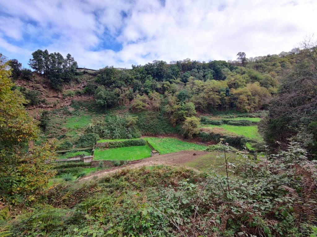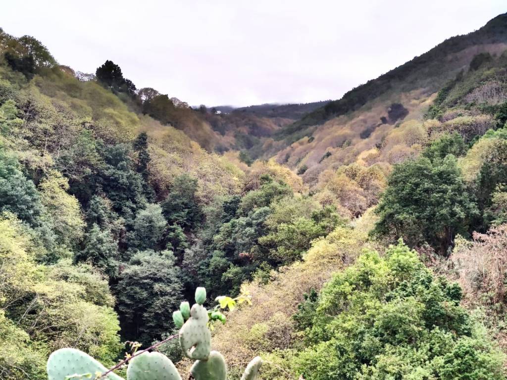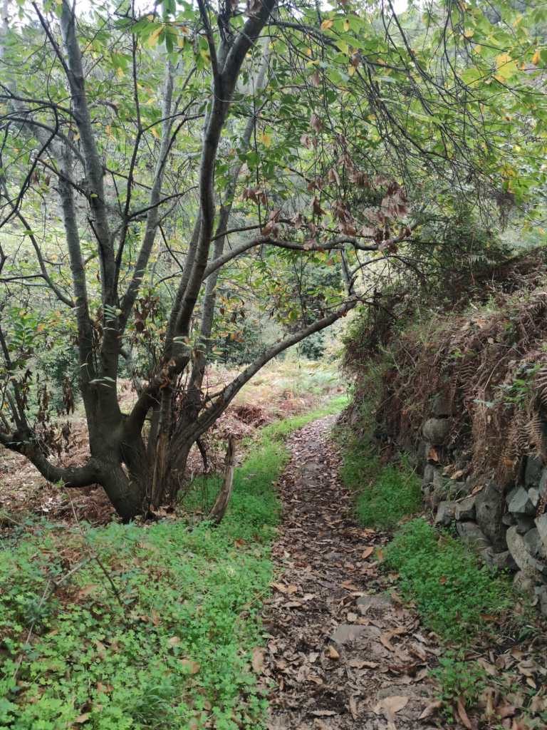 Nos despedimos de este impresionante árbol, un lugar para hacer una parada y recuperar energía para continuar el sendero descendiendo. Un sendero que se vuelve zizageante hasta cruzar el lecho del barranco y que nos adentrará en un impresiónate bosque de castaños. El verde brillante de este bosque, da paso al marrón de las hojas caducas de los castaños, que hacen una fantástica alfombra de hojas para cubrir nuestro sendero. Impresionantes ejemplares, que todavía hoy se aprovechan sus frutos pese a lo recóndito y escarpado del lugar.