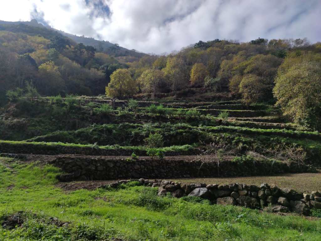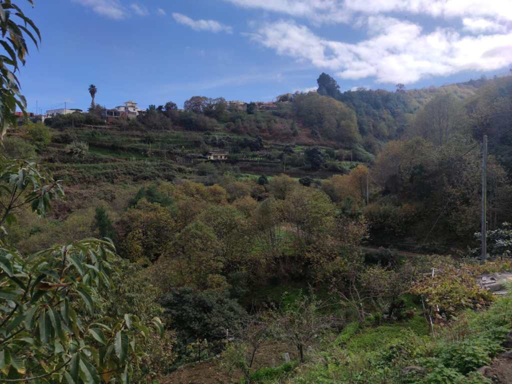 Pasaremos de los castaños a un paisaje donde predominan los cultivos y las zonas de bancales hasta llegar a una pista agrícola, señal de que ya estamos entrando en zonas mas habitadas. Transitaremos por las confluencias de estos barrancos como el de Godinez o Lora hasta dar a las primeras casas que nos dicen que ya hemos llegado al Realejo Alto.