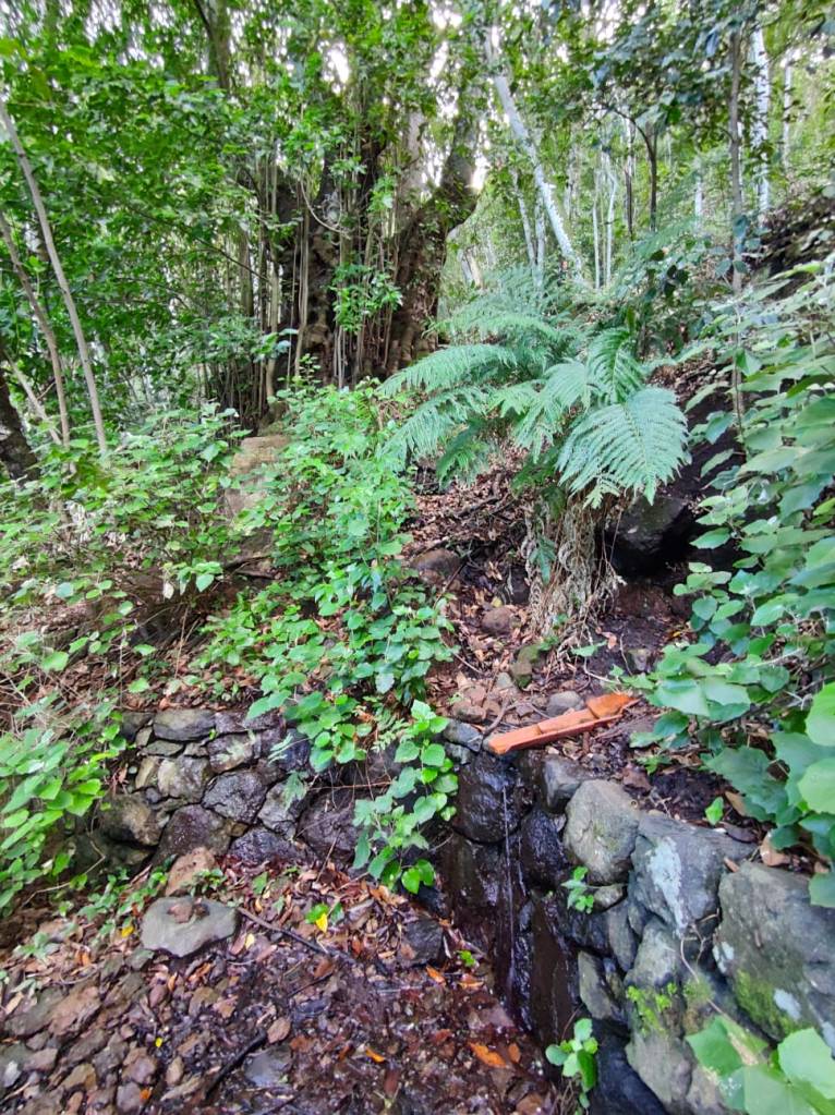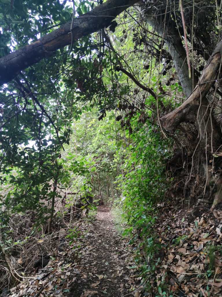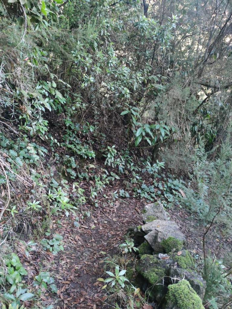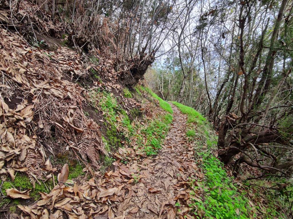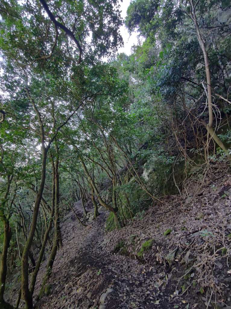 Un camino en esta primera parte muy cómodo y amplio, que poco a poco se irá estrechando para meternos de lleno en un impresionante bosque de laurisilva. En unos minutos, este sendero se vuelve un poco resbaladizo donde se encajona un poco, para pasar luego a un tramo que discurre por un afloramiento rocoso y mas tarde adentrarnos en un auténtico bosque de Fayal-Brezal. El descenso es continuo y los tramos mas sinuosos se combinan con otros mas resbaladizos y rectos, incluso hay algunos trechos reforzados con escalones de madera para facilitar el paso.