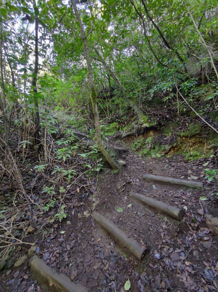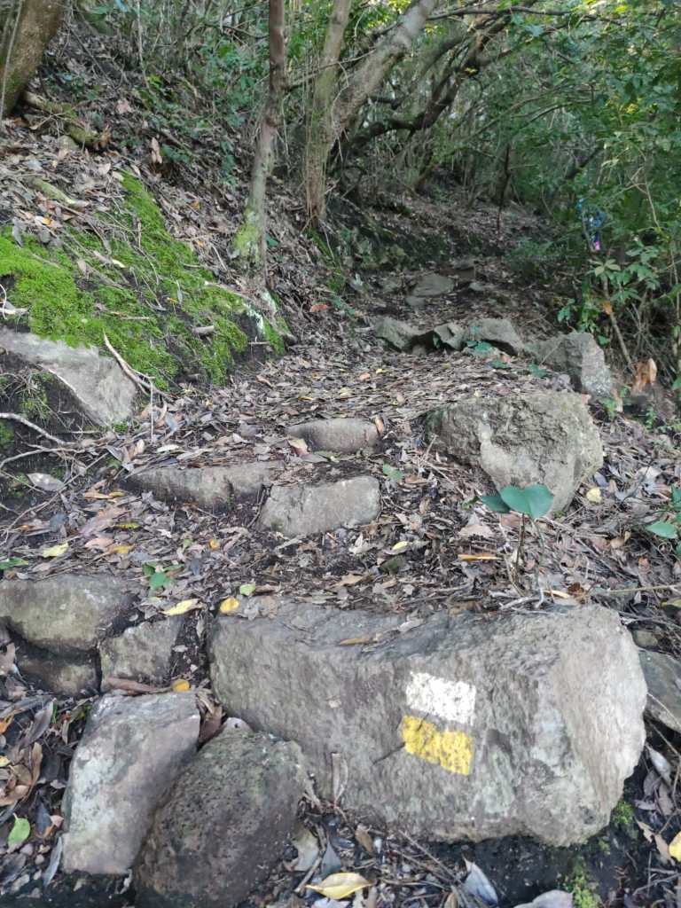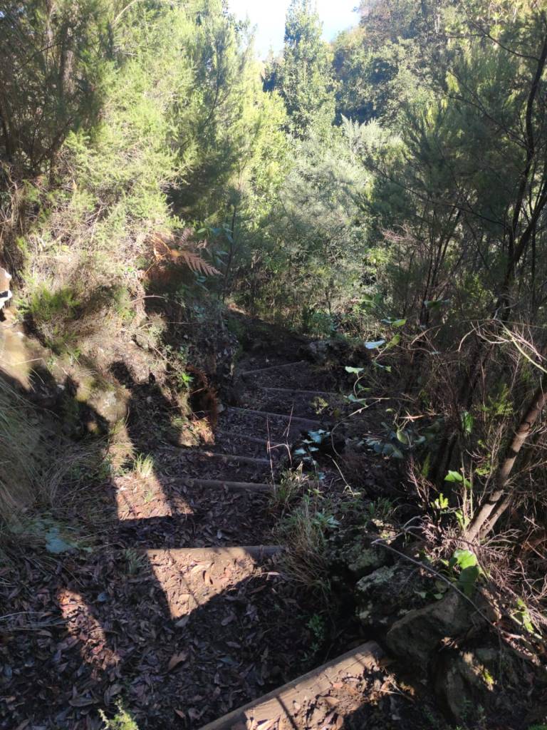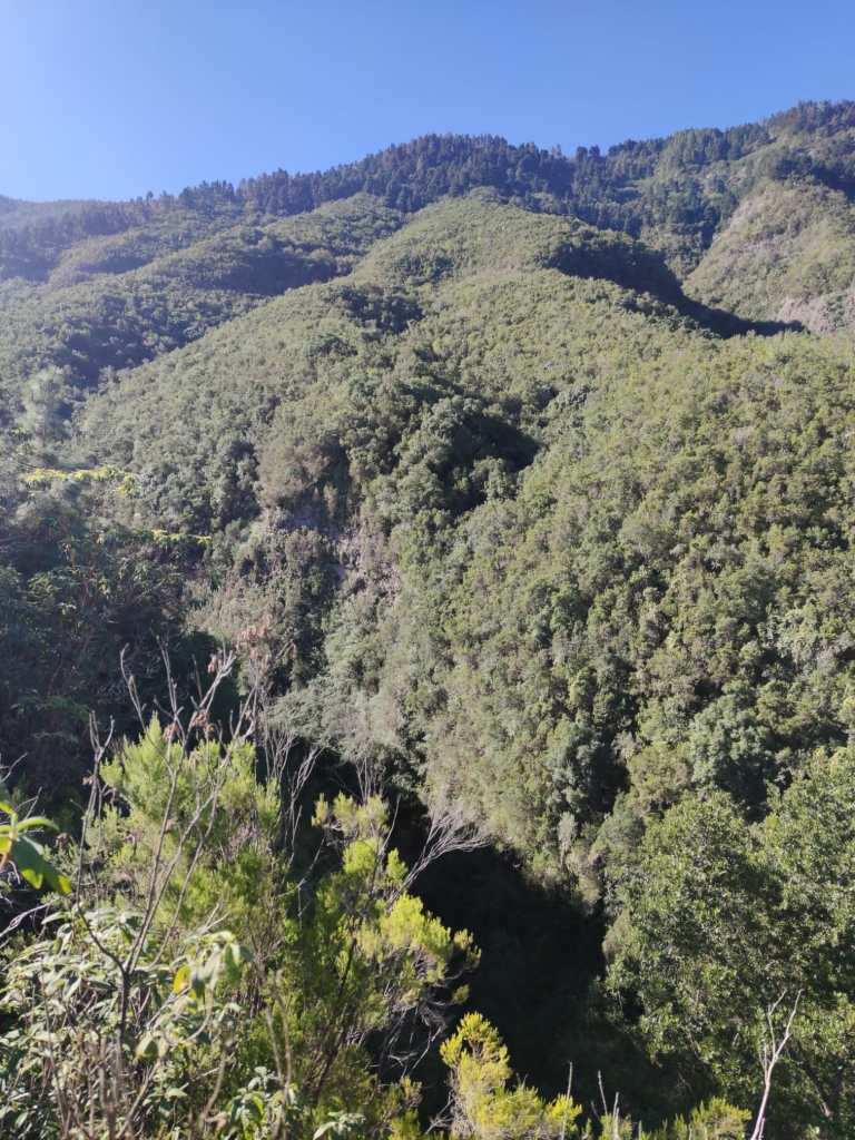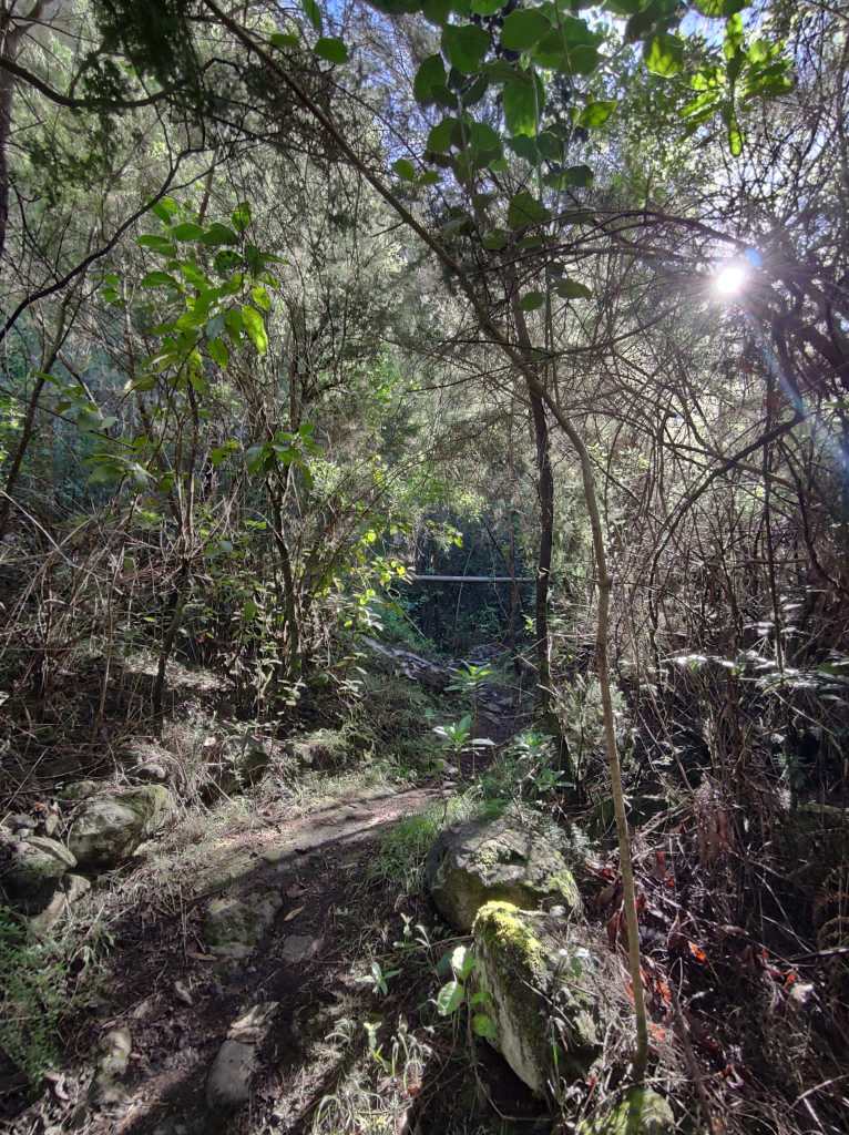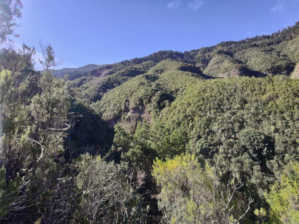 Un camino en esta primera parte muy cómodo y amplio, que poco a poco se irá estrechando para meternos de lleno en un impresionante bosque de laurisilva. En unos minutos, este sendero se vuelve un poco resbaladizo donde se encajona un poco, para pasar luego a un tramo que discurre por un afloramiento rocoso y mas tarde adentrarnos en un auténtico bosque de Fayal-Brezal. El descenso es continuo y los tramos mas sinuosos se combinan con otros mas resbaladizos y rectos, incluso hay algunos trechos reforzados con escalones de madera para facilitar el paso.