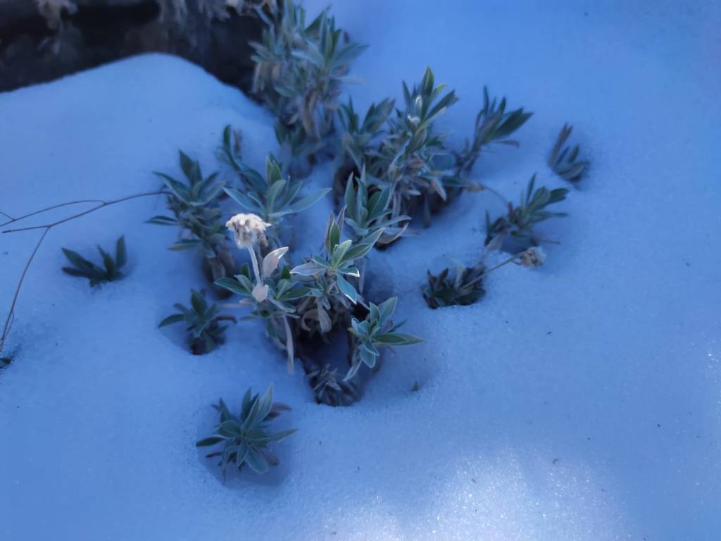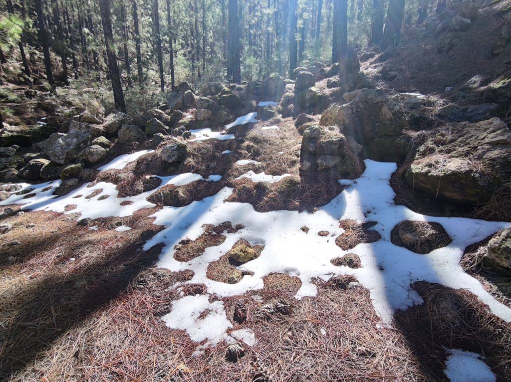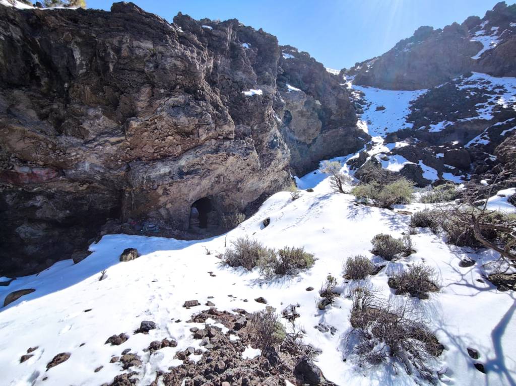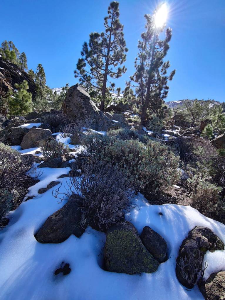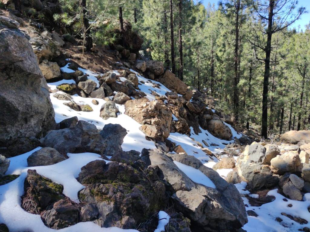 Por un lado tenemos el Pico Cabras, por otro lado, la majestuosa cara norte de la montaña más alta de España. Estar frente a esta colosal elevación de terreno nos da una idea de lo grandioso de este edificio volcánico. Un contraste que en estos días se cubre con un manto de nieve, casi ya derretida pero que además nos deja ver los contrastes de lava marrón casi negra de las laderas, con los colores marrones más claros de las montañas de piedra pómez. Por todo este lugar están presente los materiales pumíticos ( por la Hoya de Abruncos,…) y fonolíticos que pertenecen a la serie Cañadas Inferior.
