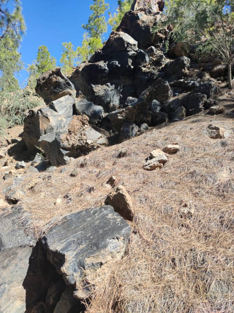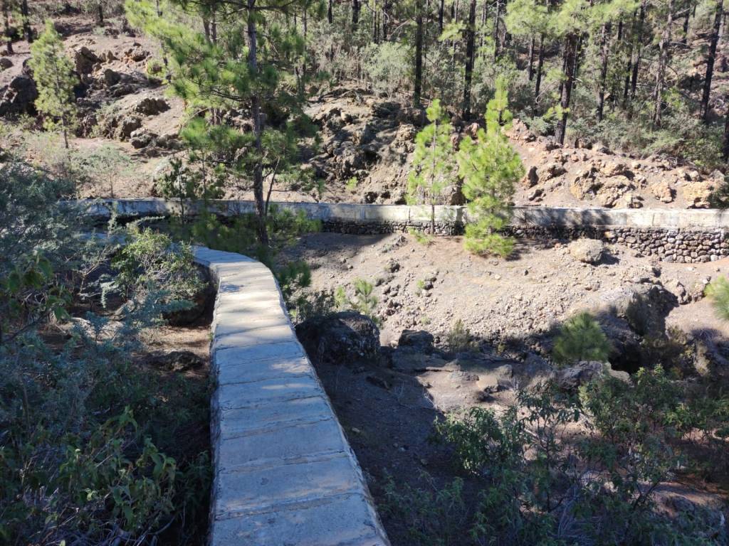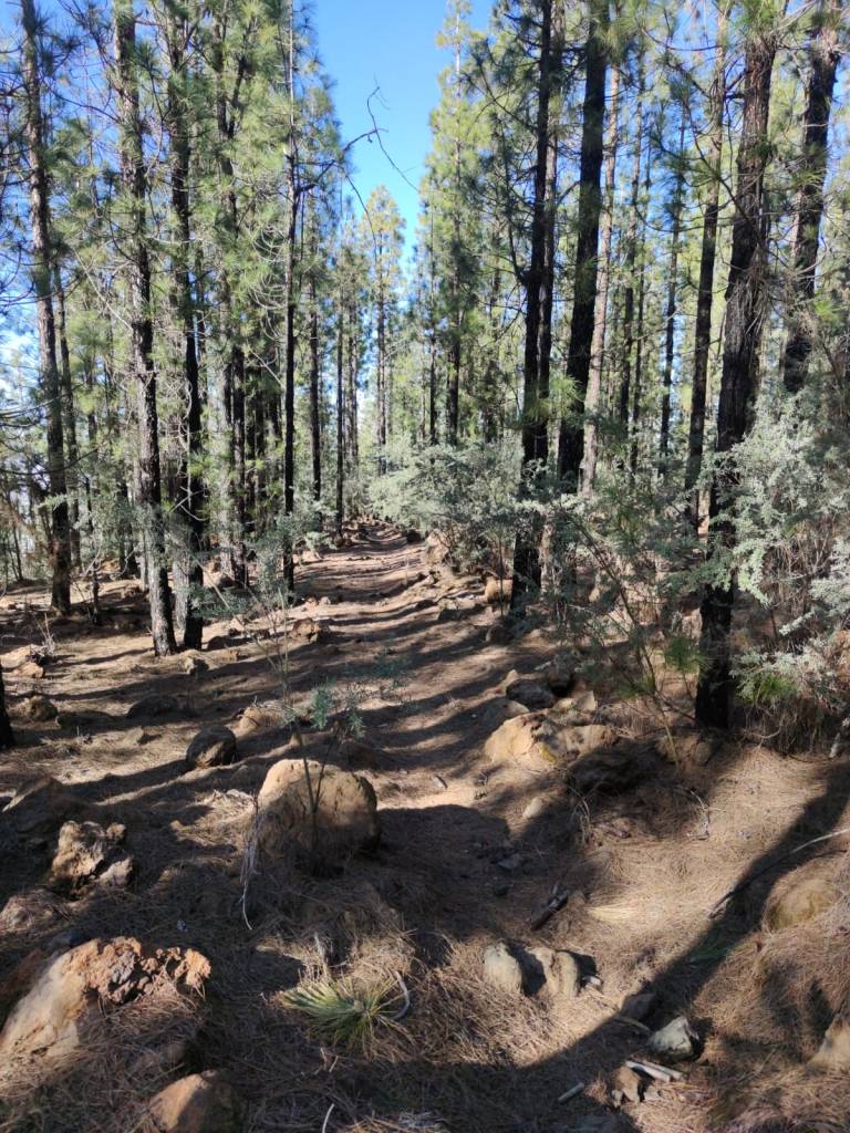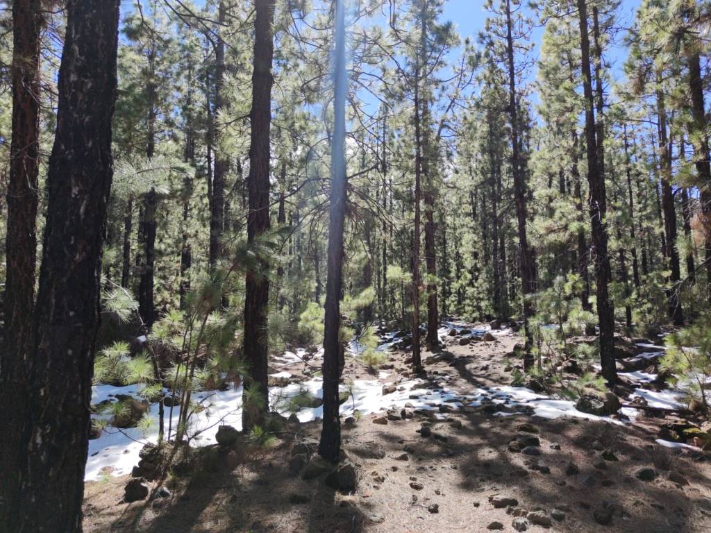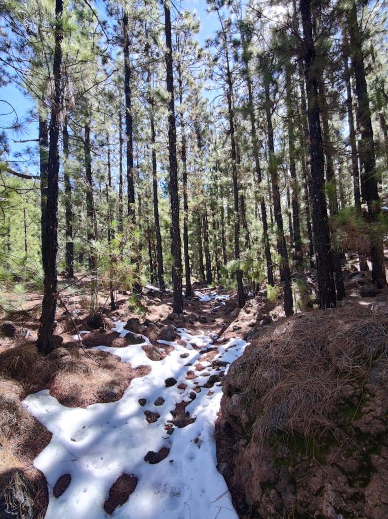 A partir de este lugar, empieza nuestro sendero propiamente dicho. Una continuada subida nos conduce entre pinos hacia la ladera de El Teide. Este sendero de accesión continua, cuenta con lugares de gran desnivel en los que nos tenemos que emplear a fondo para vencer la altitud. Senderos de piedra, antiguas trochas para desplazarse, todo ello entre pinos canarios, verdes copas y el sol adentrándose entre sus hojas.
