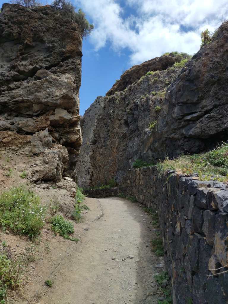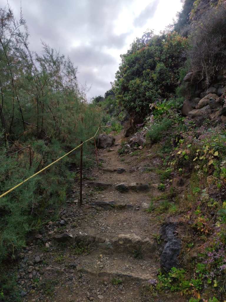 Un Camino Real que facilito el transporte de mercancías y productos, y que hoy en día se conserva en muchos de sus tramos, casi como si el tiempo se hubiera detenido por completo. A medida que avanzamos por el sendero nos encontraremos con poblaciones de tarajales, cañas, piteras, así como bancales de papas y plataneras a ambos lados del sendero. Esta primera parte del recorrido termina en el Barranco Ruiz desde donde tenemos la posibilidad de observar las preciosas vistas que ofrece la desembocadura de dicho barranco.