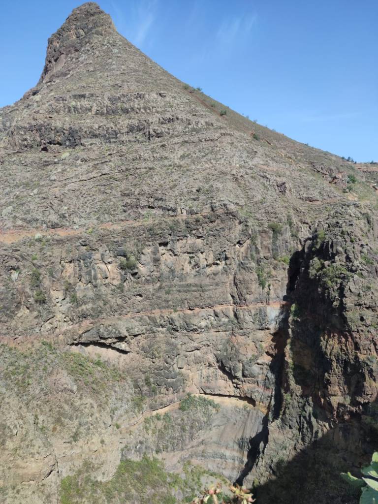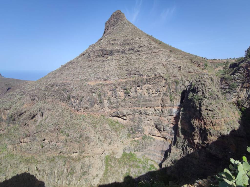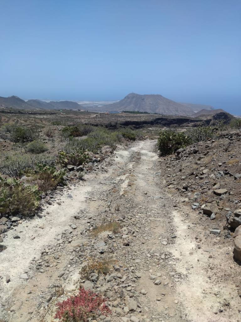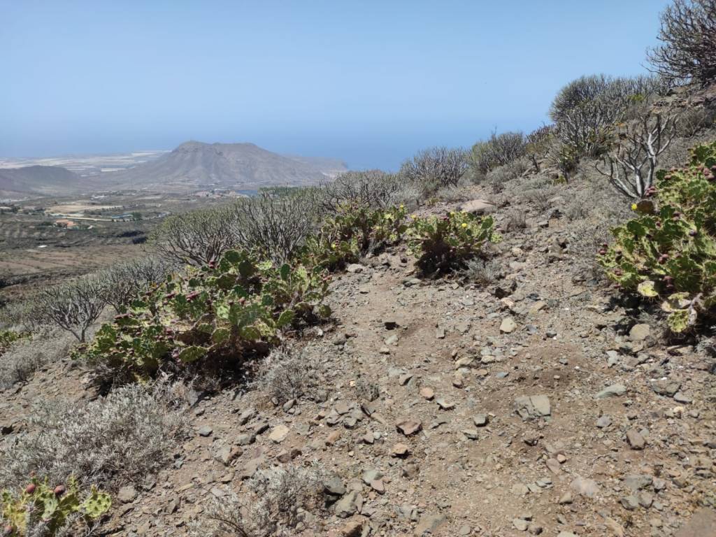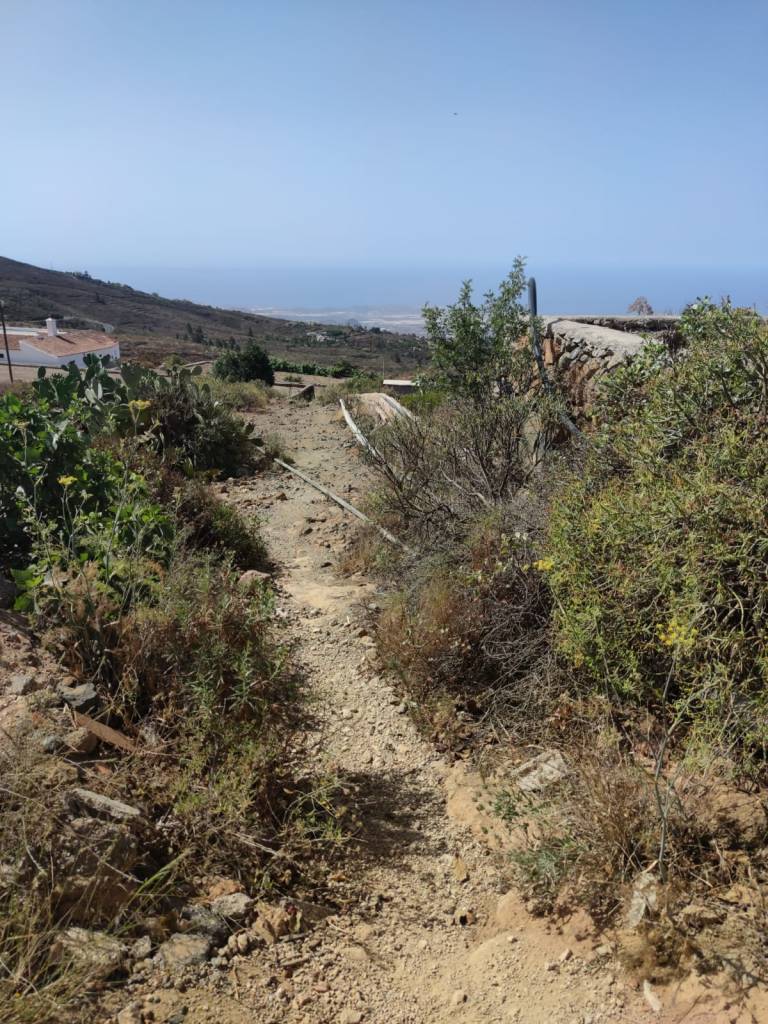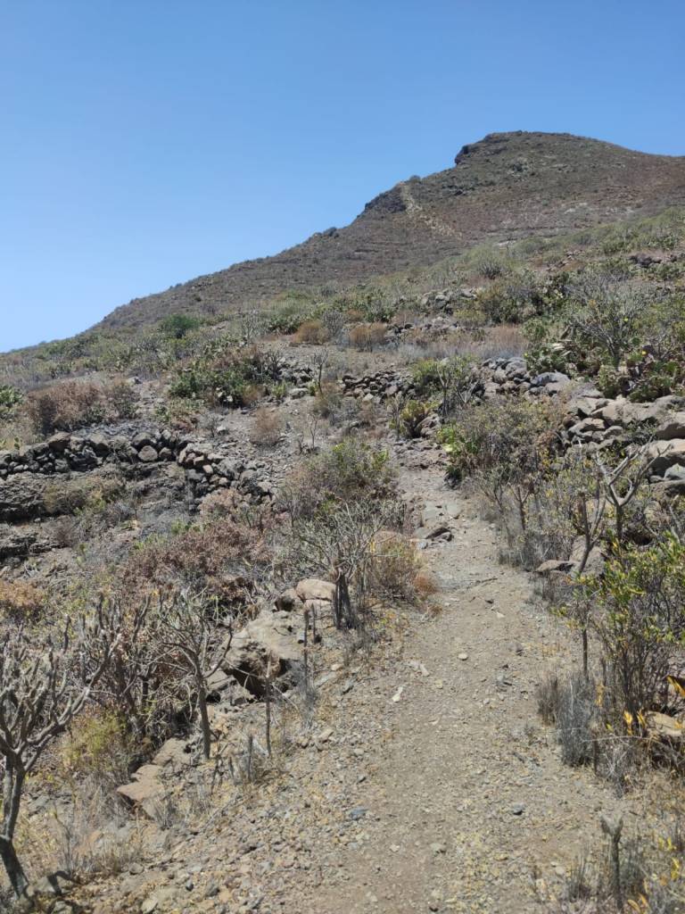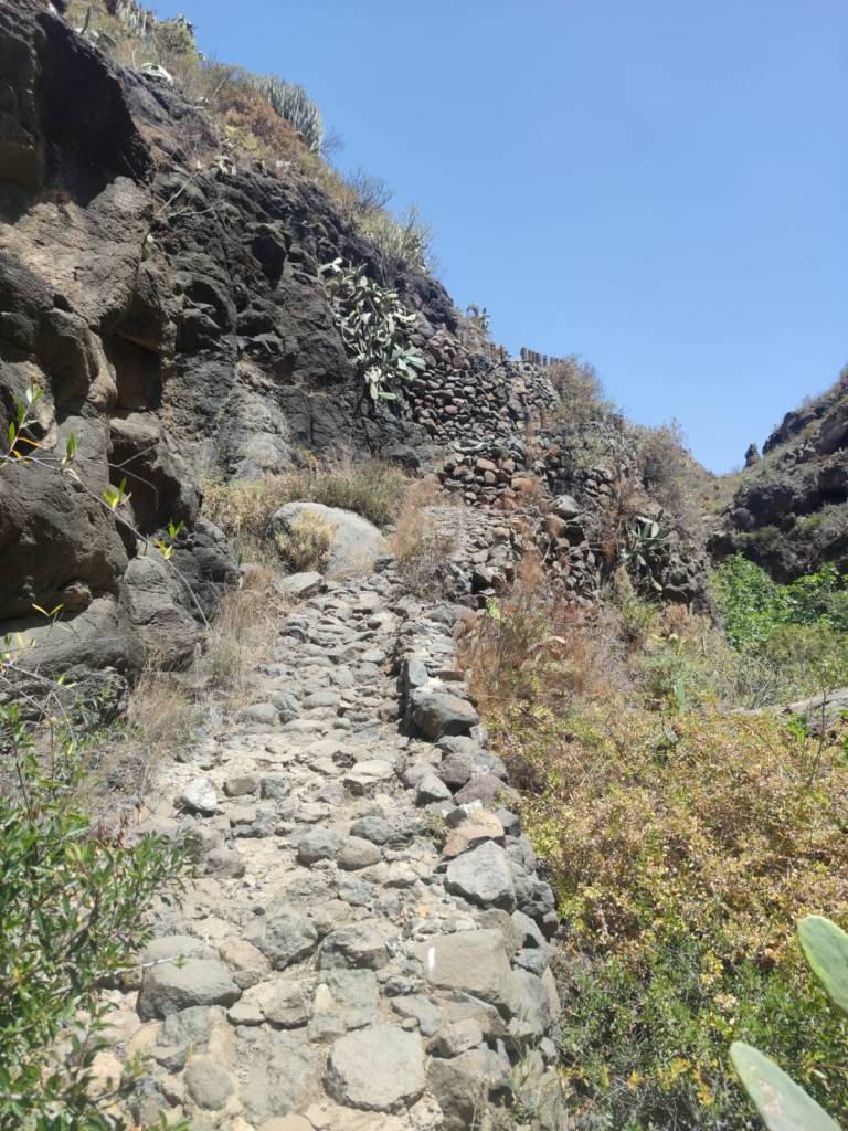 Desde este punto el sendero se pierde un poco, hay que estar atento a los mojones que hay en el camino o bien seguir el track porque durante un buen trayecto iremos dando la vuelta a la ladera por los bancales de antiguas huertas de cultivo, que hoy están en desuso. Después de atravesar esta zona llegamos a lo que se conoce como las vueltas de Adeje. Un antiguo camino que en su dia estaba empedrado, pero que a dia de hoy y gracias a su nula conservación este se esta perdiendo, y muchos de sus tramos faltan piedras e incluso hay que tener cuidado para no caerse.
