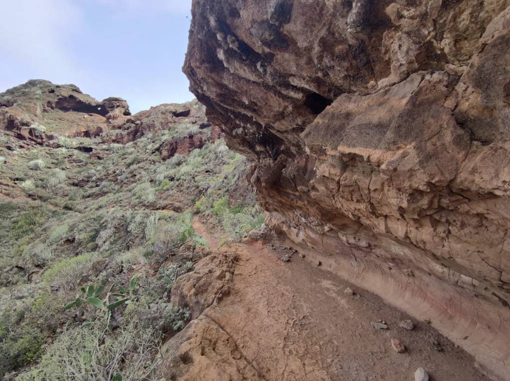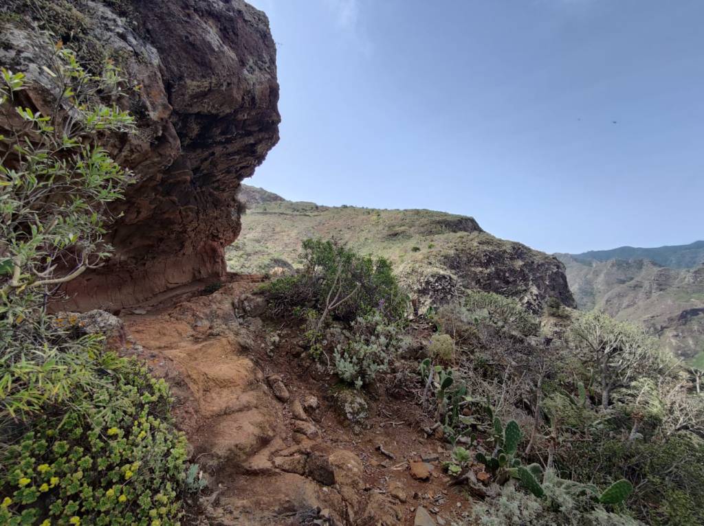 Tras un increíble esfuerzo logramos divisar a lo lejos el Roque de los Pinos, señal de que nos acercamos a Chinamada. Un camino de almagre, tierras rojizas, vetas y pasos vertiginosos por las laderas escarpadas que nos brinda unas increíbles panorámicas de esta parte de la Isla.