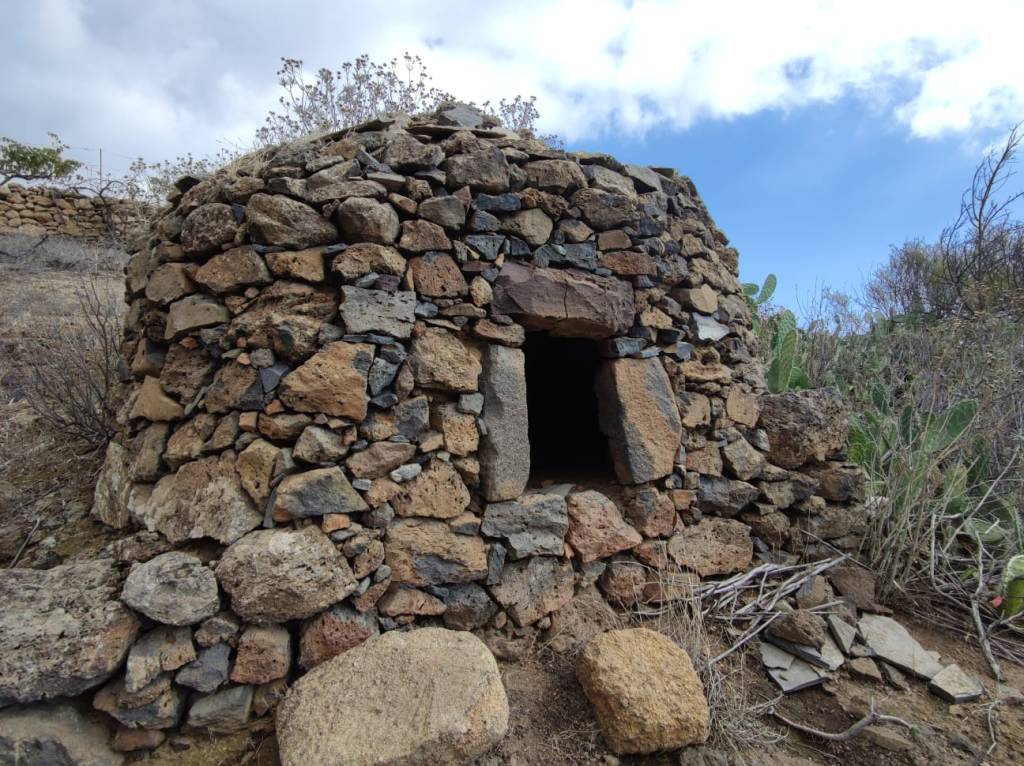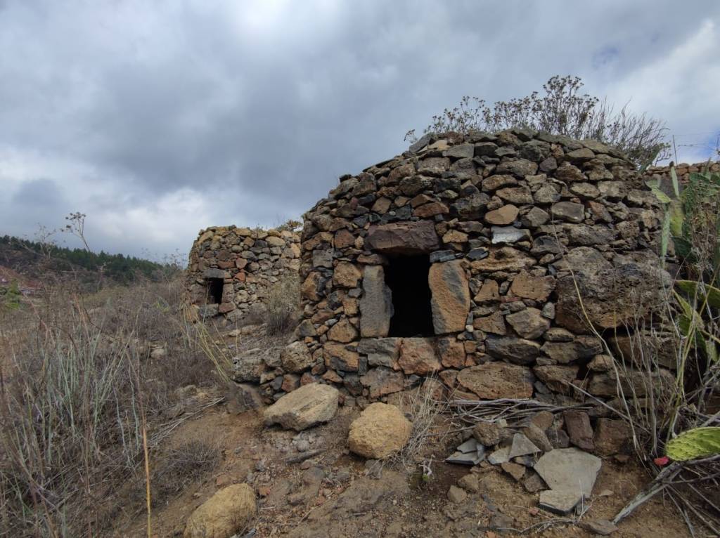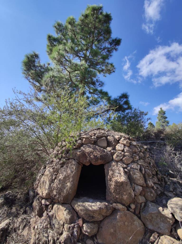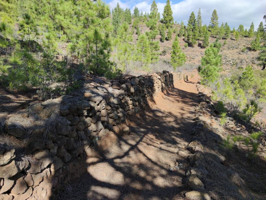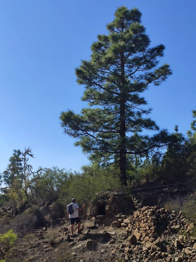 Dejamos este sendero para tomar una pista que viene desde la cumbre, por la que iremos descendiendo paralelos al barranco de Las Lajas, un espectacular corte que nos brinda unas vistas de toda la masa forestal y el mar al fondo con toda la ladera. En esta zona empezamos a ver lo que antiguamente eran campos de cultivos y los primeros restos de esta actividad. Ruinas de casas terreras, antiguas eras en las que se aventaba el cereal y bancales donde un terreno en pendiente, mediante bancales y muros de piedra, se conseguía un lugar para cultivar.