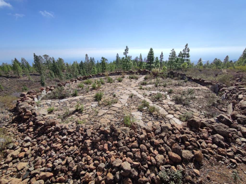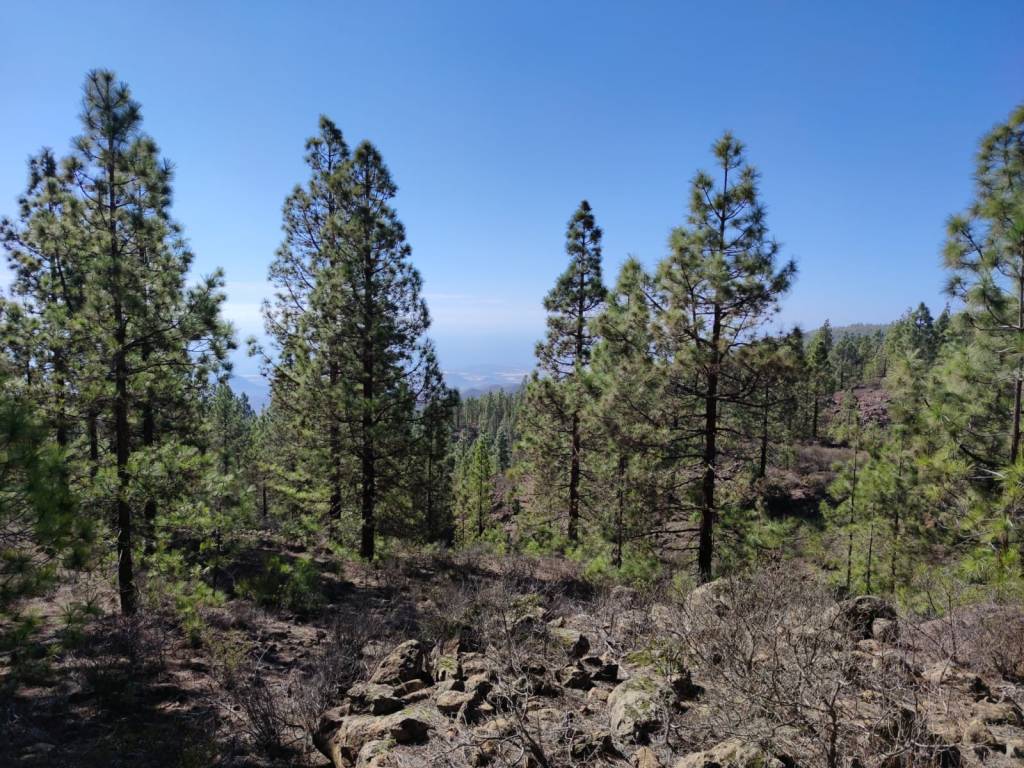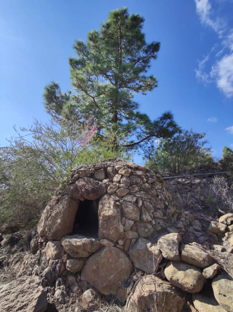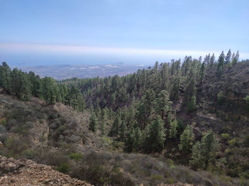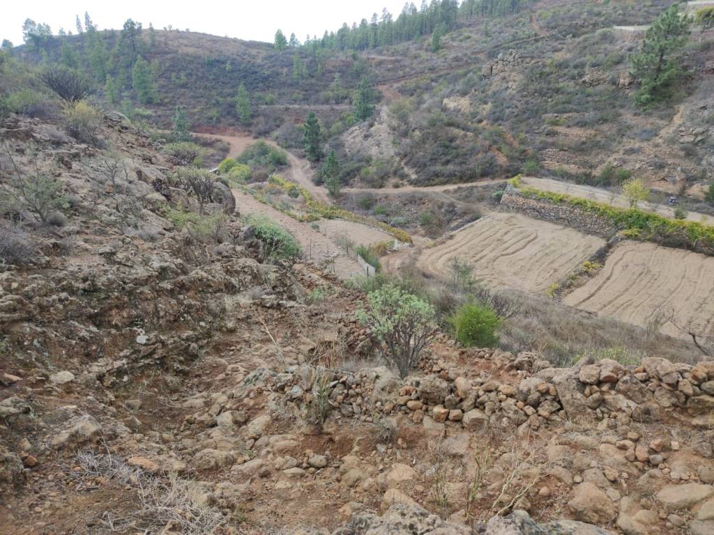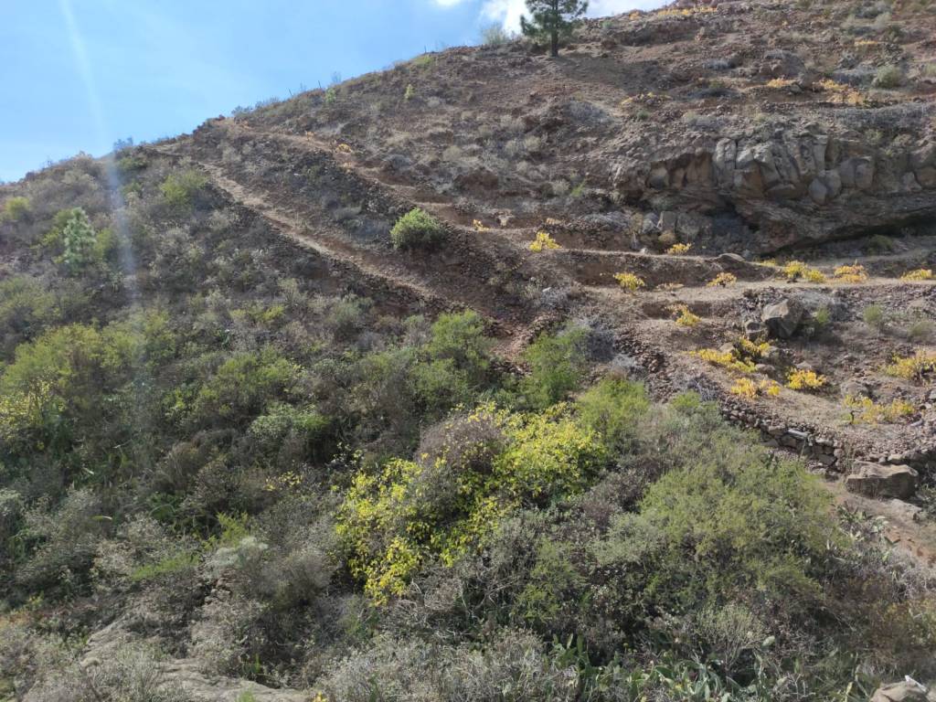 Dejamos este sendero para tomar una pista que viene desde la cumbre, por la que iremos descendiendo paralelos al barranco de Las Lajas, un espectacular corte que nos brinda unas vistas de toda la masa forestal y el mar al fondo con toda la ladera. En esta zona empezamos a ver lo que antiguamente eran campos de cultivos y los primeros restos de esta actividad. Ruinas de casas terreras, antiguas eras en las que se aventaba el cereal y bancales donde un terreno en pendiente, mediante bancales y muros de piedra, se conseguía un lugar para cultivar.