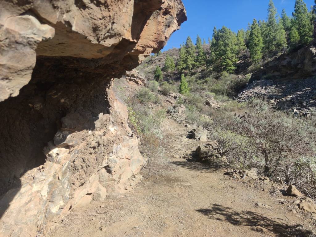 Un camino muy bien conservado que nos conduce serpenteante por la ladera a cruzar una serie de barrancos entre pinos jóvenes repoblados hace tiempo dentro de un paraje llamado «Las Lajas». Y es que el nombre ya nos indica lo que nos vamos a encontrar, un terreno donde las rocas están en forma de lajas, y durante mucho tiempo se obtuvo mediante explotaciones de canteras este material para la construcción, y que hoy en dia, ya abandonadas vemos algunas en nuestro recorrido y como se trabajó la pared de piedra para su extracción.