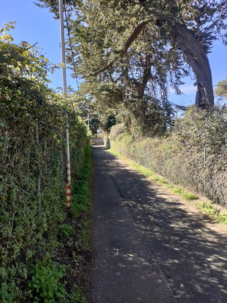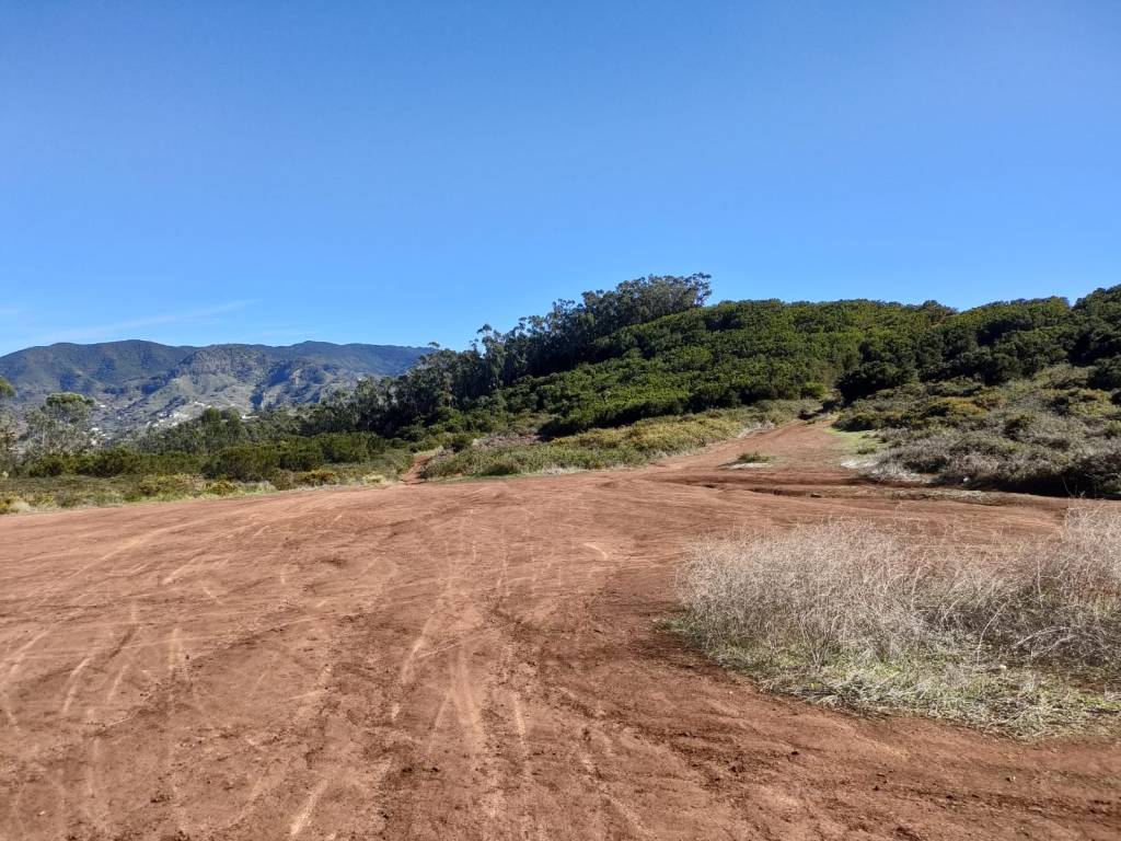 Justo por la parte de abajo buscaremos un sendero que nos va a llevar a recorrer bordeando toda la montaña, sin perder de vista en ningún momento la ciudad de La Laguna. Una vez pasado toda esta zona de Mesa Mota nos adentramos en un bosque de eucaliptos donde por sendas y caminos, muchos de ellos de tierra rojiza y barro por el paso de motos, iremos sorteando las montañas de La Bandera y de La Atalaya hasta llegar por el Camino del Pulpito a las zonas de cuadras de caballos justo enfrente del aeropuerto de Los Rodeos.