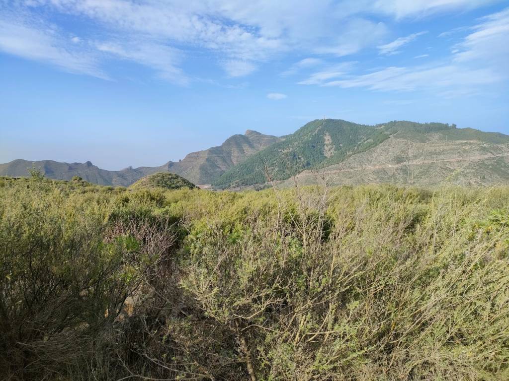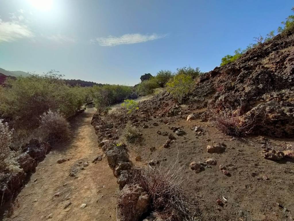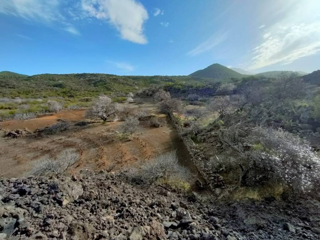 Una vez sorteado este obstáculo, nos encontramos sobre la cabecera del Valle de Santiago, donde se divisan también bajo el volcán los pueblos de Las Manchas, Santiago del Teide y El Molledo, acompañadas de las bellas siluetas de los escarpes del Macizo de Teno, como el Risco Blanco, Montaña de Arguayo. Volvemos a tomar un pequeño sendero en que ya enfilaremos de nuevo la vuelta entre almendreros y antiguas huertas de cultivo para llegar de nuevo a la ermita que habíamos visitado anteriormente.
