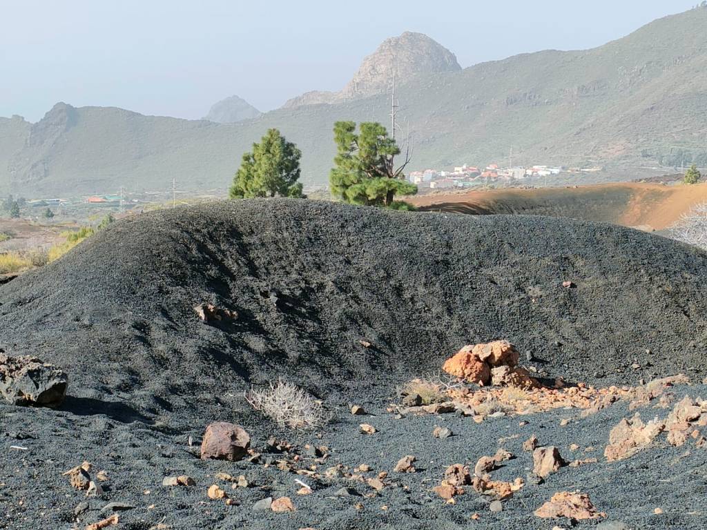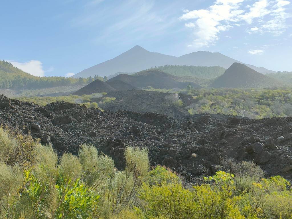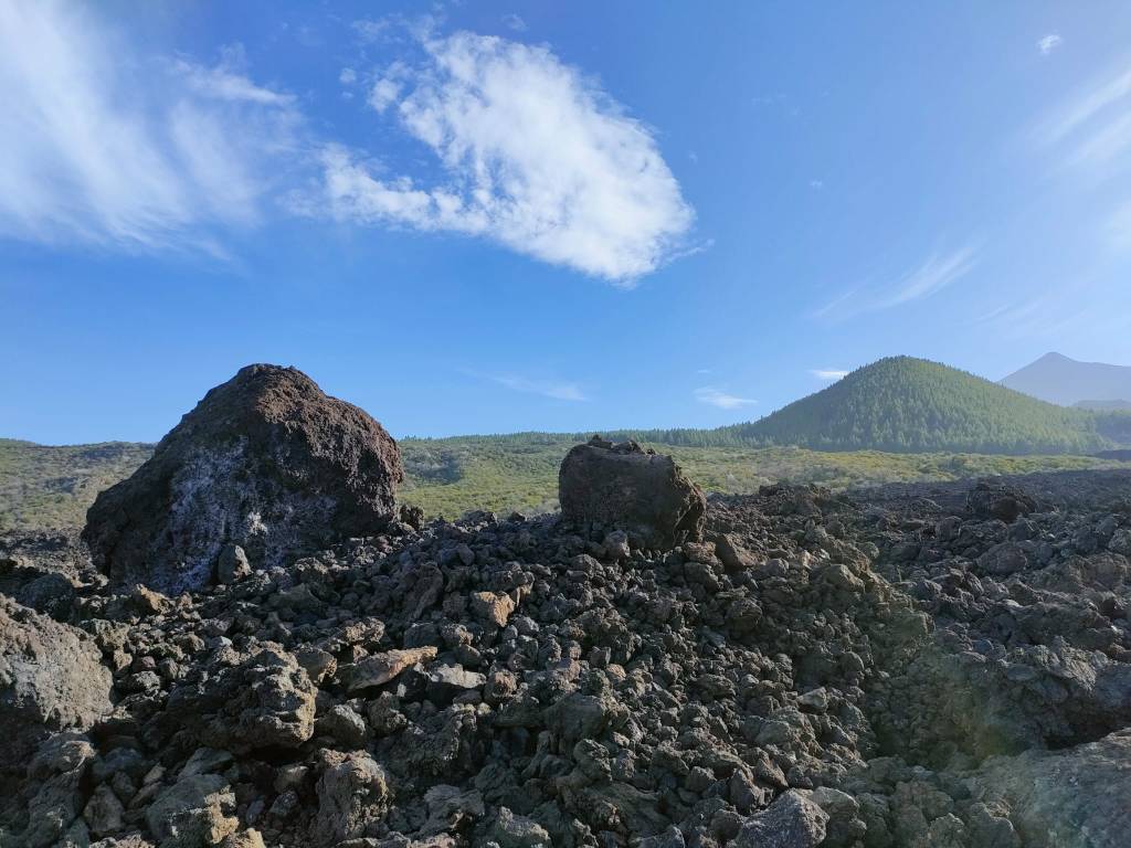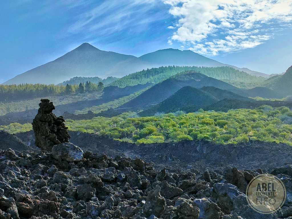 A los pies de esta colada de lava, uno siente esa emoción de ver la fuerza de un volcán, imaginándose lo que fue en tiempos lejanos esa erupción. Muy pronto el sendero nos invita a seguir adelante bordeando la montaña y nos concede la oportunidad de atravesar esta colada de lava, dando una imagen parecida a estar en otra planeta. Nos dirigimos en dirección a Arguayo. Detenerse en la mitad de este malpaís y observar el paisaje es algo que a nadie deja indiferente. Sus abruptas lavas negras mezcladas con el verde de los pinos y el azul del cielo, hacen un contraste de increíble belleza visual. A un lado el imponente edificio de la Montaña de Bilma, al otro lado, El Teide, Pico Viejo y Volcán Montaña Negra entre otros. El silencio y la tranquilidad nos acerca a unas de las mejores panorámicas de esta ruta.