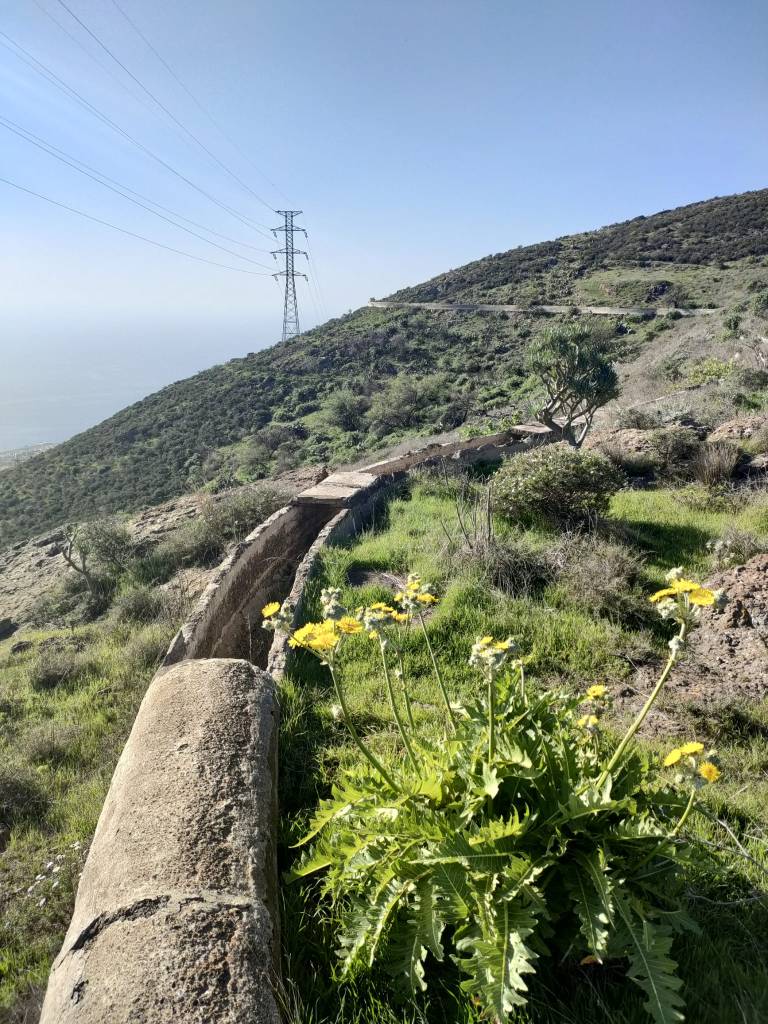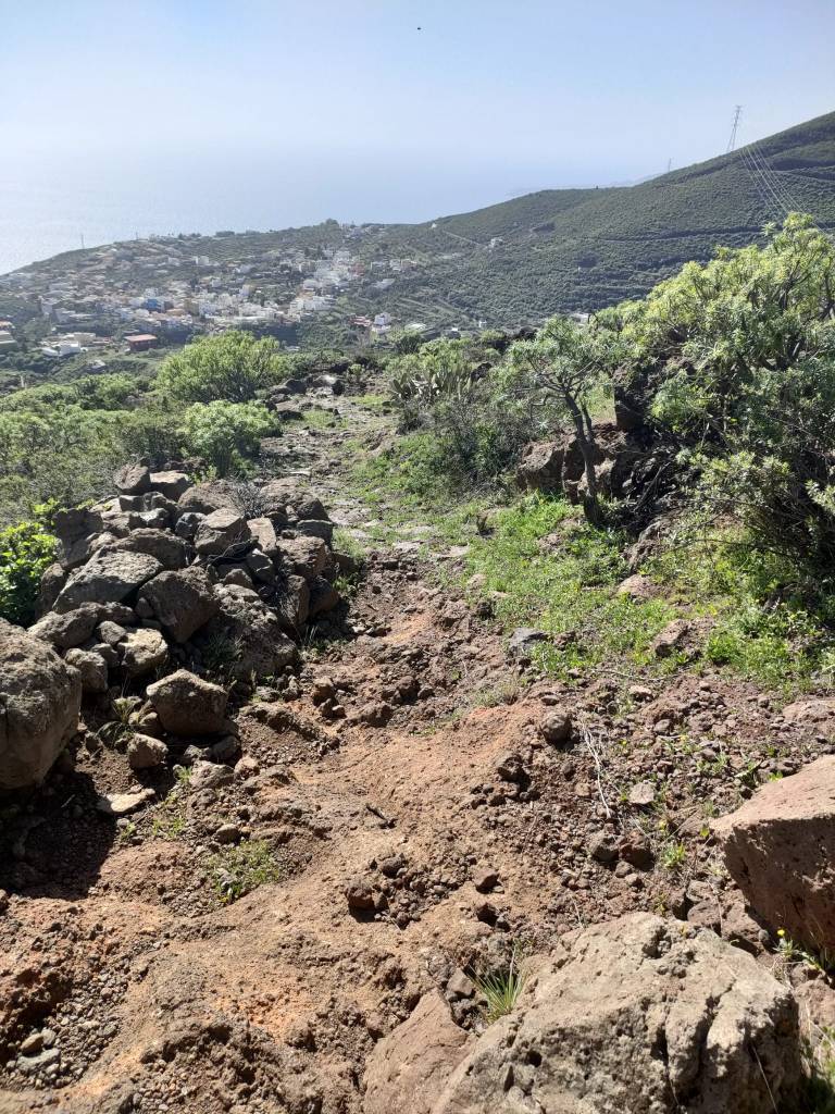 El camino en sus primeros metros discurre por una vereda junto al muro que delimita la finca de la casa de los Mesa, mas conocida como la casa de Amaro Pargo, todo esto a través de tabaibas amarga y jaras. Tras la primera parte de ascenso, que en algunos tramos se hace un poco tedioso debido a la gran cantidad de piedras sueltas que hay en el camino, cruzamos un barranquillo para fijar la vista en un antiguo canal ya en desuso, que nos servirá de referencia, y donde una pasaremos por una zona de piedras y que donde el camino lo han horadado literalmente en la piedra, para coronar la montaña de Las Mozas. Desde este punto, volvemos la vista atrás para disfrutar de unas estupendas vistas hacia la costa.