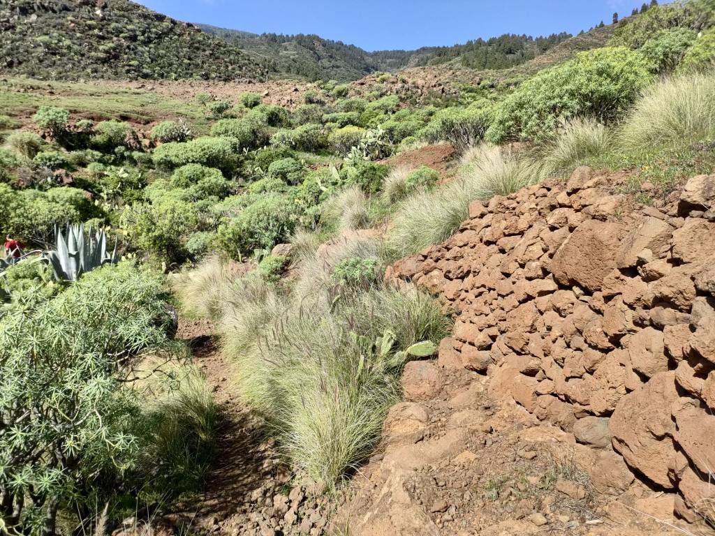 Este camino tradicional nos llevará descendiendo hasta Barranco Hondo , por lo que antaño fueron campos de cultivos y que hoy solamente quedan pequeñas praderas de florecillas con algún que otro almendrero, que cuando está florecido salpica de color el lugar. Además, observaremos la cantidad de muros de piedra o «barreras» que había para salvar la verticalidad del terreno y hacer estos campos de cultivos.