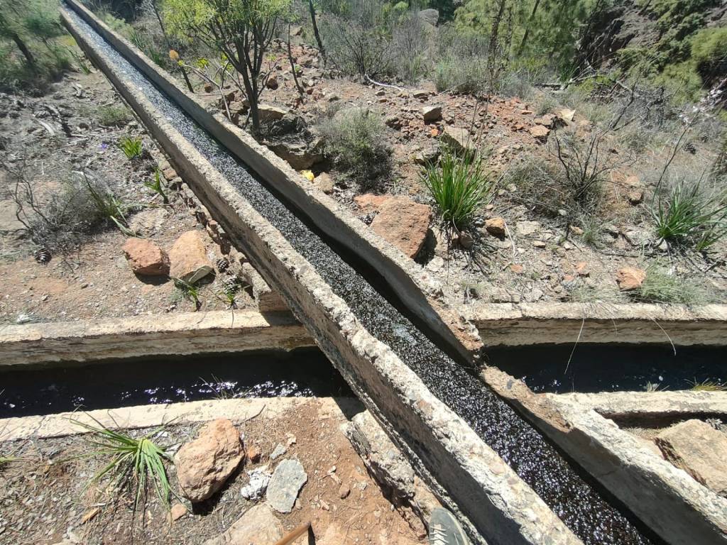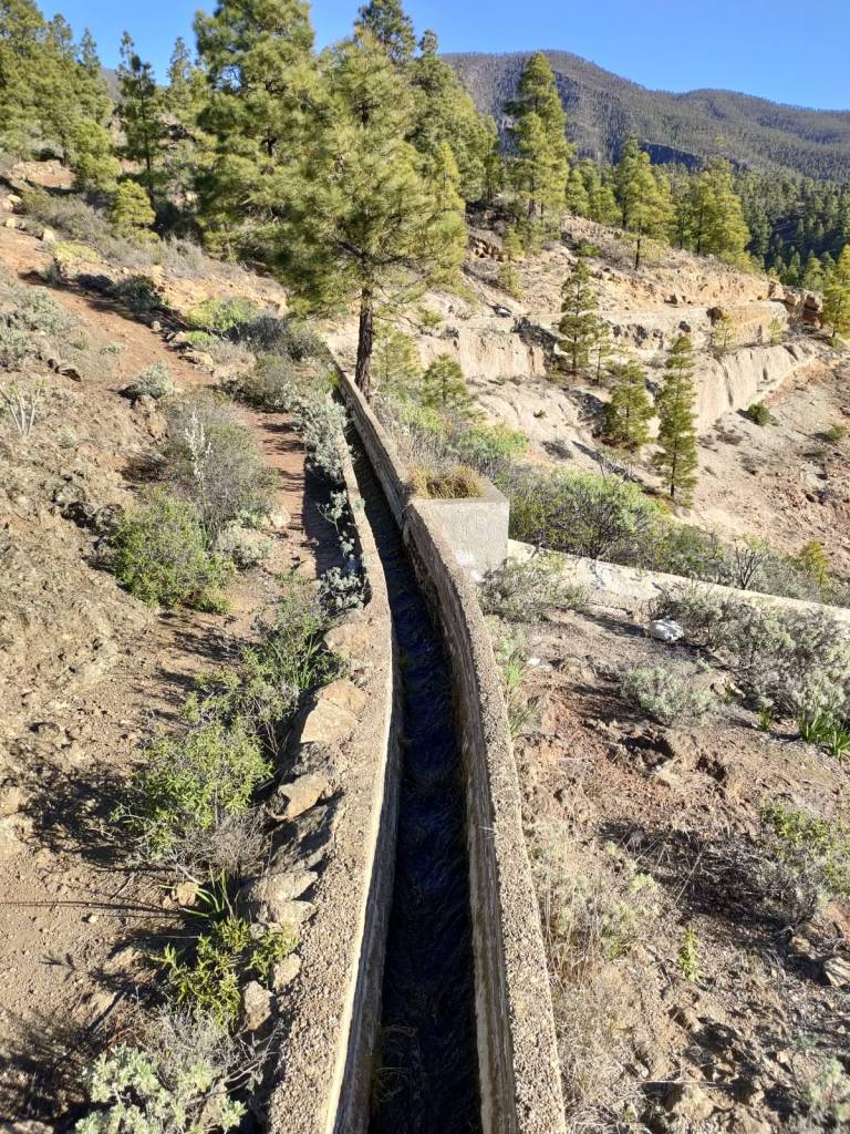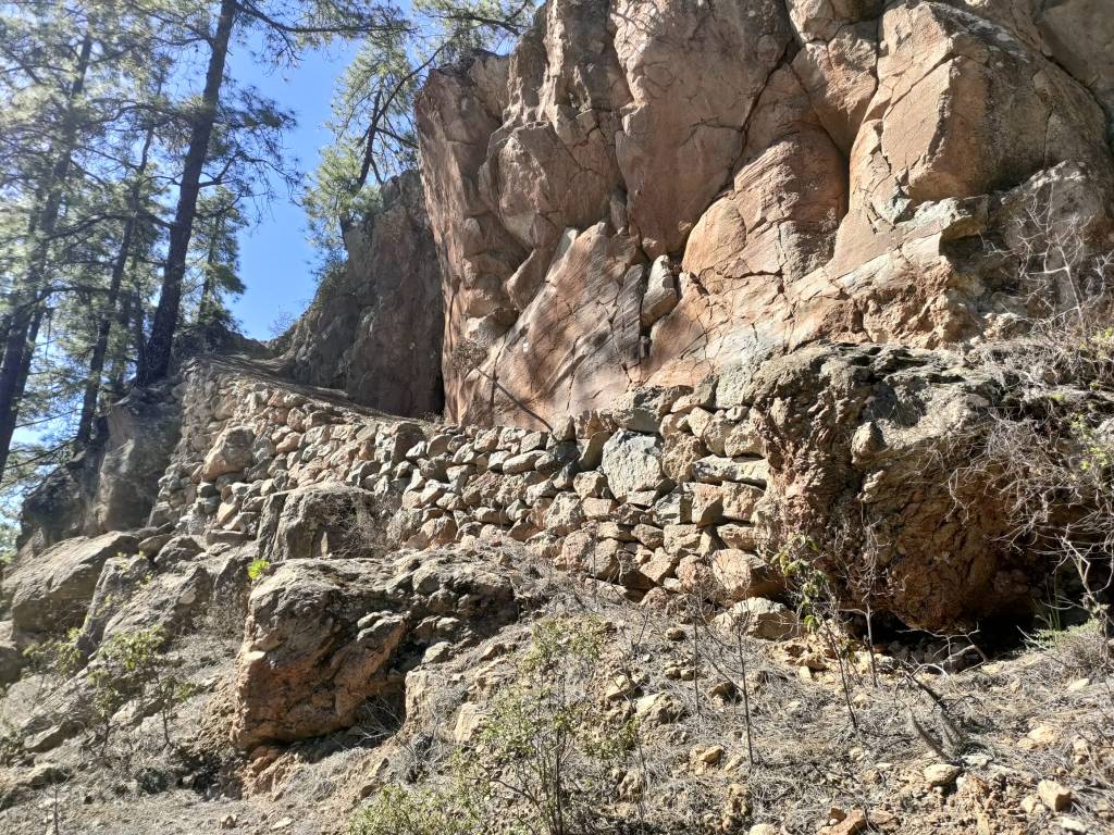 Un poco mas adelante nos desviamos a la derecha para tomar un alternativa a nuestra subida. Un camino paralelo al barranco que nos brinda unas vistas espectaculares de este gran tajo. El motivo de este «desvio» por este sendero, es el acercarnos hasta la galería Contador. Una antigua infraestructura de agua, metida en lo mas profundo del barranco Rio del Contador y donde podemos ver los antiguos cuartos de maquinas y estancias para hacer la vida, empotrados en las paredes del barranco.