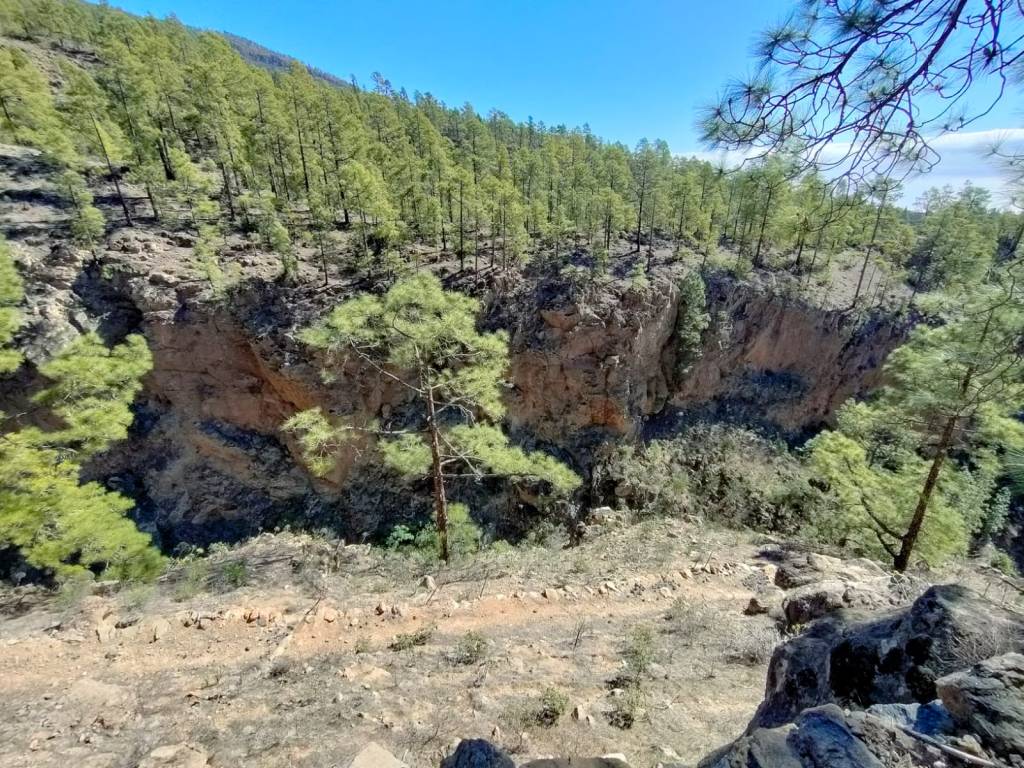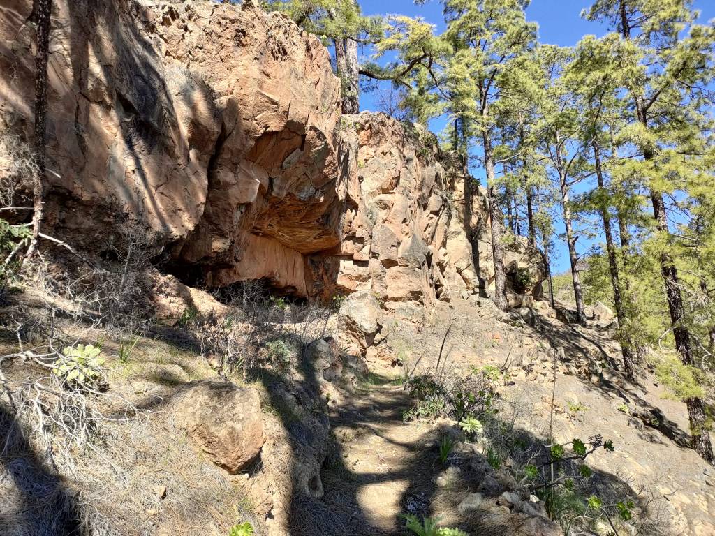 Desde el entorno de Ortiz, y la zona de escalada de La Puente, sale nuestro sendero. Siempre con la vista puesta al barranco de La Puente o también llamado Alabarderos. Empezamos a subir por un antiguo camino, que aunque esta bien indicado, es muy pedregoso, por lo que la ascensión se hace un poco mas tediosa en ciertos momentos. Esta primera parte del sendero subiremos por la Morra de Ortiz, que nos acercara a lo alto del Lomo Pina de La Linda donde tenemos unas espectaculares vistas de todo Arico hasta el mar. Un lugar ya metidos dentro de la Corona Forestal y donde empiezan a aparecer los primeros pinos. En nuestro ascenso disfrutaremos de uno de gran porte llamado Pino de Choya. Un lugar donde podemos tomar un poco de aliento para seguir con la ascensión.