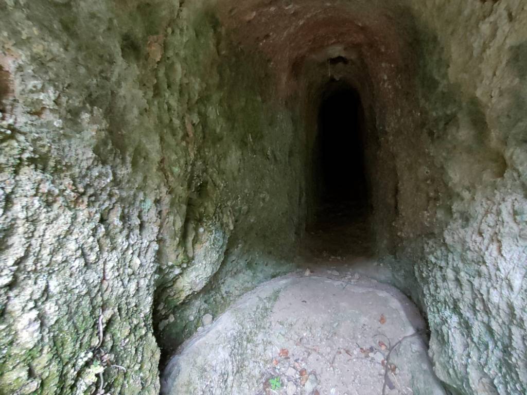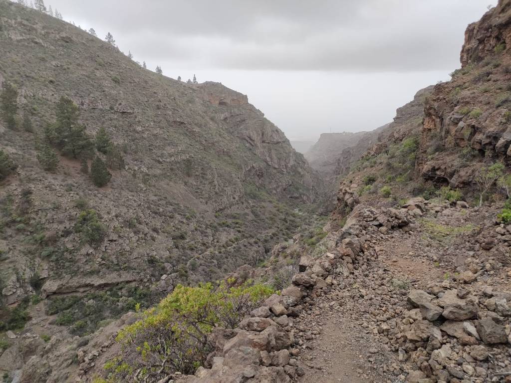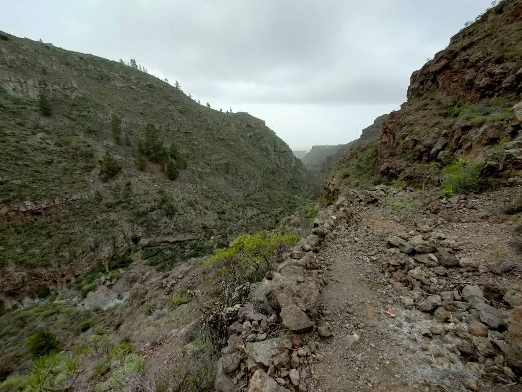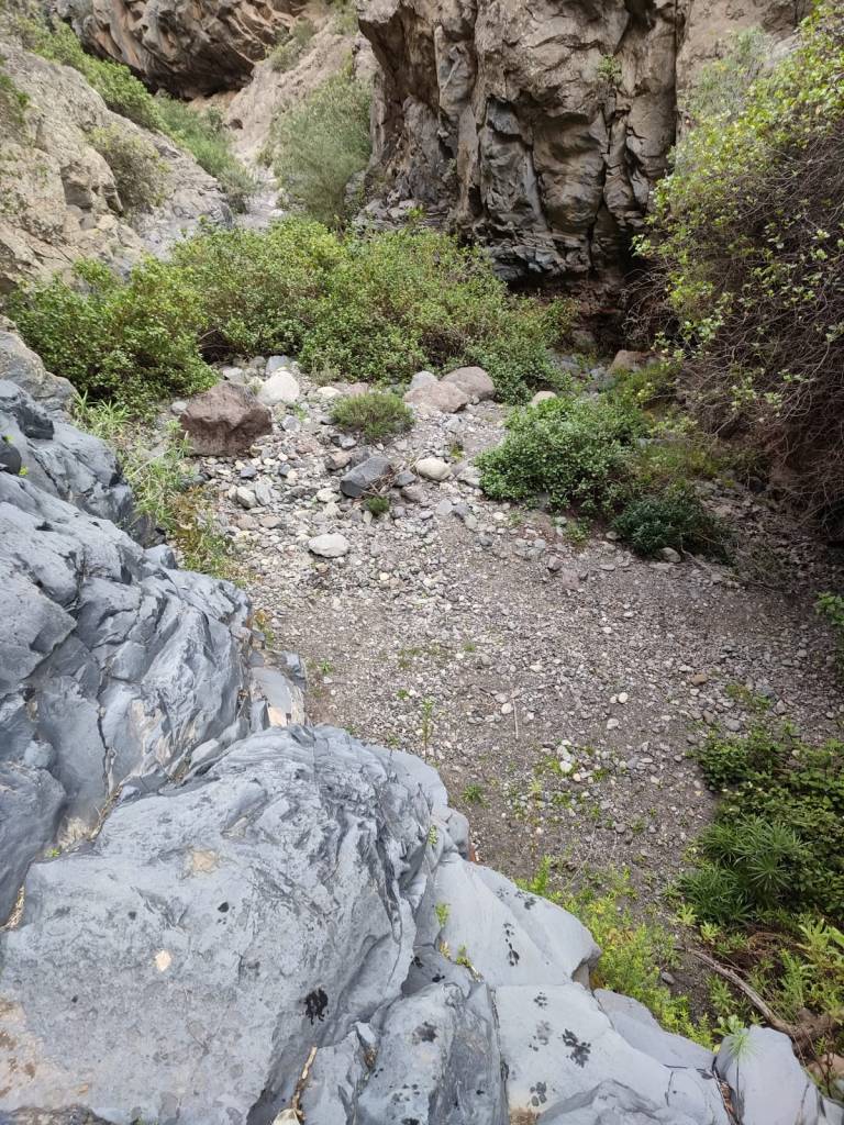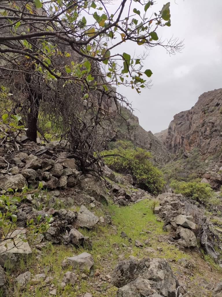 A pocos metros empieza un antiguo sendero que, discurriendo por el lateral de una de las paredes, casi sin darnos cuenta nos iremos metiendo entre las paredes de este barranco para alcanzar el fondo del cauce. Un camino empedrado que se utilizaba para cruzar de un lado a otro este importante accidente geomorfológico, y que a nosotros nos servirá para alcanzar el cauce. Lugar donde el barranco adquiere otra magnitud al verlo desde adentro. Las paredes parecen increíbles muros que, durante las primeras horas de la mañana el sol no accede al interior y hace que sea una zona sombría.