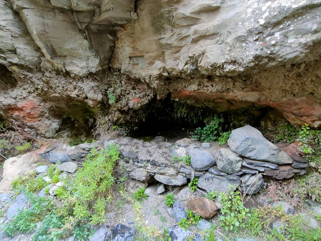 Una vez localizado este sendero, iremos recorriéndolo paralelos al barranco entre antiguos bancales y algún que otro almendro resistiendo a duras penas el paso del tiempo. Este sendero nos acerca hasta la siguiente parada, la fuente de las goteras. Un pequeño naciente con un recipiente en la pared para recoger el agua del interior y un pequeño bebedero a ras de suelo para dar de beber a los animales que antiguamente transitaban estos lares. Hoy en día como no esta muy usado ni muy frecuentado, la vegetación esta comiéndose parte de este lugar.