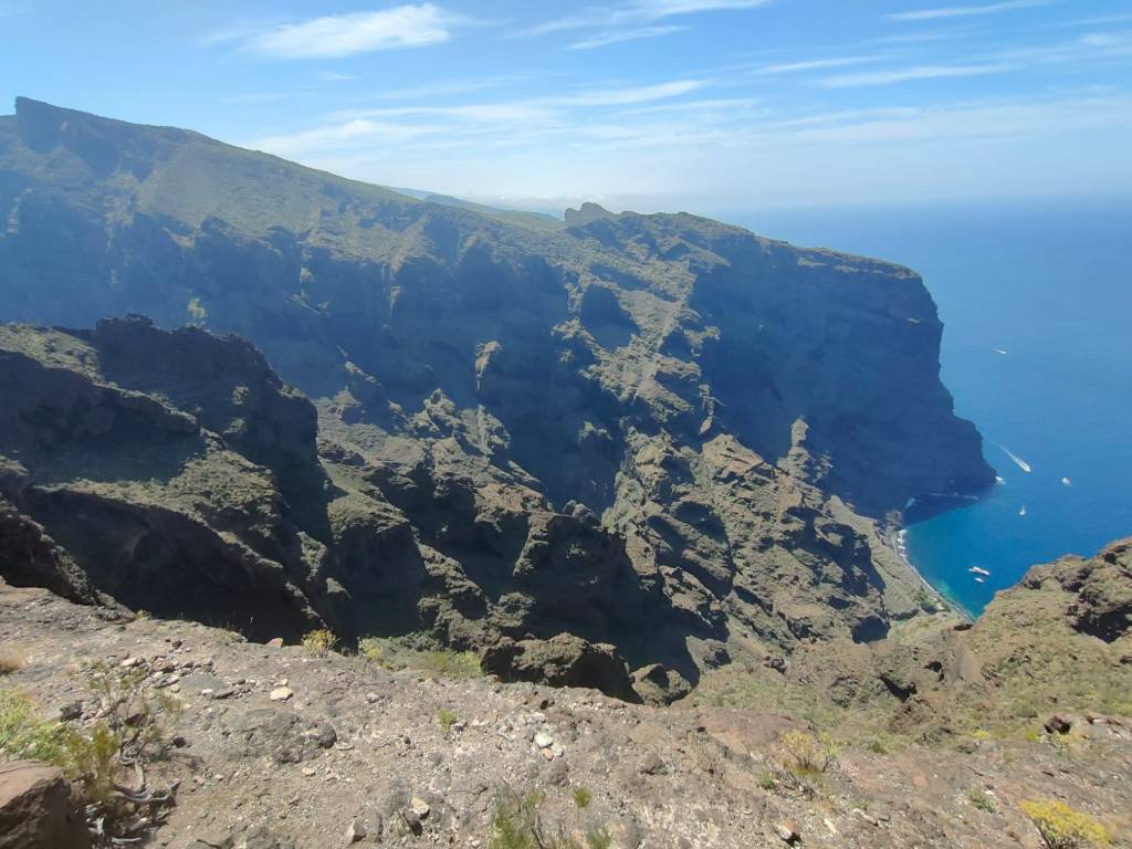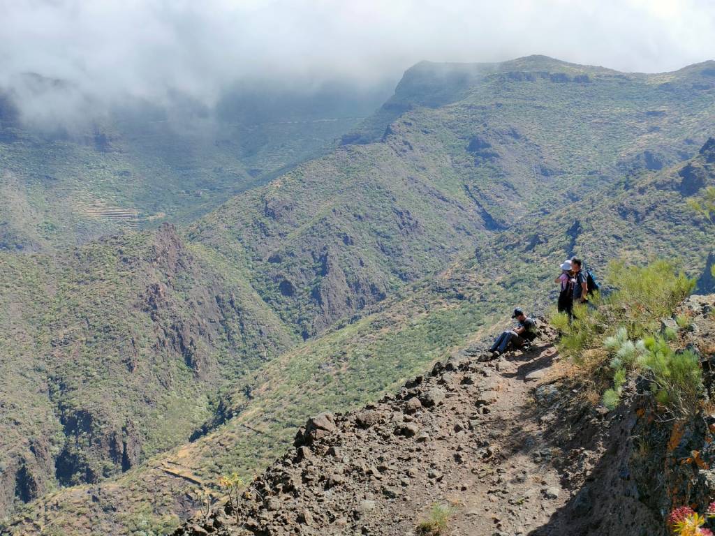 Desde el Mirador de Gilda, tomamos una pista que nos conduce a unas antenas para posteriormente tomar un sendero que nos va a llevar a bordear la Montaña del Cerco desde donde podremos disfrutar de unas vistas espectaculares de Masca dándonos una idea de tal magnitud. Al lado contrario las espectaculares cortadas del Barranco del Retamar que se une al de Juan Lopez hasta llegar al mar. Frente a nosotros destaca majestuoso el Pico Yeje.