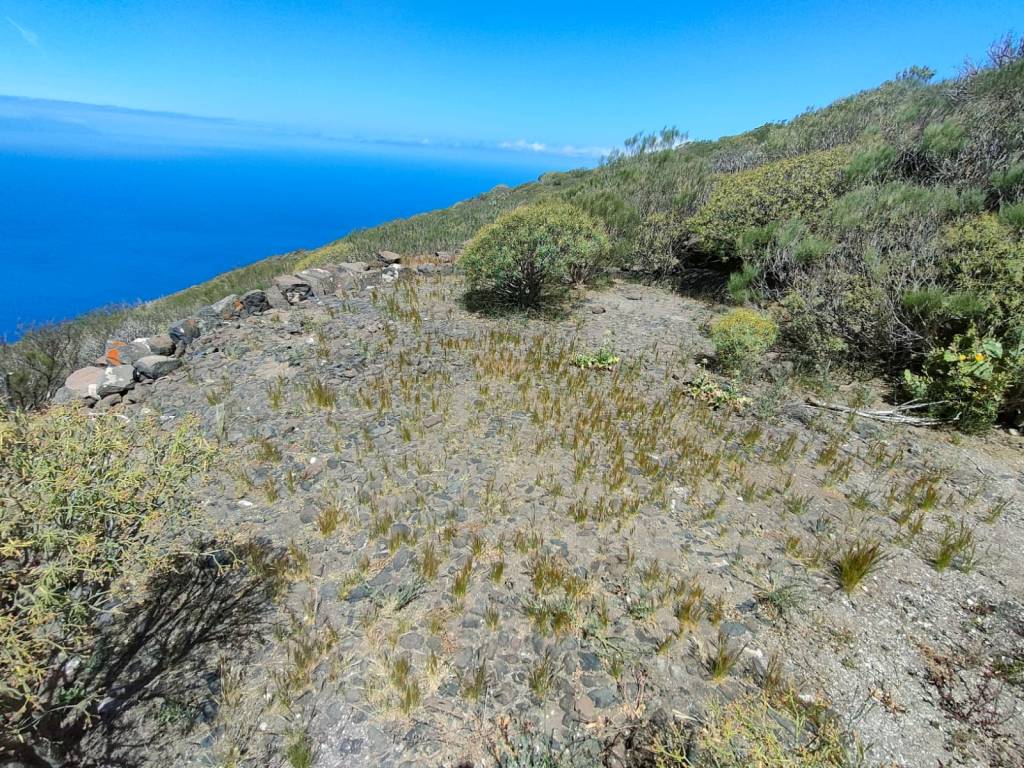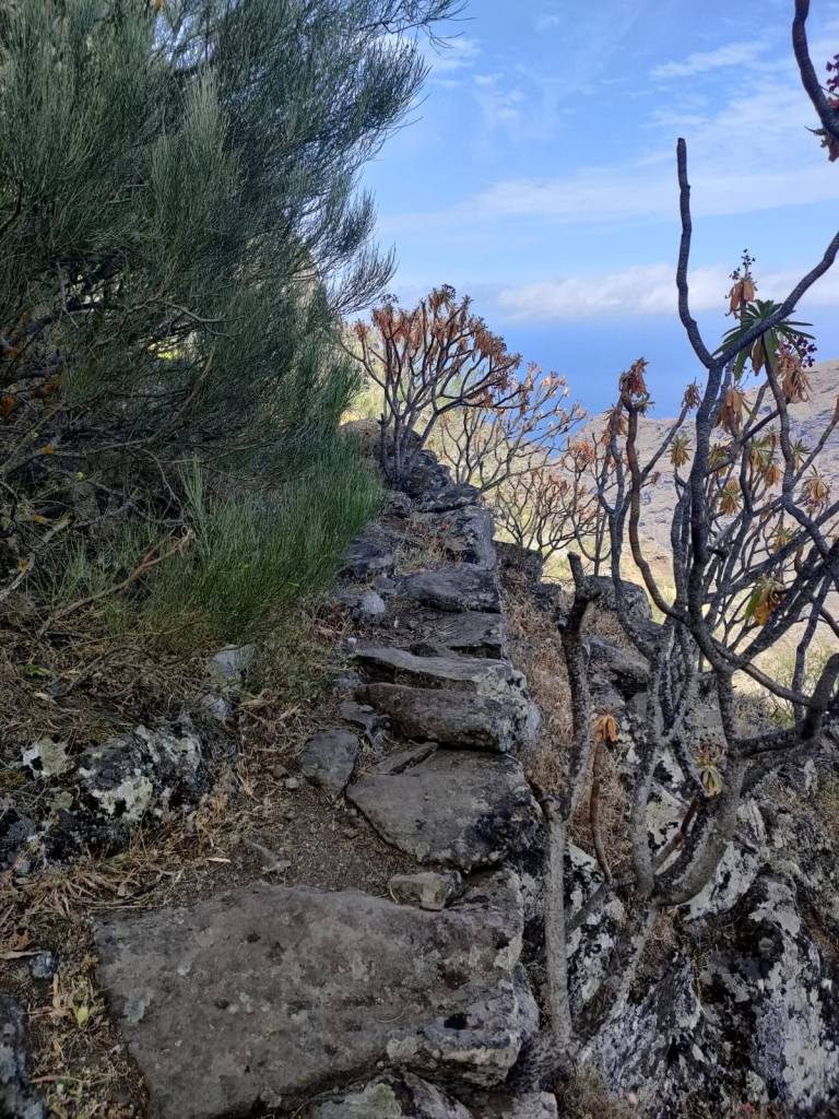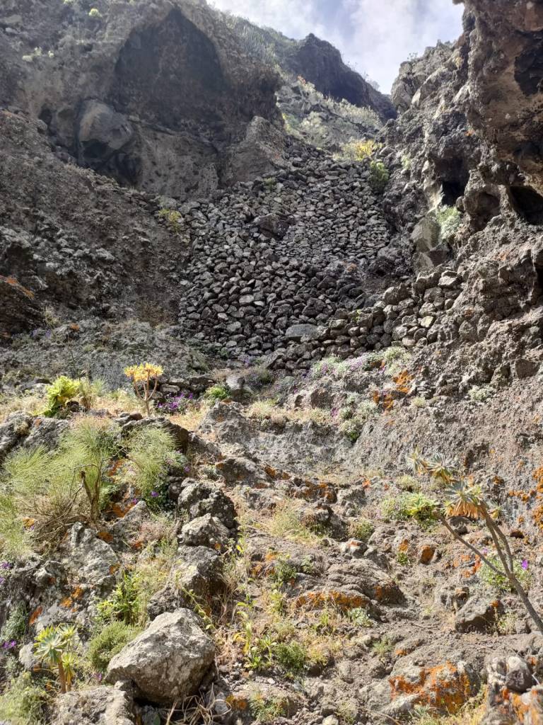 Una vez coronado el alto, se nos abre ante nosotros la denominada Cabezada de la Fortaleza, una plataforma inclinada hacia el mar y en cuya superficie hay numerosas huertas en forma de bancales, de cultivo ya abandonadas, las Huertas del Paso. En ellos se cultivaban cereales, trigo, millo, cebada, al igual que ocurría en la Finca de Guergues, en el acantilado anexo, separado por el Barranco de Masca. Hemos encontrado aljibes, cuevas y eras, vestigios de una forma de vida hoy olvidada, y que poco a poco esta desapareciendo colonizada por la vegetación autóctona. Desde este punto podemos disfrutar del majestuoso Barranco de Masca. Este increíble barranco con su famosa playa donde tendremos unas vistas que sin duda hay que hacer parada obligatoria parar contemplar tan magna formación.