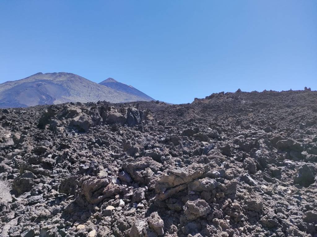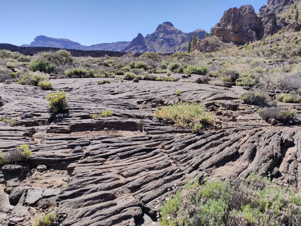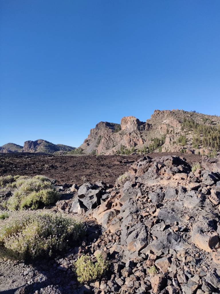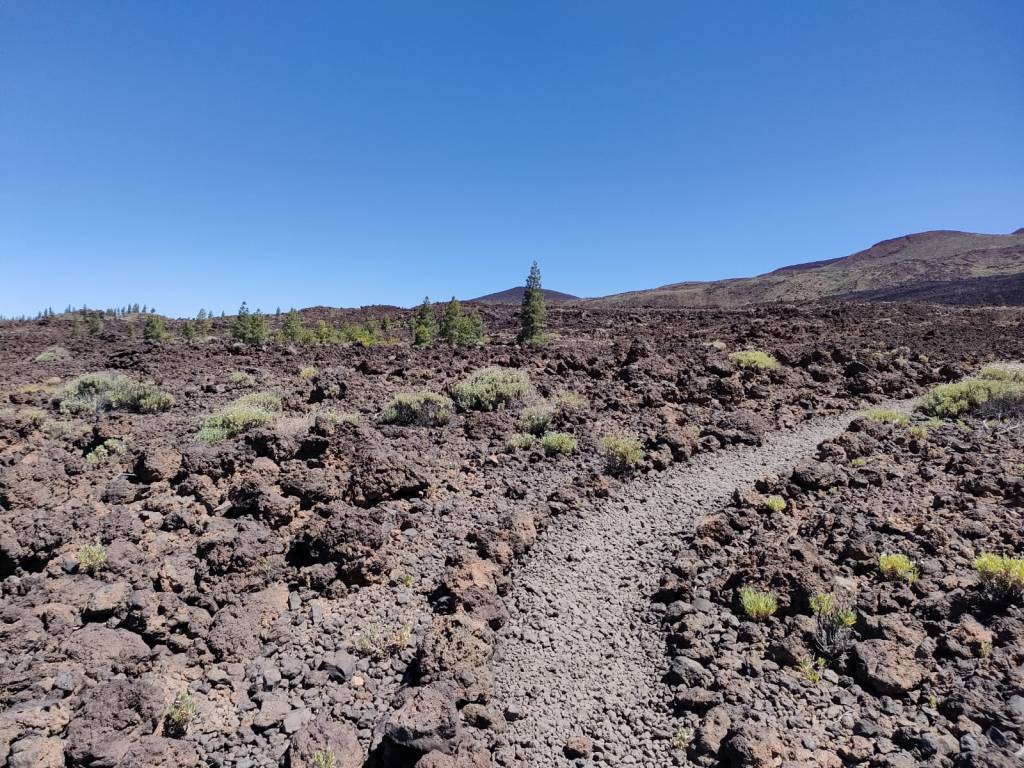 Ya en la parte final del recorrido y llegando al aparcamiento de donde comenzamos este recorrido, la senda atraviesa unas coladas de lava negras como el tizón. Se trata de la lava que fue expulsada por las laderas del Pico Viejo desde Las Narices del Teide. Son tan recientes que es imposible encontrar vegetación en ellas. Incluso el caminar resulta más pesado.