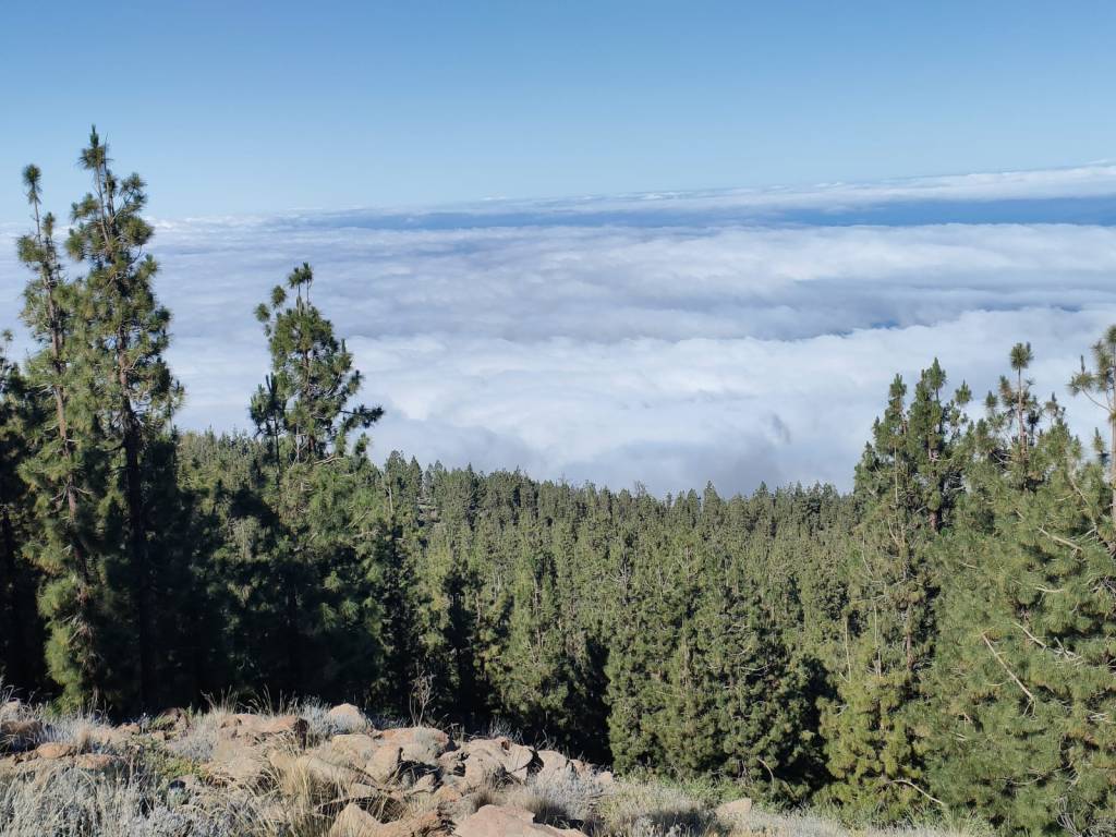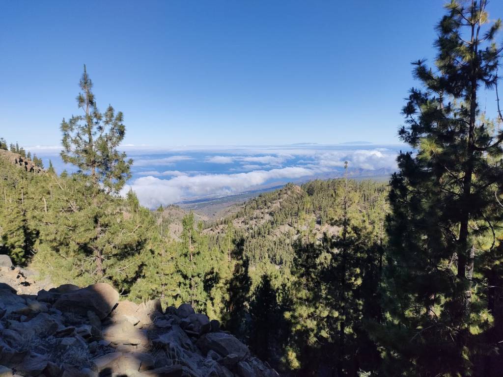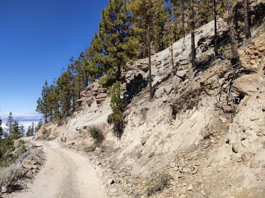 Continuando por el camino que lleva hasta esta torre, comenzamos a bordear la montaña entre pinos canarios y unas vistas que, en días despejados, se divisa el Municipio de Guía de Isora y en el horizonte las islas de La Palma, La Gomera y El Hierro.