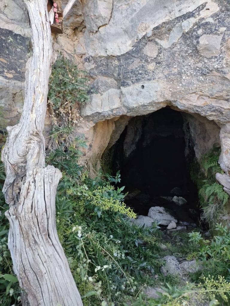Una vez en la cumbre, y siguiendo la senda que nos ha llevado a la parte alta, encontramos una especie de cueva. Se trata de la Fuente del Cedro, un pequeño manantial escarbado en la roca y que normalmente esta lleno de agua durante todo el año. Si nos mantenemos en silencio podemos incluso oír caer las gotas dentro de la cueva.