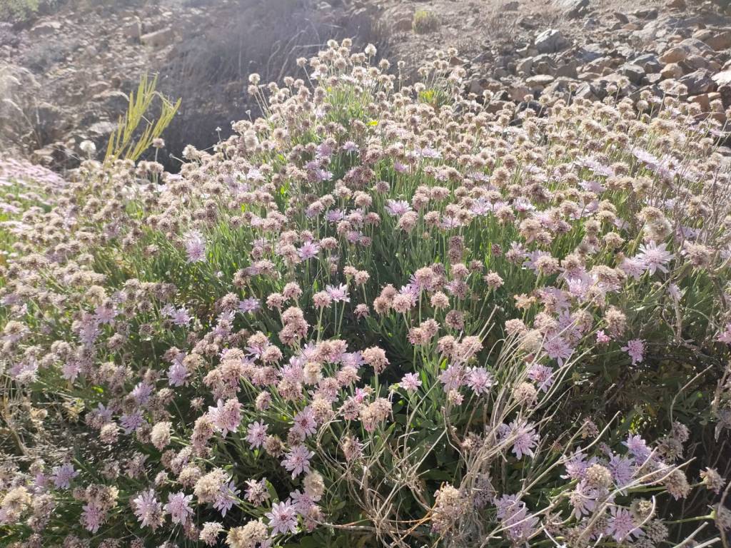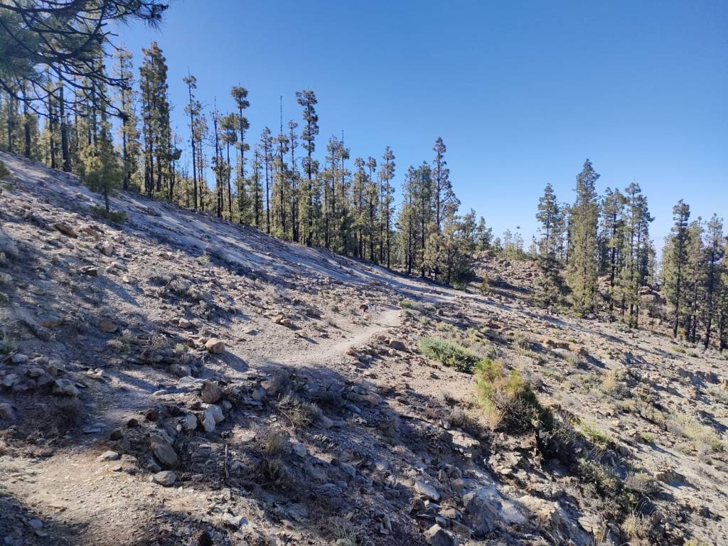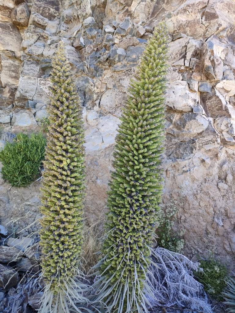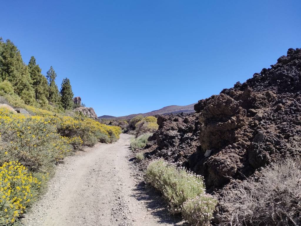 Pero además la vegetación que nos va acompañar por la senda, son retamas, rosalillos de cumbre, alhelí del Teide, cabezotes y tajinaste, pero que en esta época del año, estas especies están sin flor.