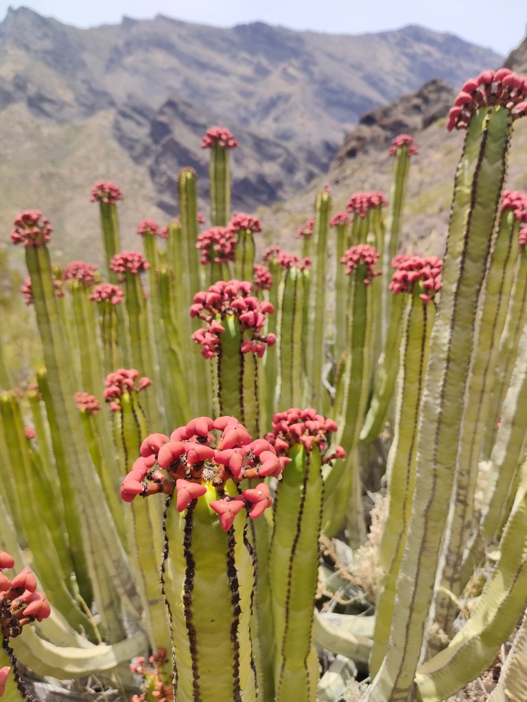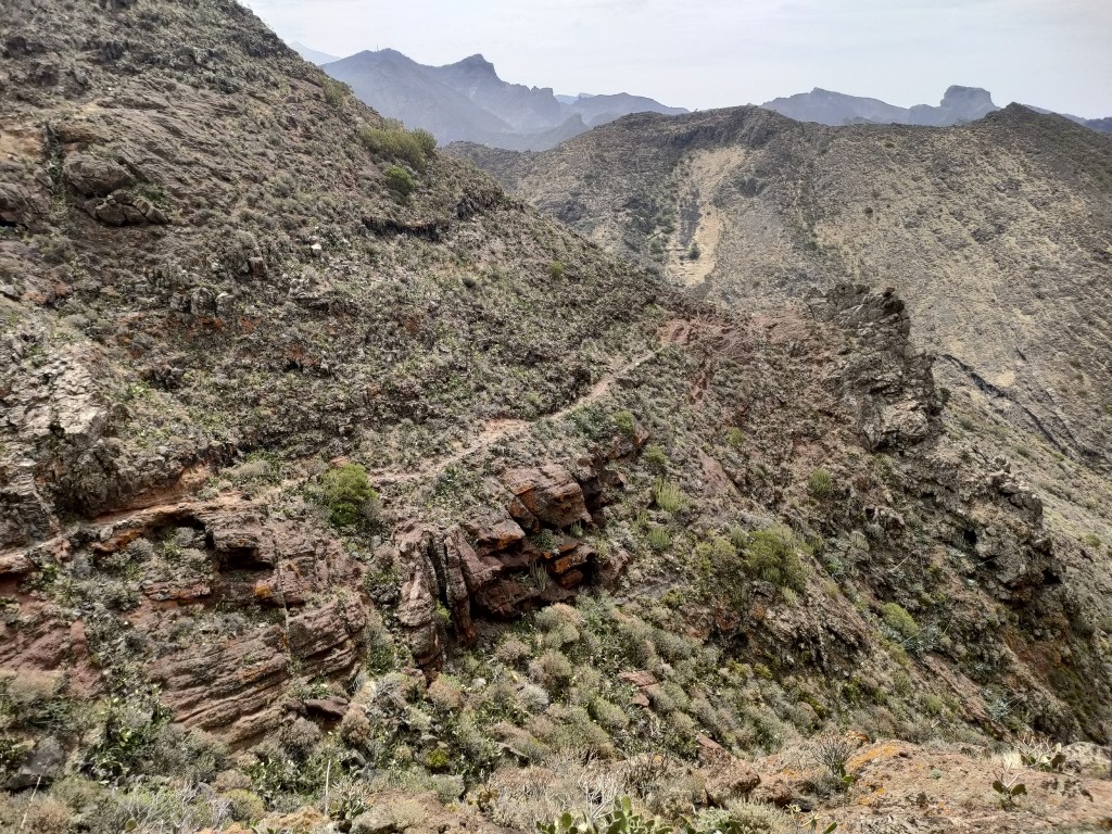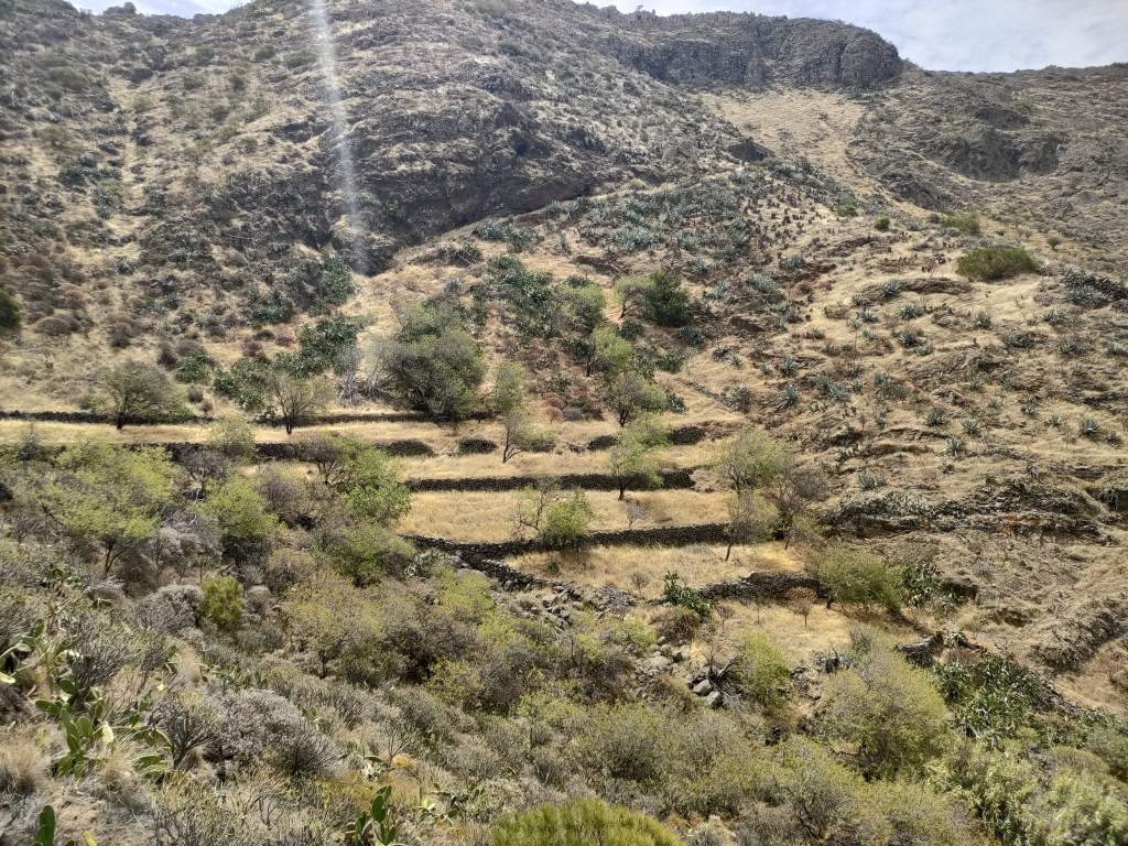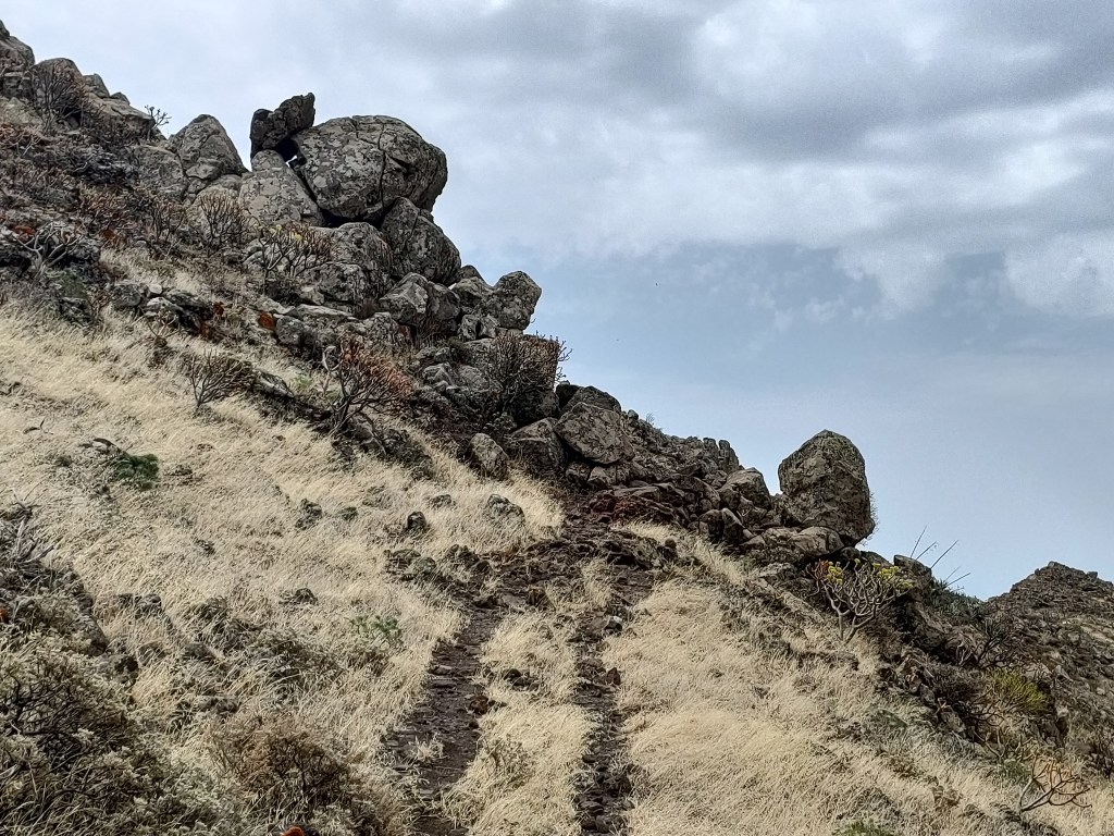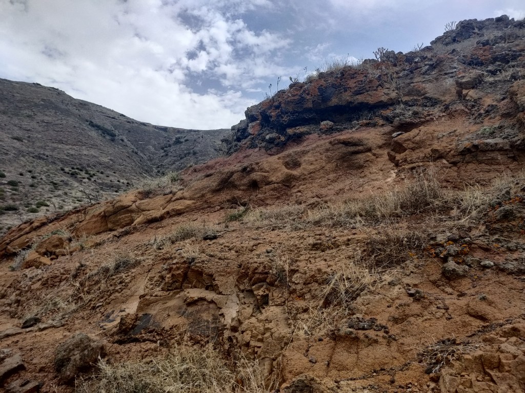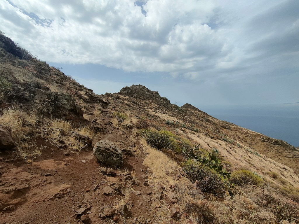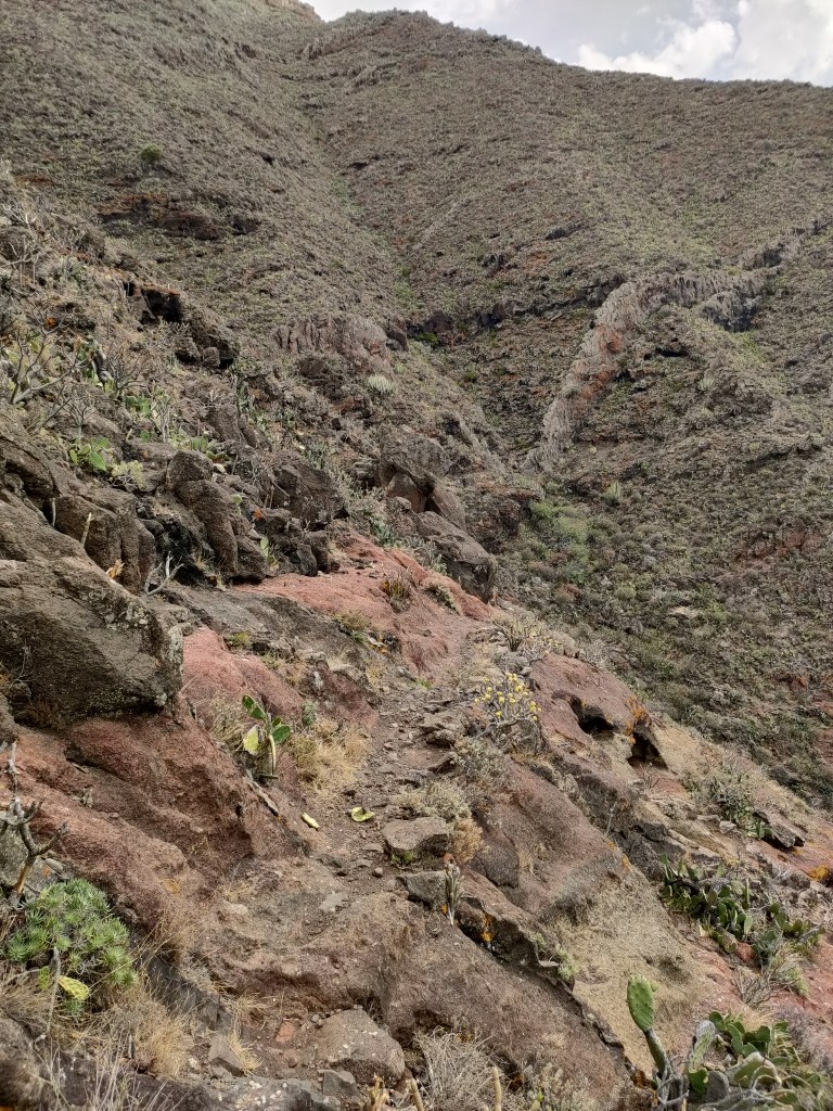Y si pensábamos que habíamos pasado lo peor, ante nosotros nos espera un difícil y sinuoso descenso entre cardones, tabaibas, verodes y retamas. Un descenso un tanto complicado ya que el camino está completamente perdido con muchos tramos con piedras sueltas que hacen aún más difícil el recorrido.