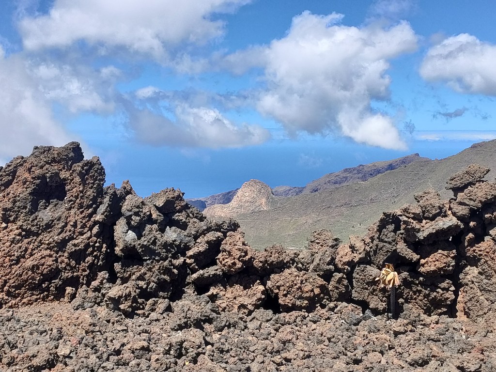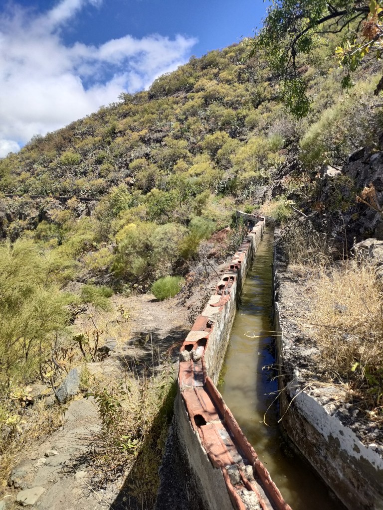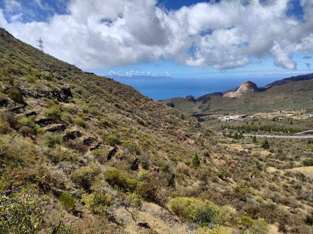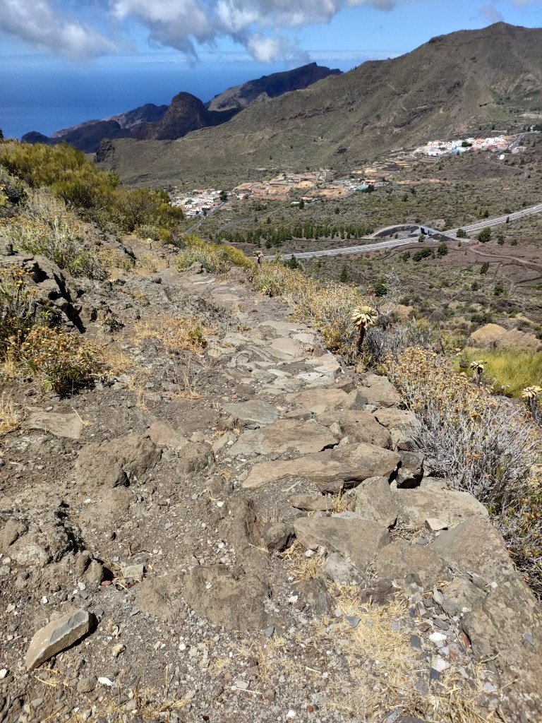 Una vez atravesado este malpaís, seguimos ahora en dirección descendente y paralelos a las lavas, hacia Las Manchas. Las huertas de almendreros, con paredes de piedra volcánica que delimitan las fincas, dan un toque diferente a esta nueva zona. Unos muros que siguen aguantando los envites del tiempo. De piedras negras volcánicas de la zona, que salpican este lugar de cultivos, vertebrando el paisaje como verdaderas columnas vertebrales. Delante de nosotros, parte del Macizo de Teno, con Risco Blanco al fondo e incluso se puede divisar La Gomera.