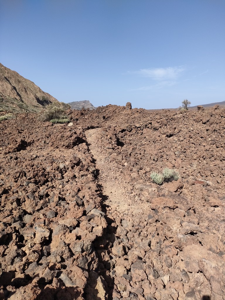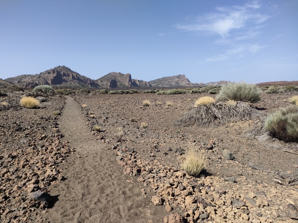 Llanuras entre gigantes. Cómodo camino que atraviesa esta gran llanura y frentes de lava, al pie del sector occidental del elevado escarpe de la Caldera de Las Cañadas.