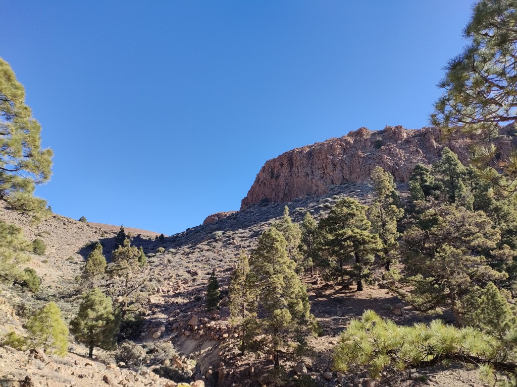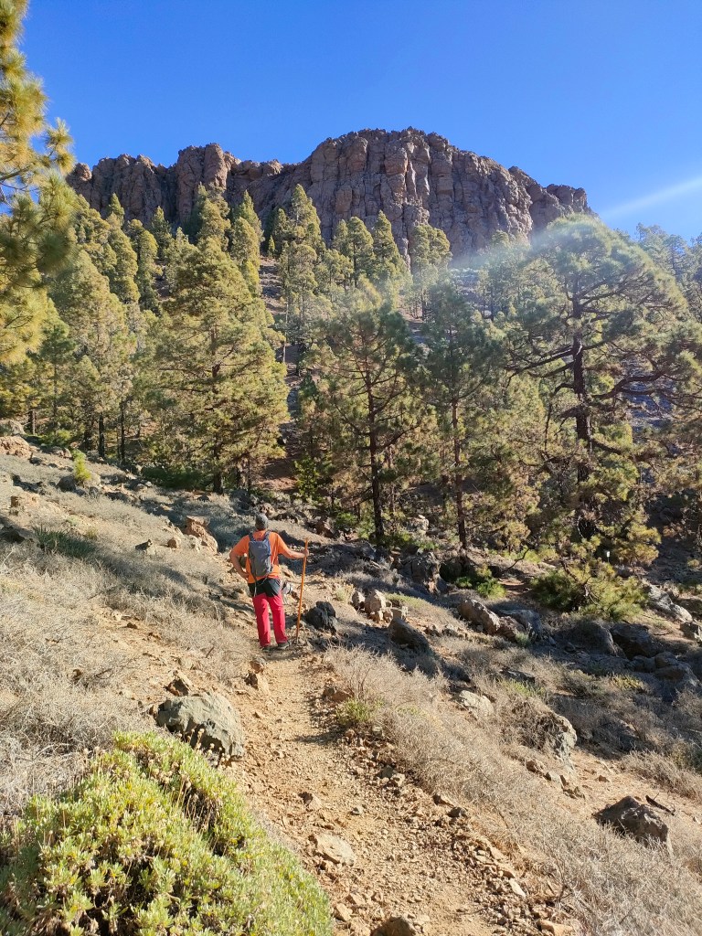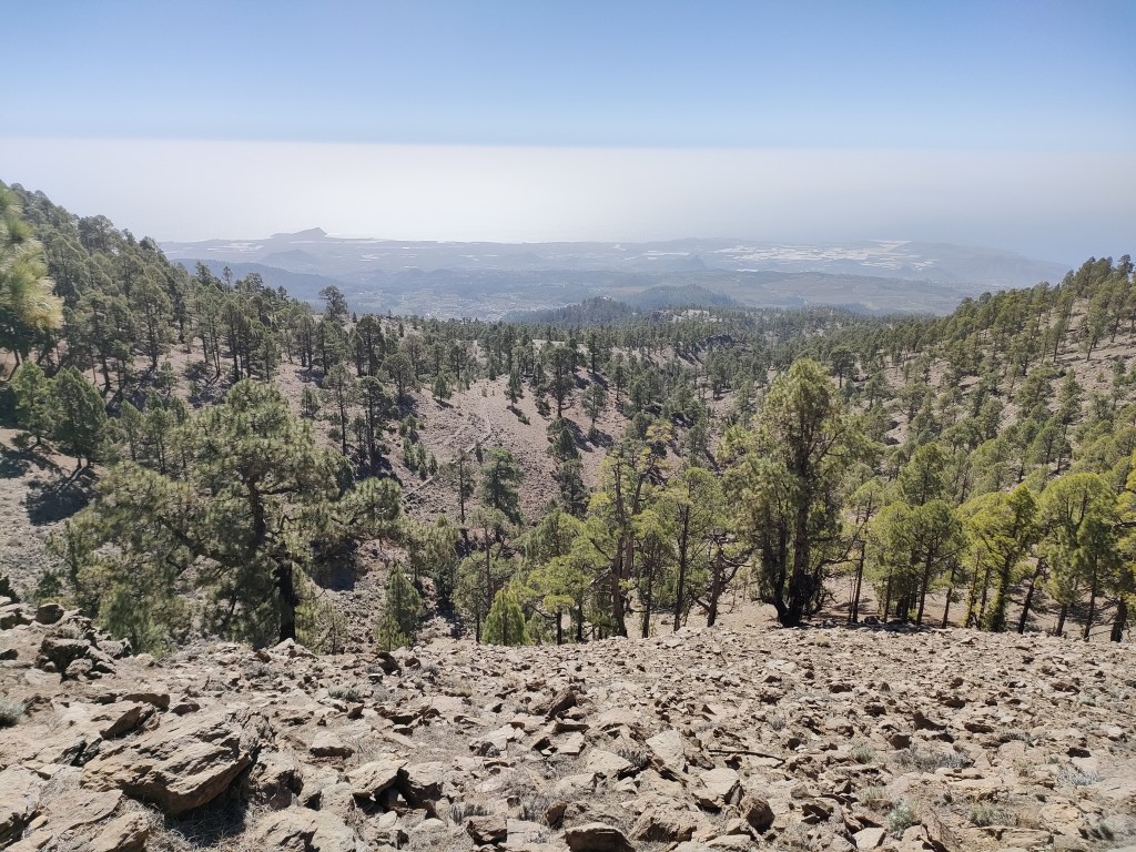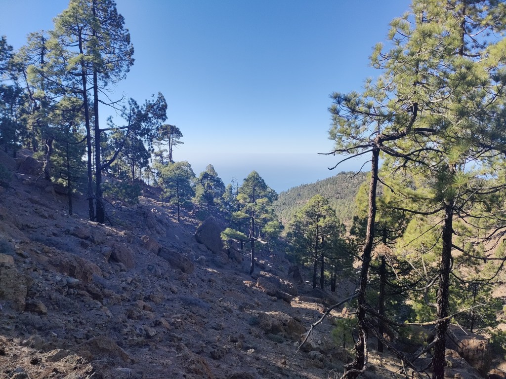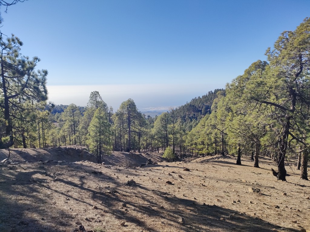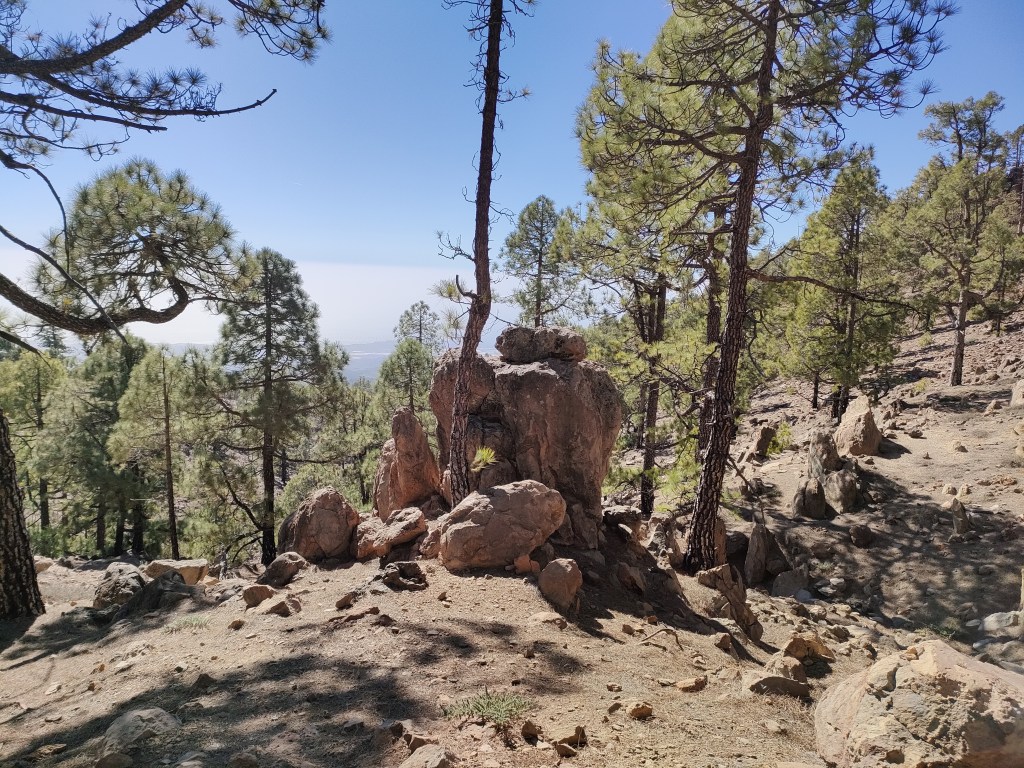 Una vez disfrutado del silencio y las vista de ahí arriba, nuestra vuelta se va a realizar siguiendo los pasos que nos llevaron a la cima, descendiendo por la degollada hacia la izquierda donde nos meteremos en el Lomo de Pegueros hasta alcanzar de nuevo el bosque de pinos.