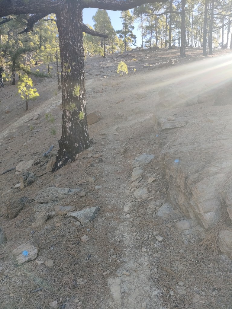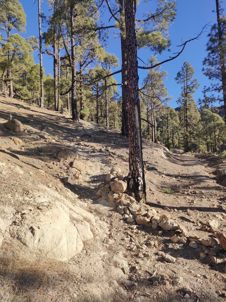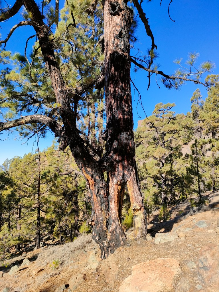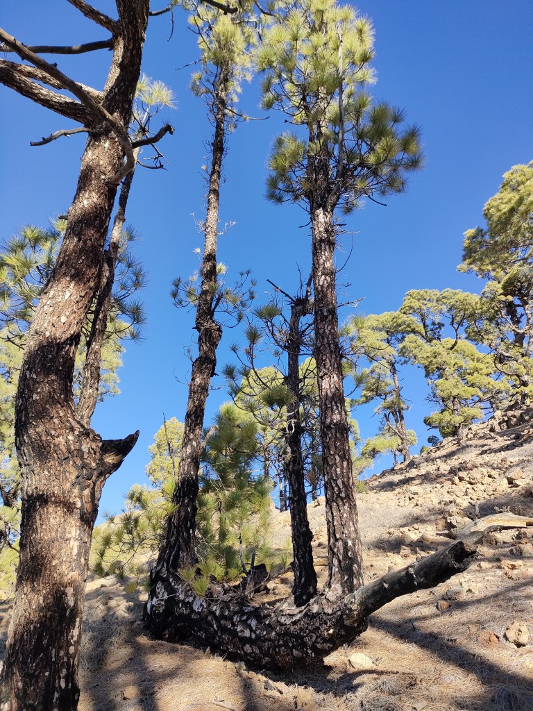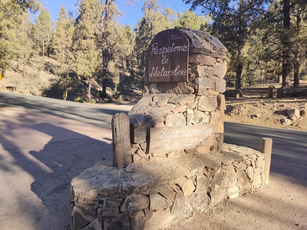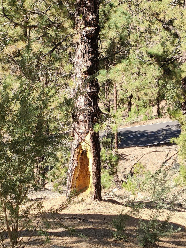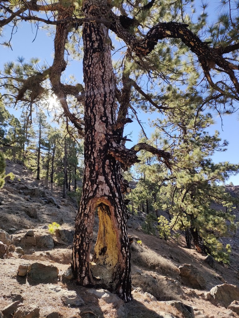 Saliendo del Área Recreativa de Las Lajas y cruzando la carretera, nos adentramos en un bosque de pino canario por una senda en mitad del bosque. Pinos canarios donde podemos encontrar importantes ejemplares, algunos de ellos con «heridas» fruto de que hace mas de un siglo se extraía la resina de sus troncos.
