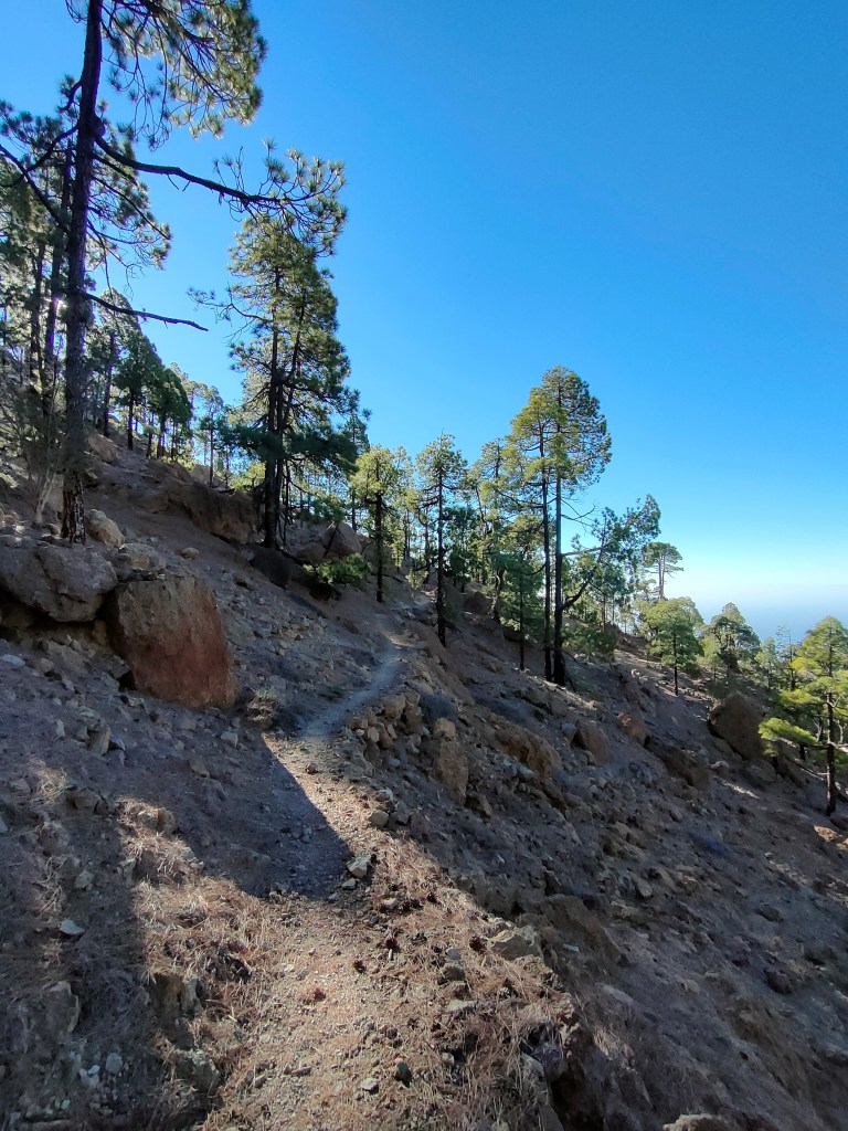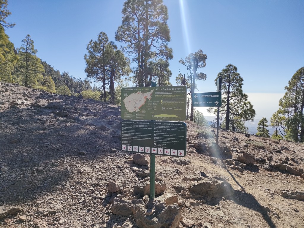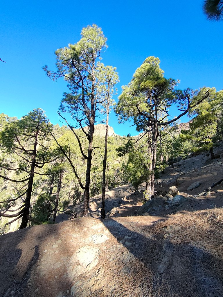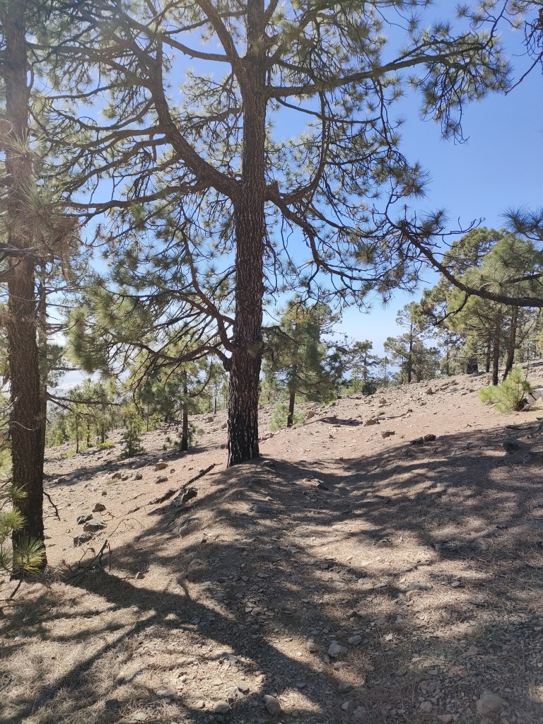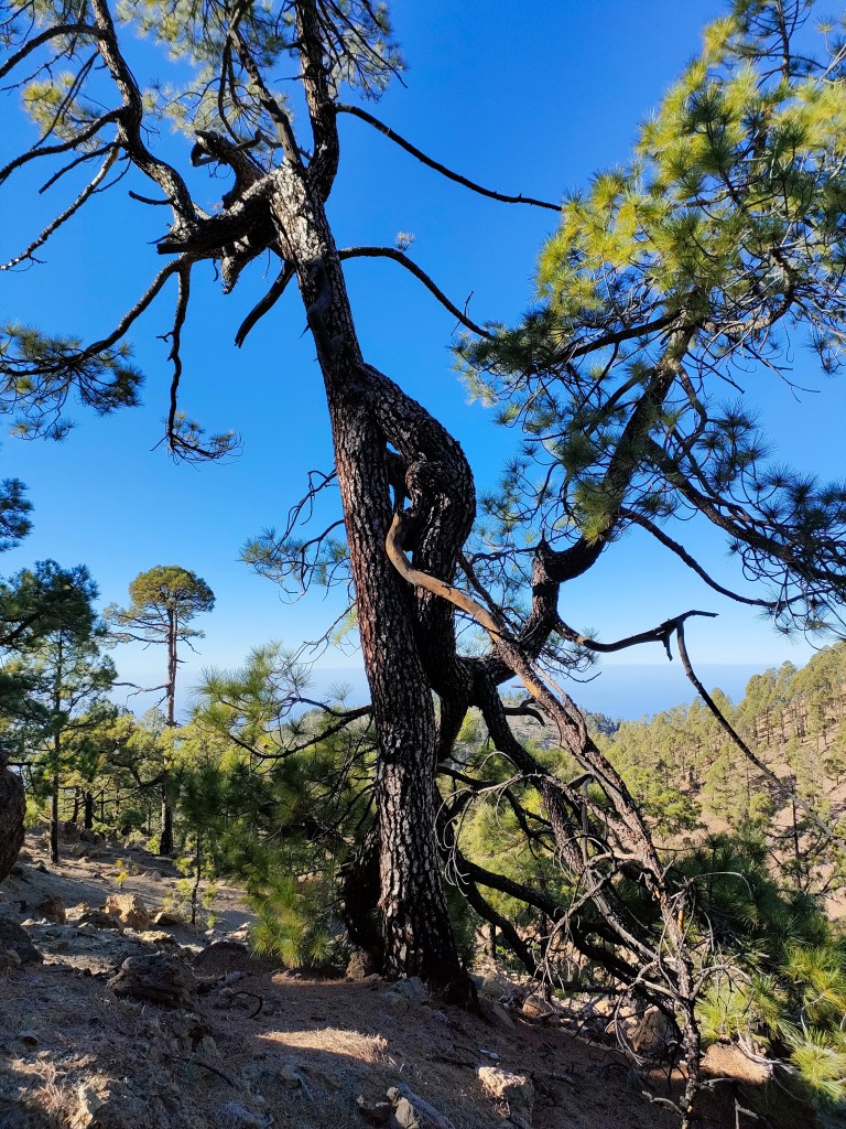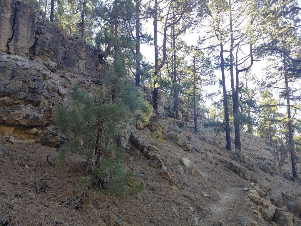 Saliendo del Área Recreativa de Las Lajas y cruzando la carretera, nos adentramos en un bosque de pino canario por una senda en mitad del bosque. Pinos canarios donde podemos encontrar importantes ejemplares, algunos de ellos con «heridas» fruto de que hace mas de un siglo se extraía la resina de sus troncos.