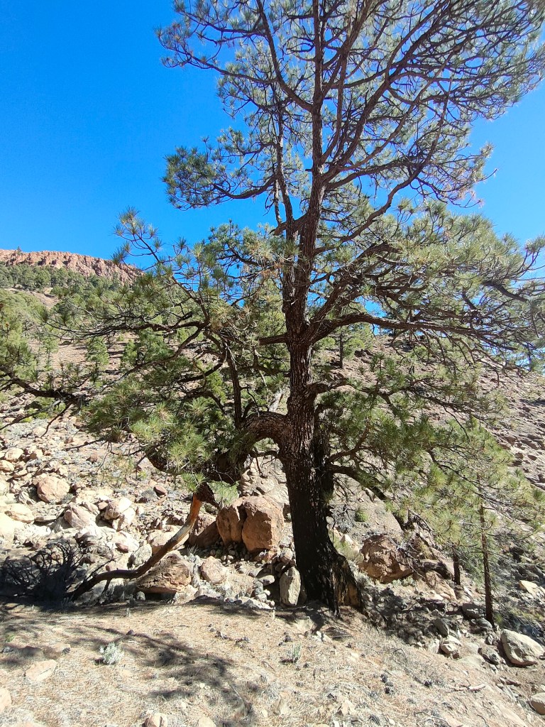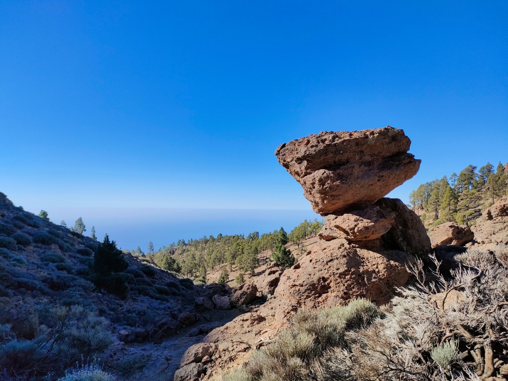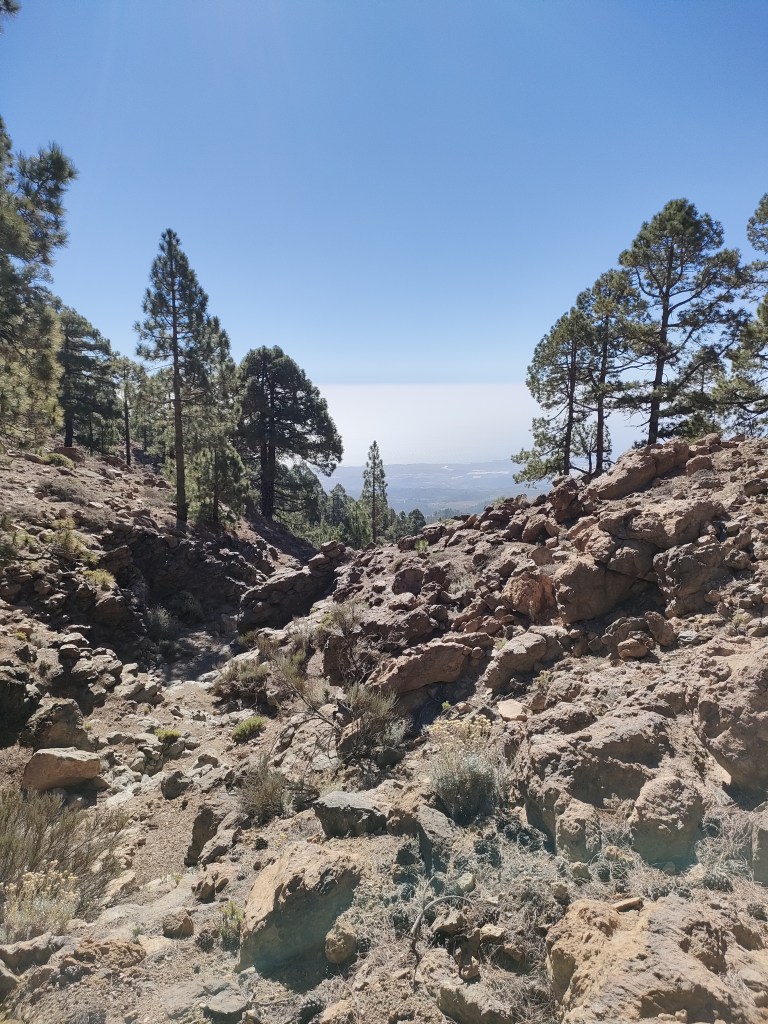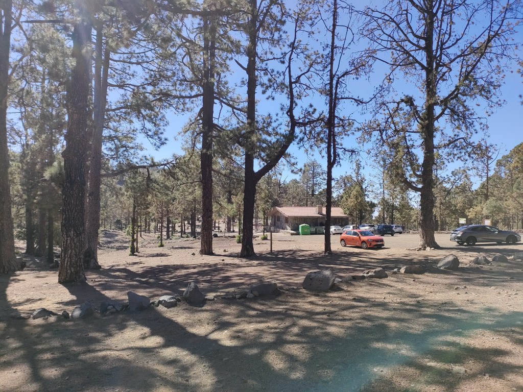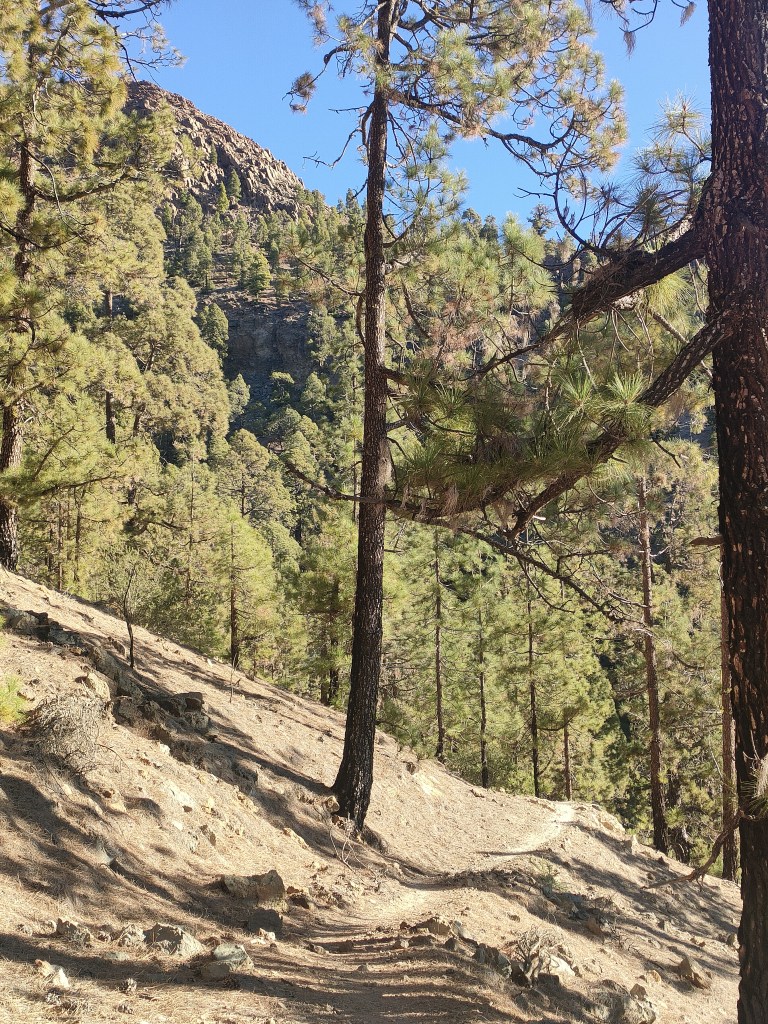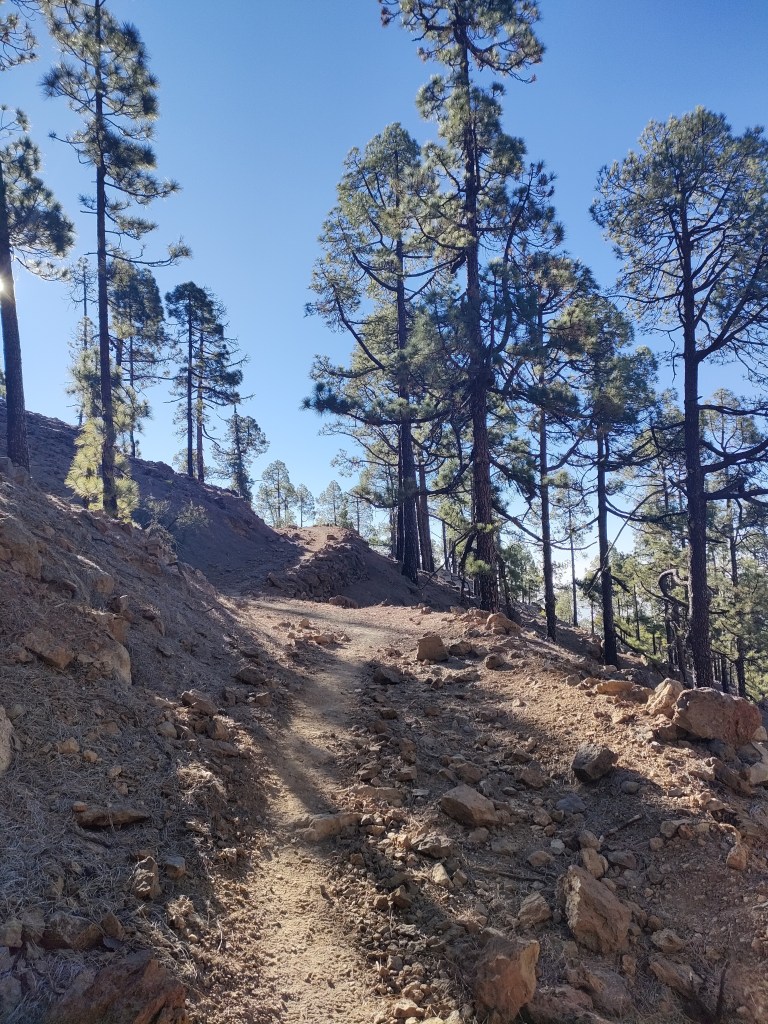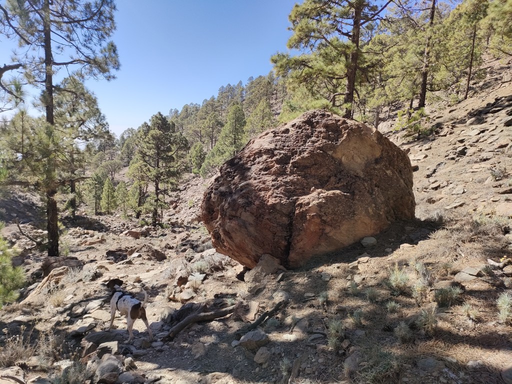 Saliendo del Área Recreativa de Las Lajas y cruzando la carretera, nos adentramos en un bosque de pino canario por una senda en mitad del bosque. Pinos canarios donde podemos encontrar importantes ejemplares, algunos de ellos con «heridas» fruto de que hace mas de un siglo se extraía la resina de sus troncos.