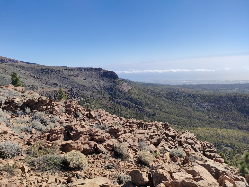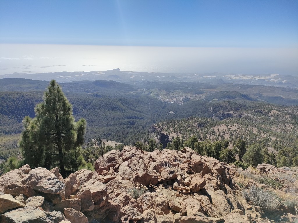 Ya en la parte más alta nos encontramos con una increíble altiplanicie llena de lajas, y donde encontramos unas vistas impresionantes de gran parte de la costa sur de la isla, así como en el océano, las siluetas de la Isla de Gran Canaria y La Gomera, también puede verse el Teide.