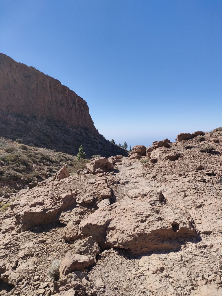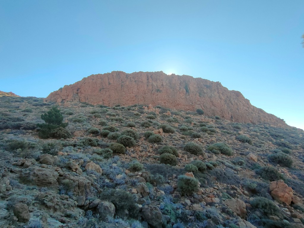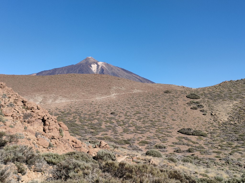 Una vez arriba, llanearemos por la base de unas amplias resbaladeras de picón, material proveniente de las distintas erupciones, y nos dirigiremos a rodear una cumbre rocosa separada por una minúscula degollada de la cima principal, desde donde tendremos unas vistas de El Teide.
