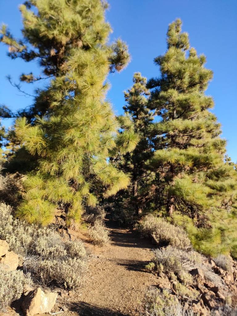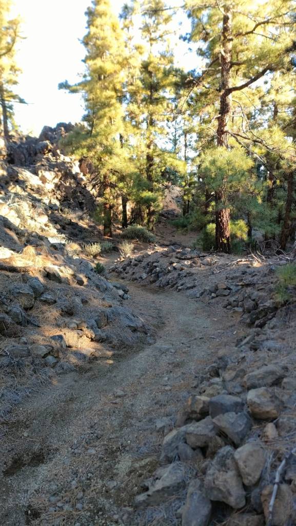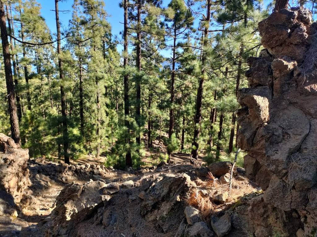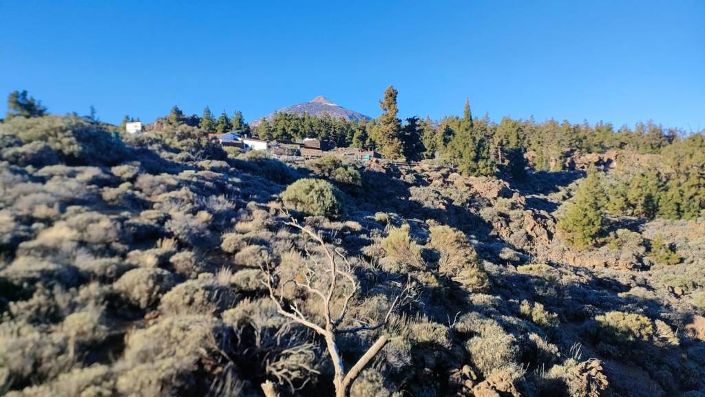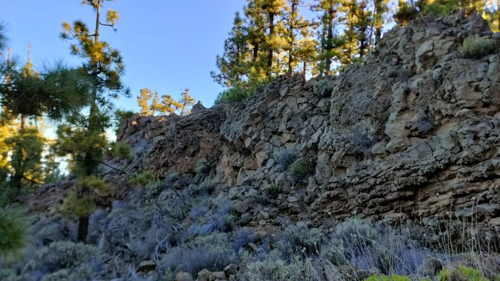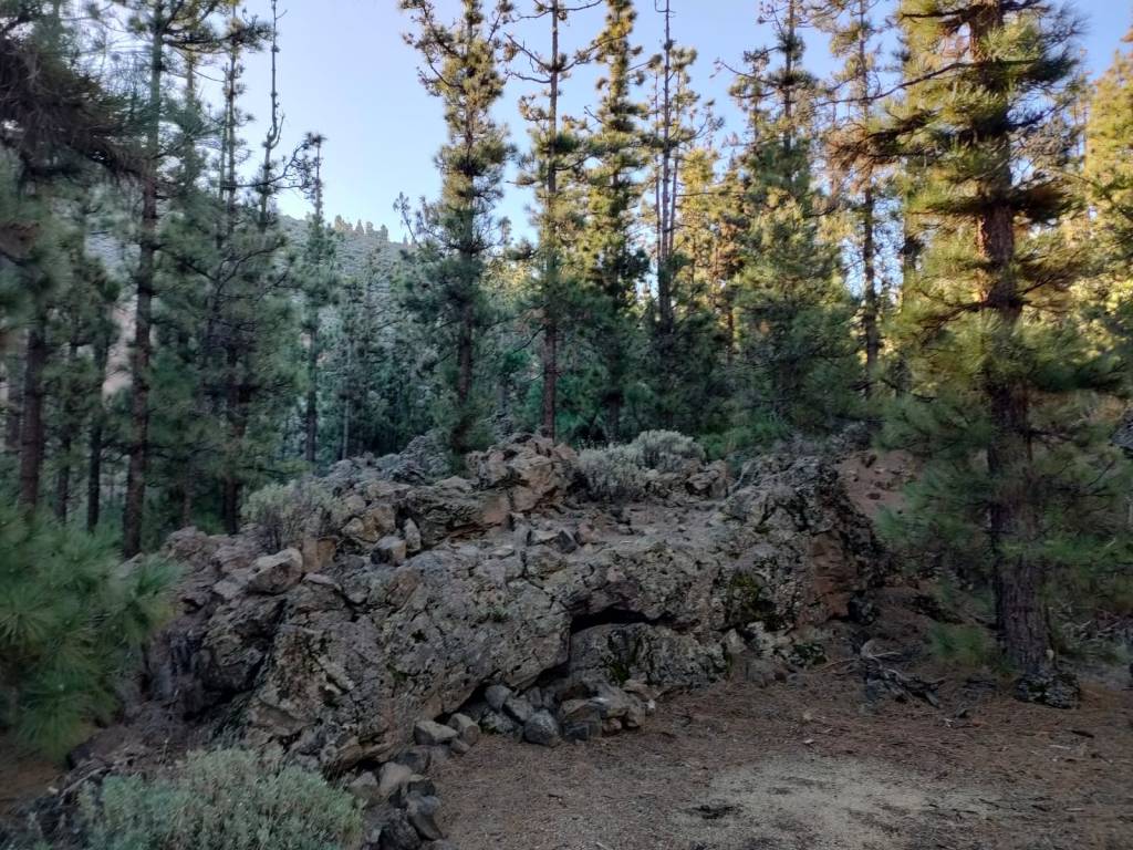 Partimos desde El Portillo a primera hora de la mañana, frío congelador en estas primeras horas, y que se ve reflejado en partes del suelo que está congelado. Los primeros metros los hacemos dentro del Parque Nacional de El Teide, entre codesos de cumbre y retamas, con la montaña de Guamaso presidiendo estos primeros pasos, no tardamos en meternos de lleno en un pinar frondoso siguiendo un sendero entre antiguas coladas, con diques y lavas petrificadas en el tiempo. Un brusco descenso hasta encontrarnos con los primeros pinos canarios.