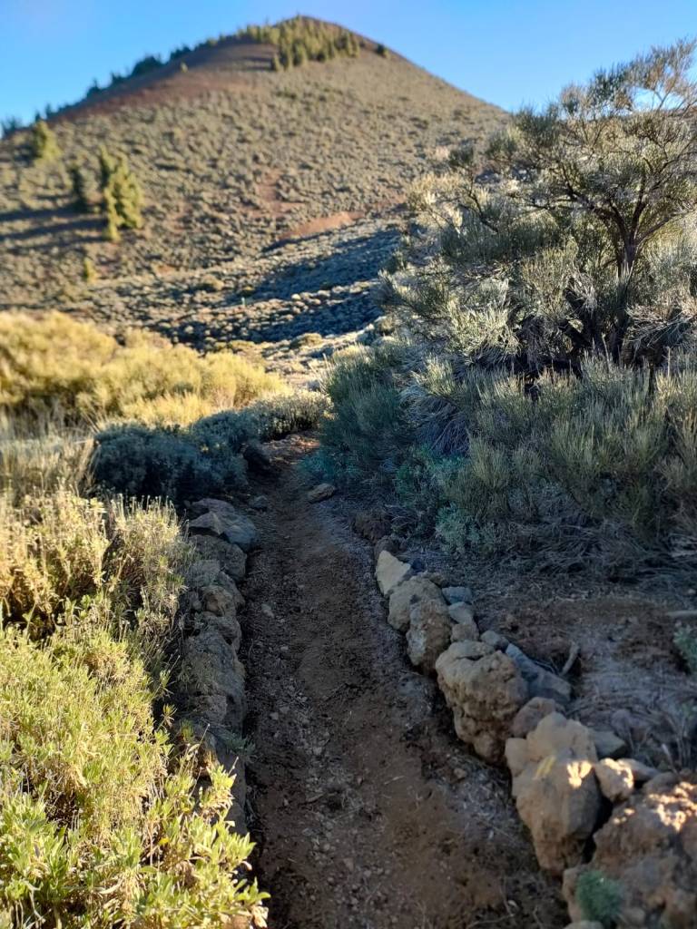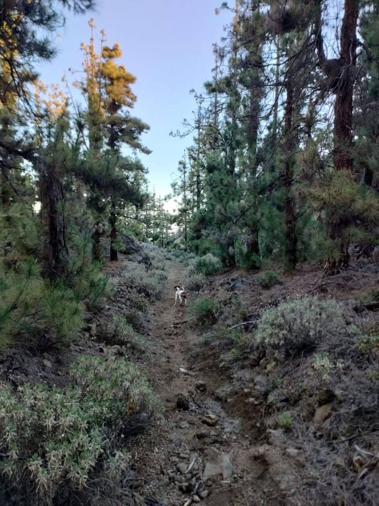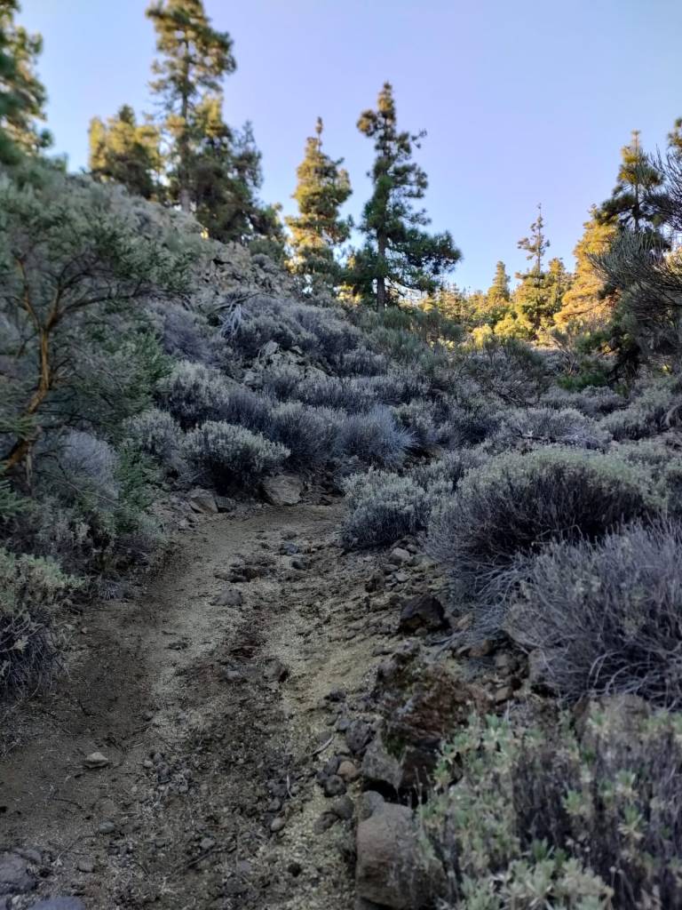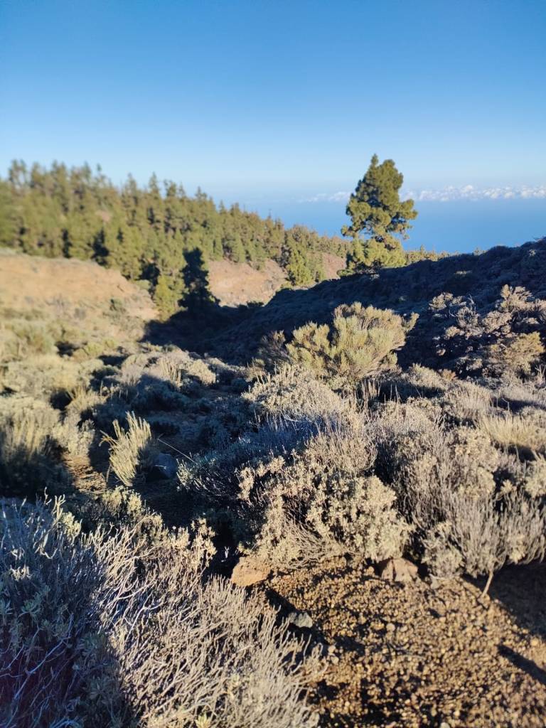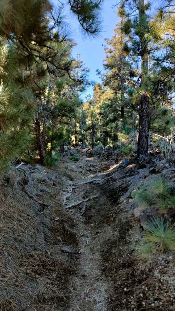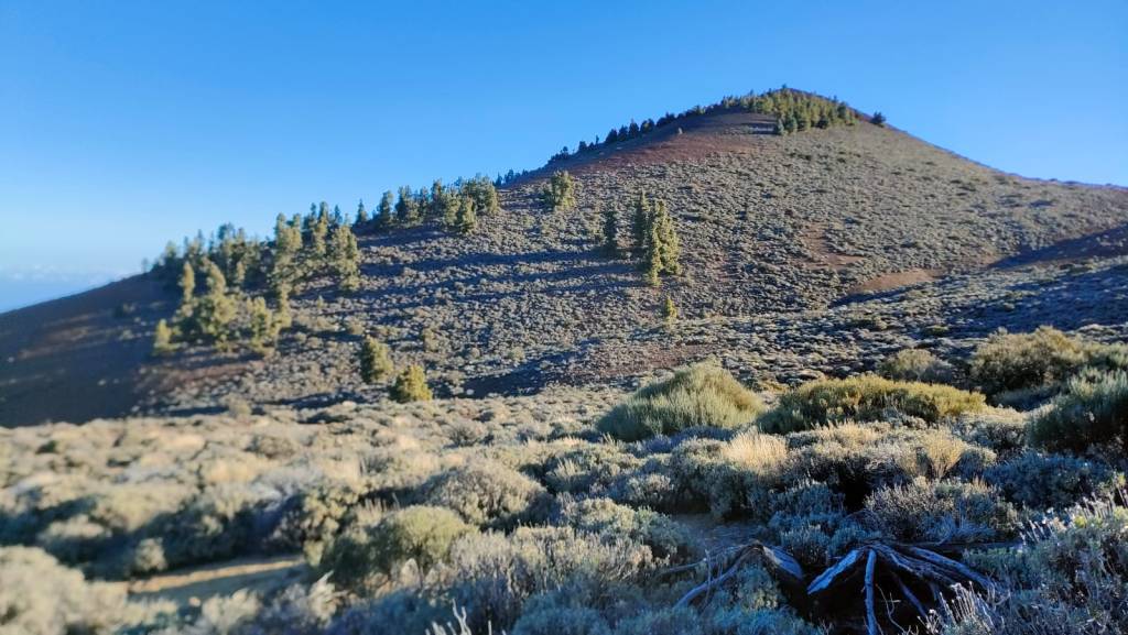 Partimos desde El Portillo a primera hora de la mañana, frío congelador en estas primeras horas, y que se ve reflejado en partes del suelo que está congelado. Los primeros metros los hacemos dentro del Parque Nacional de El Teide, entre codesos de cumbre y retamas, con la montaña de Guamaso presidiendo estos primeros pasos, no tardamos en meternos de lleno en un pinar frondoso siguiendo un sendero entre antiguas coladas, con diques y lavas petrificadas en el tiempo. Un brusco descenso hasta encontrarnos con los primeros pinos canarios.