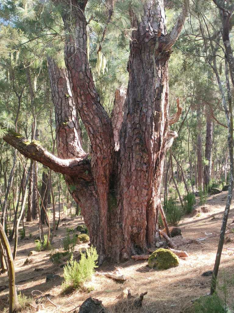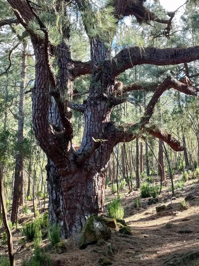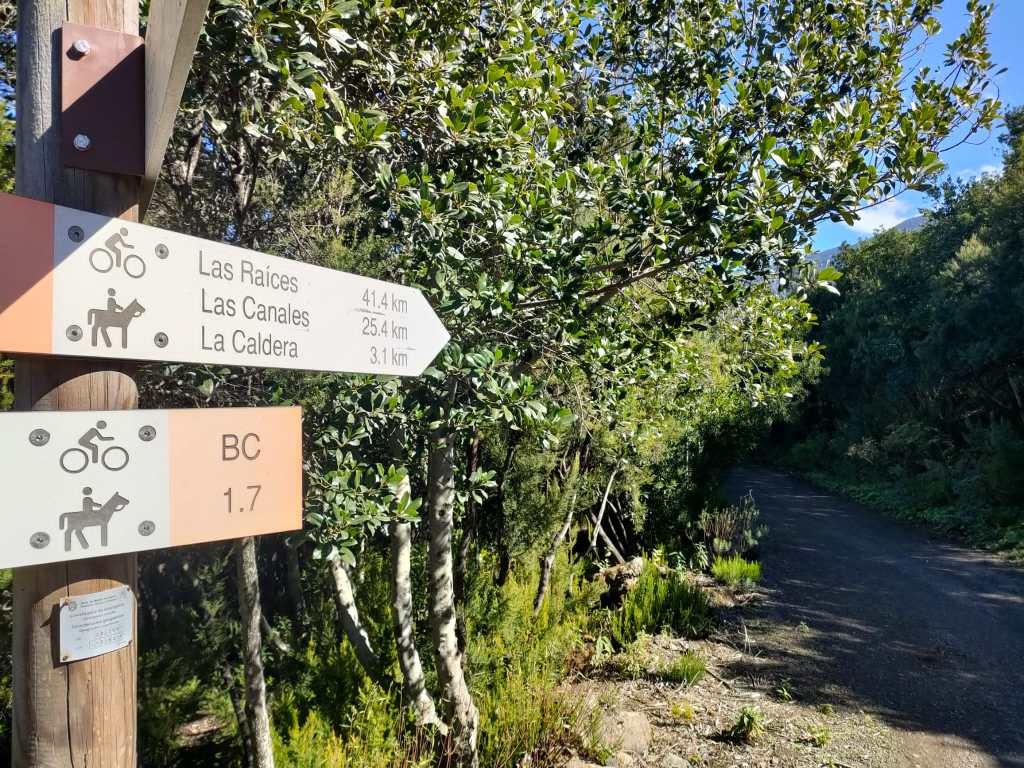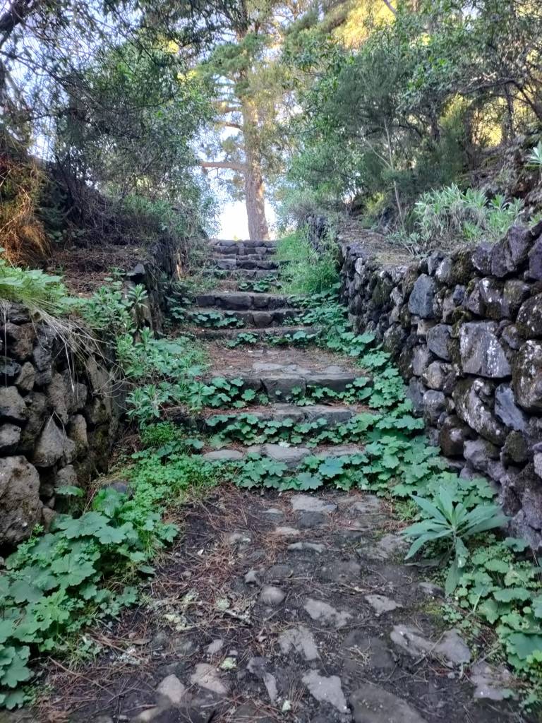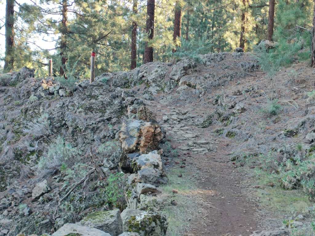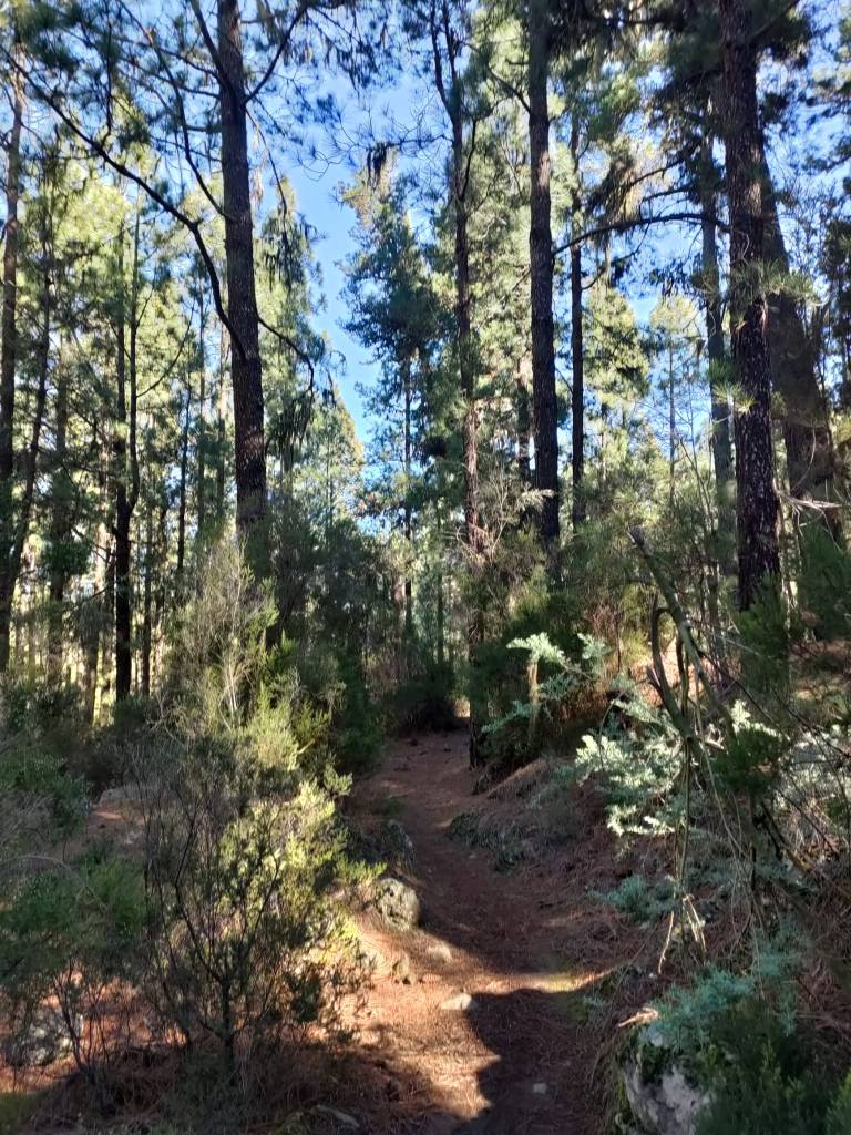 El camino transcurre por un frondoso bosque de pinos que poco a poco se irá convirtiendo en un increíble monteverde predominando especies características de la laurisilva. Un sendero que en algunos tramos, caminaremos por pista para tomar el antiguo Camino Real de Chasna y que nos llevará hasta la parte final, La Caldera.