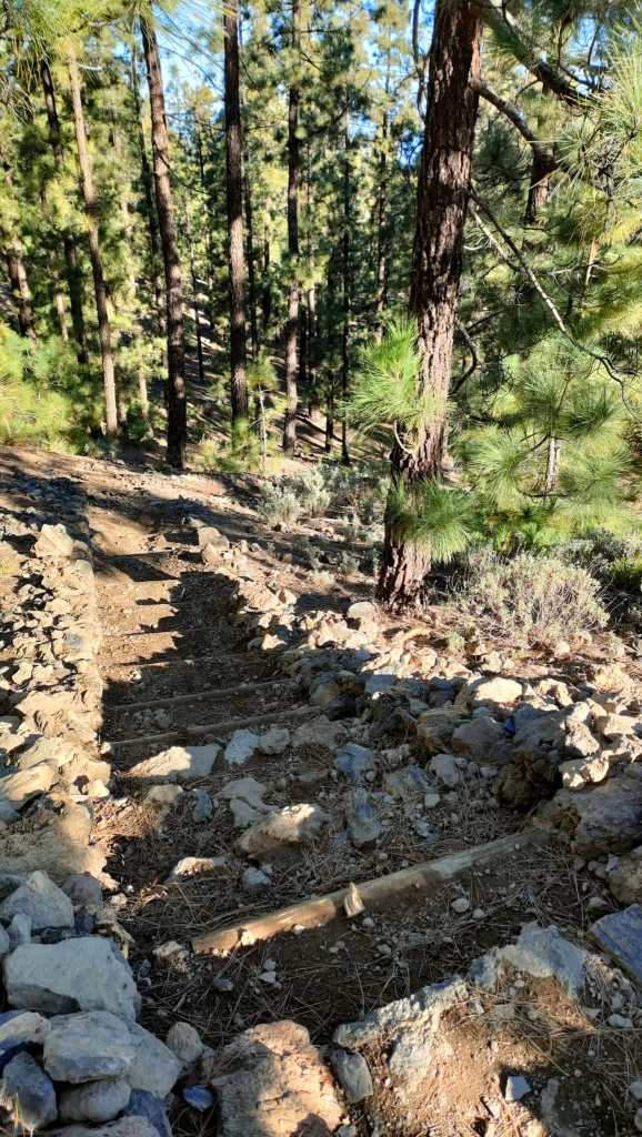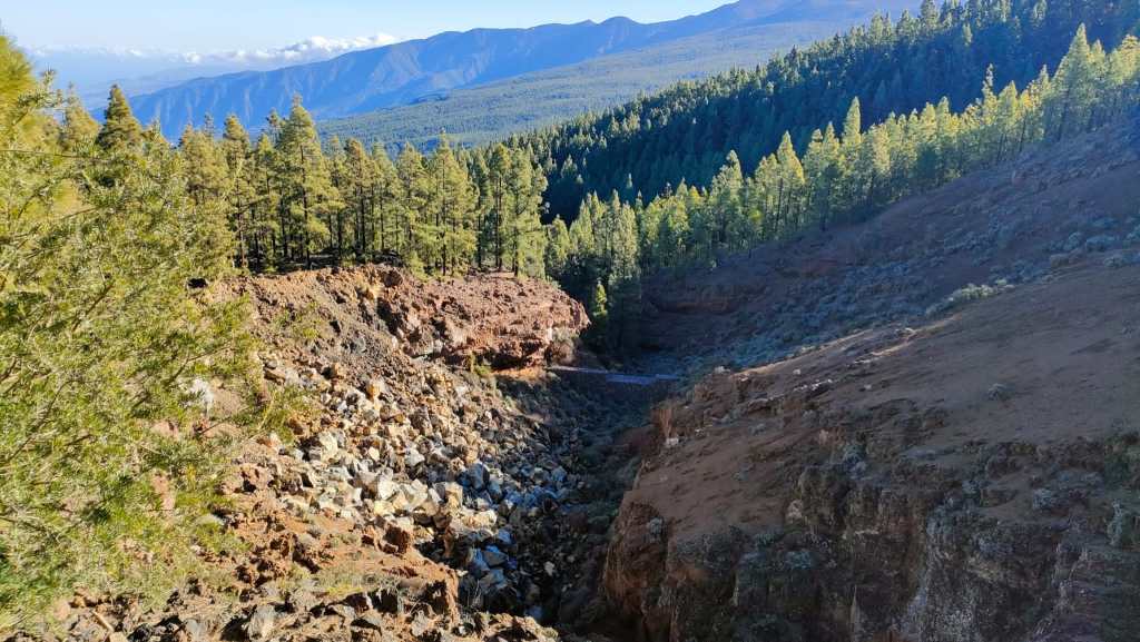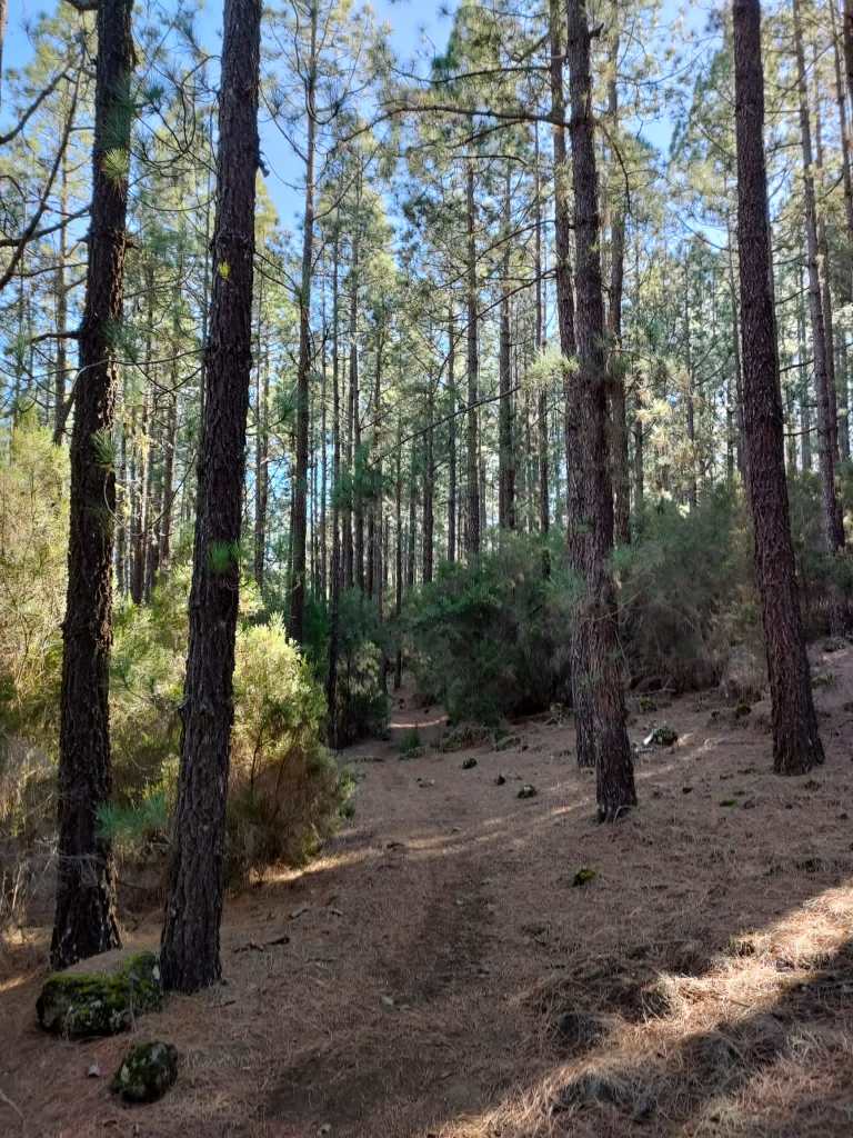 En este momento nuestro camino se interna en lo más profundo de La Corona Forestal entre pinos, con un silencio absoluto donde podremos disfrutar del paisaje que nos rodea. Este tramo del Camino va atravesando varios barrancos, que forman la red de drenaje del norte de Tenerife. La Corona Forestal ejerce un destacadisimo papel en la captación de aguas y en la conservación de suelos ante la erosión. Aunque el camino no tiene pérdida, iremos paralelos al Barranco Guamaso, donde nos conducirá en un sendero de bajada y con unas vistas de este barranco, en algunos tramos con un profundo corte.