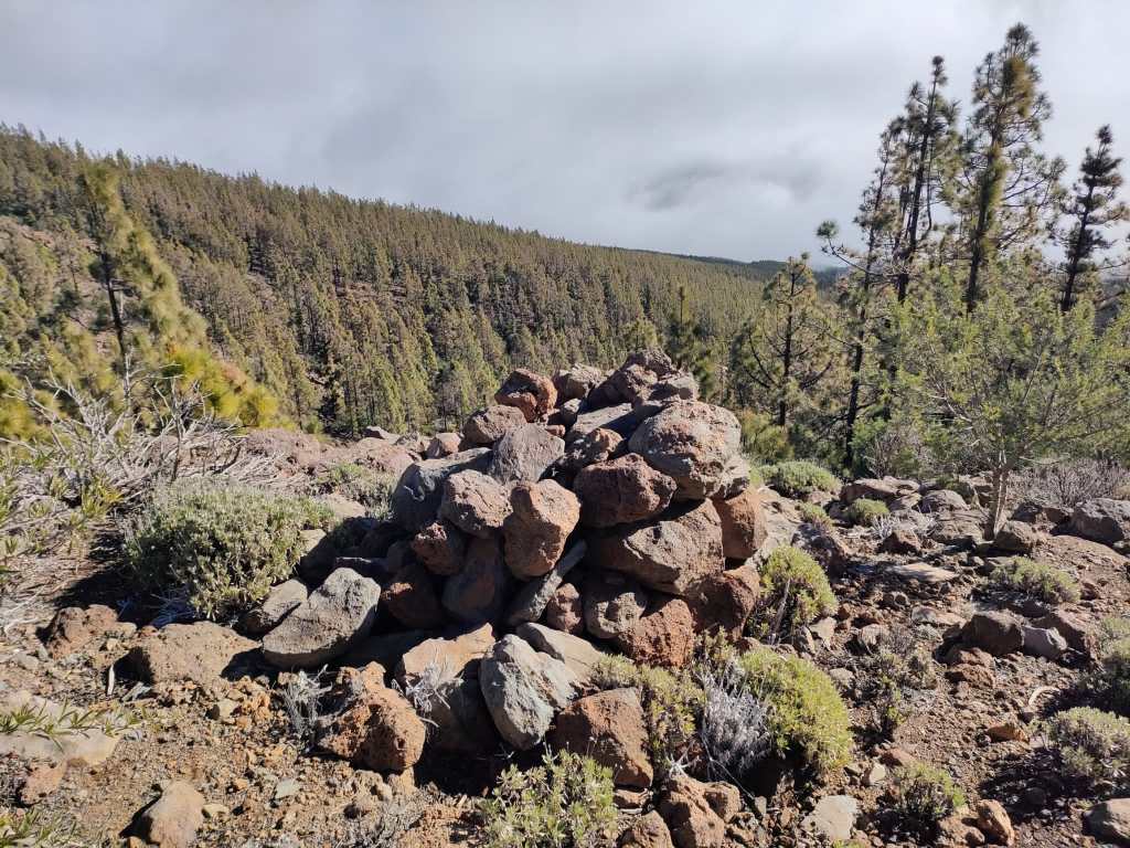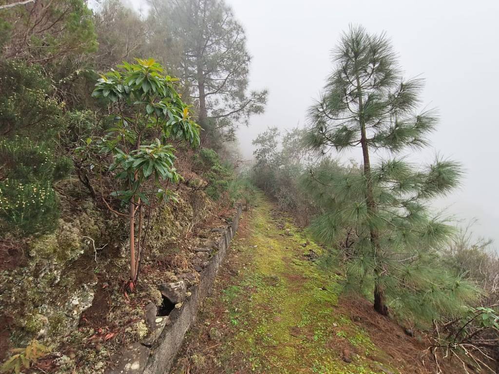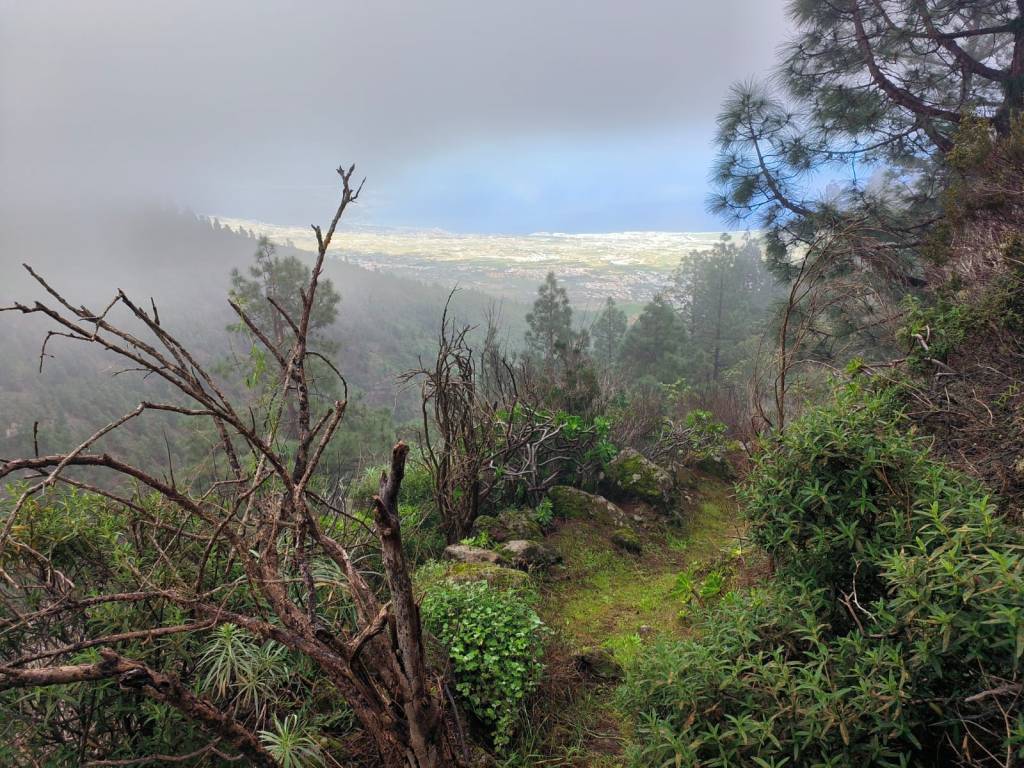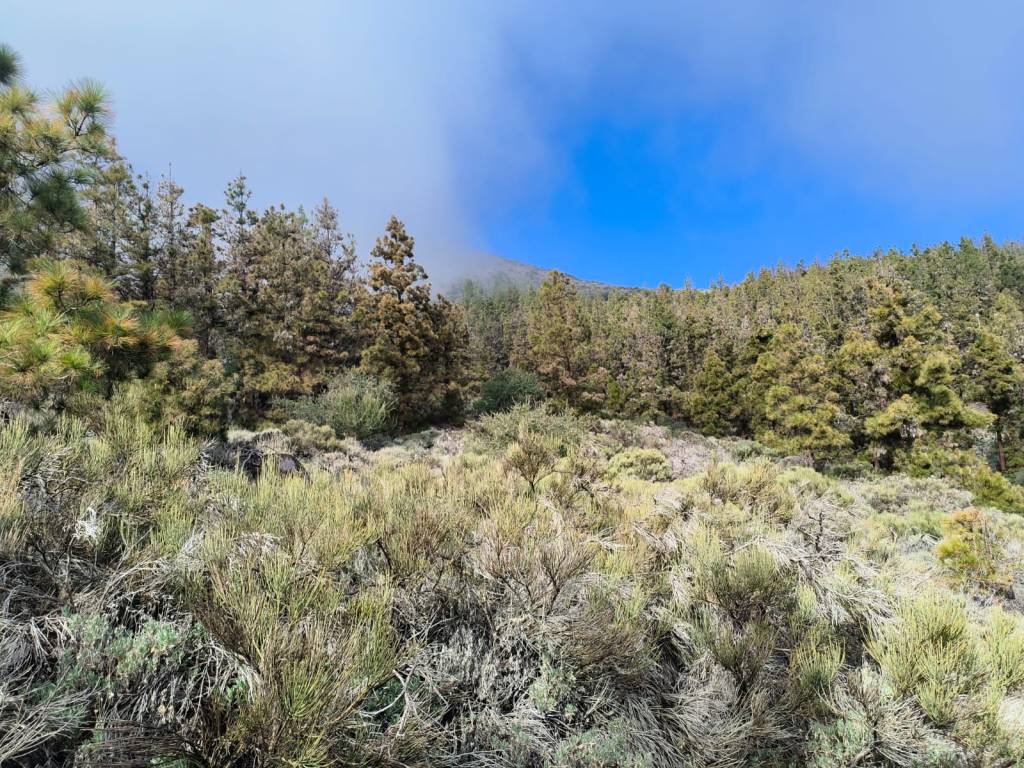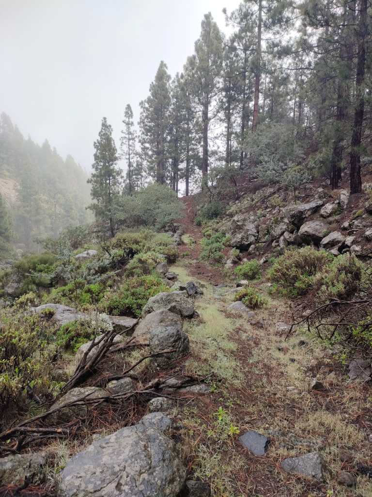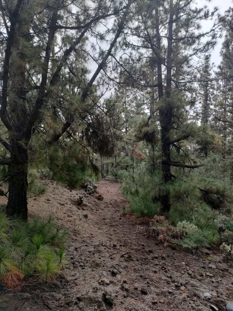 Cuando llegamos a lo primeros pinos, el sendero nos dibuja lo que en otra época fue un camino de unos dos metros de ancho, que sirvió para el paso del ganado en trashumancia hacia los pastos comunales de Las Cañadas, pero que en la actualidad esta comido por la vegetación y ya solo se vislumbra una pequeña vereda. Un fascinante bosque de pinos canarios que están dentro de la llamada Corona Forestal, en lo más remoto y solitario de la Isla.