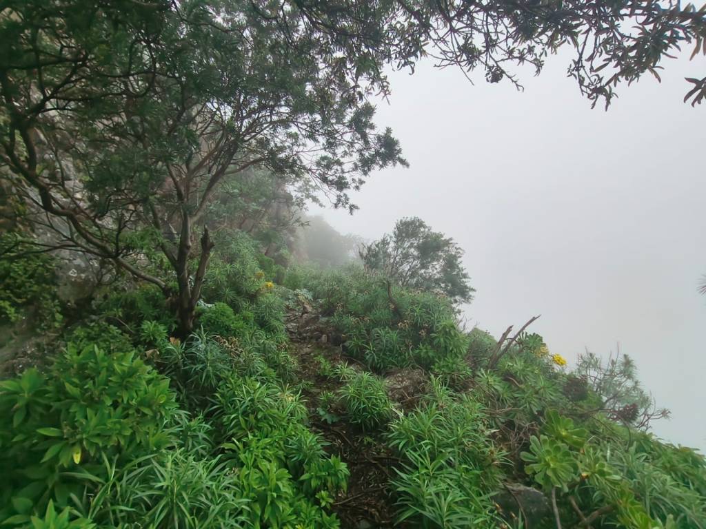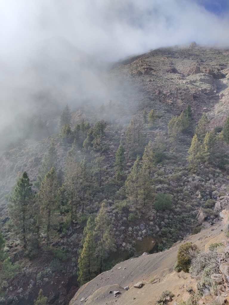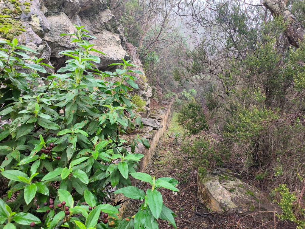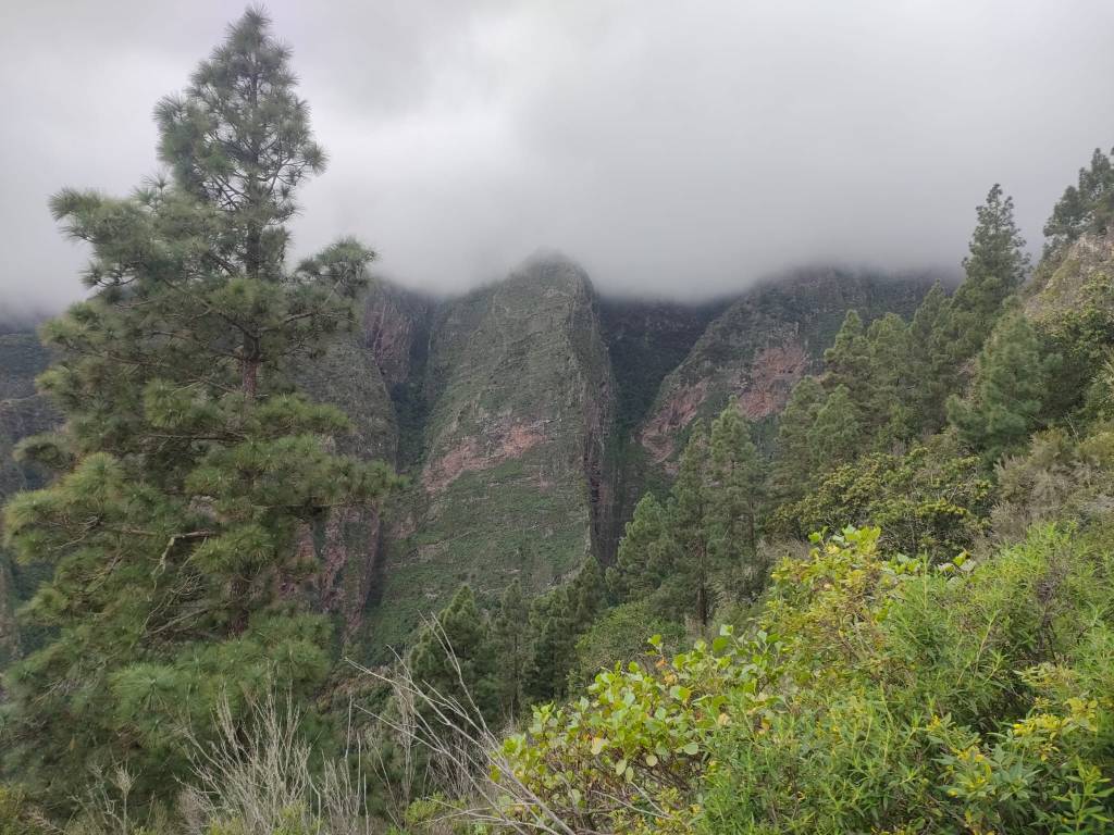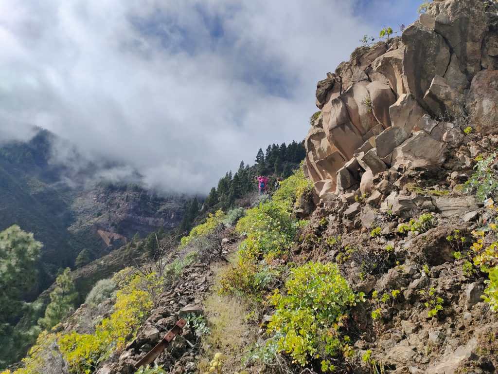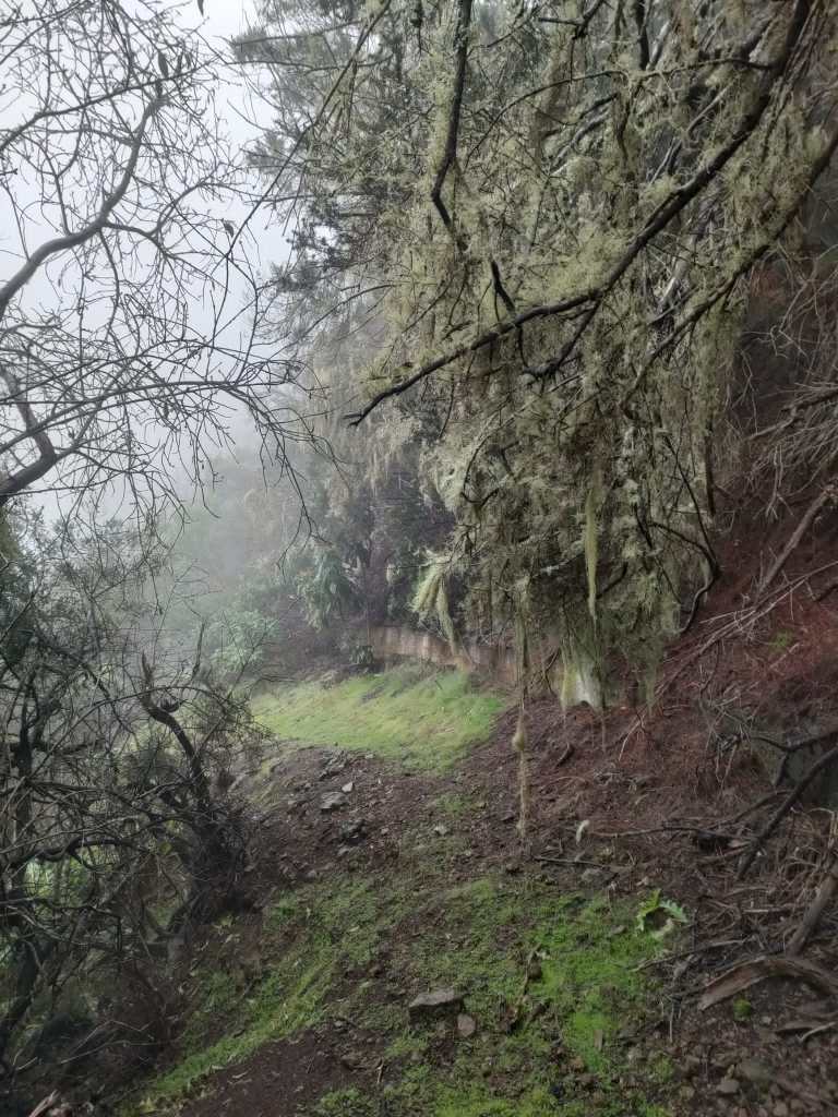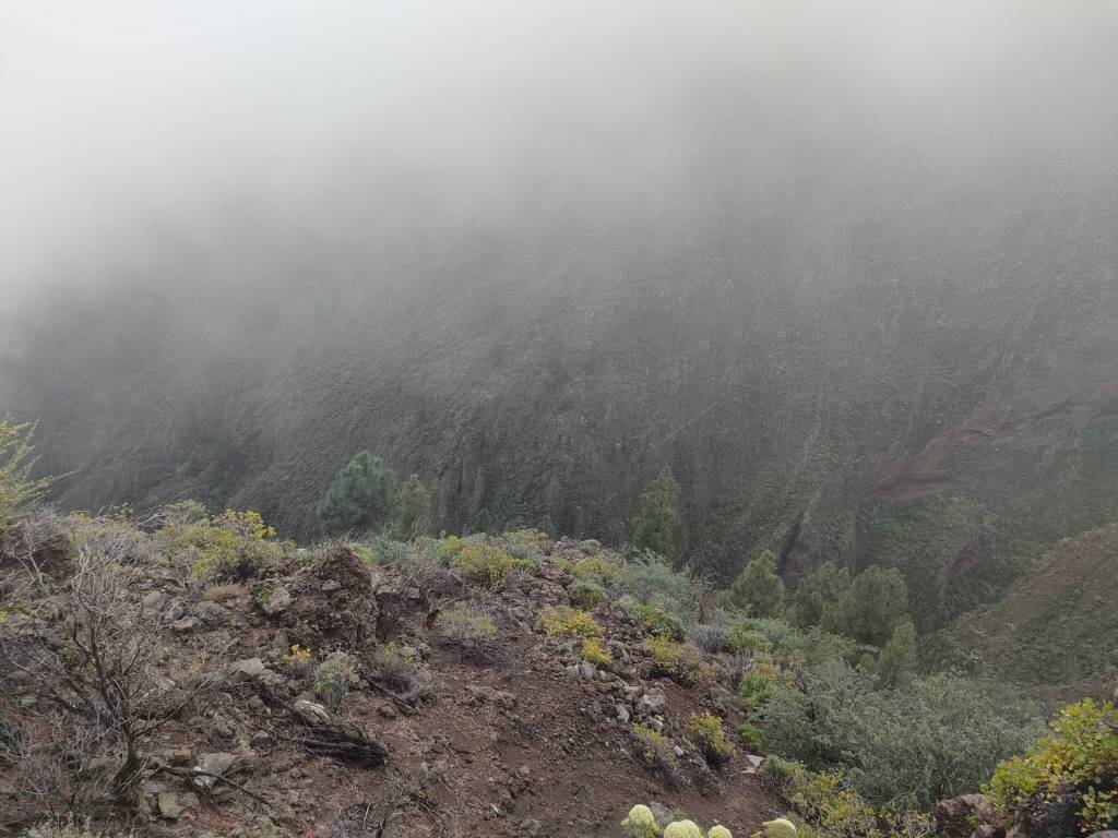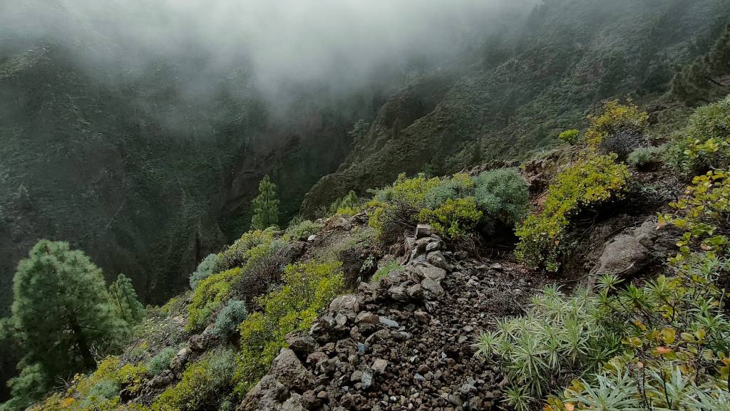 En este punto comenzamos a atravesar una zona de monteverde, y donde los alisios chocan contra la ladera, formando el llamado «mar de nubes». Es muy fácil encontrar lluvia y por lo tanto, casi sin remedio acabaremos empapados. Por esta parte tampoco es fácil avanzar, ya que estamos descendiendo por una de las paredes del barranco, por lo que la sensación de vértigo se acentúa, y junto con la lluvia, hay que extremar las precauciones.