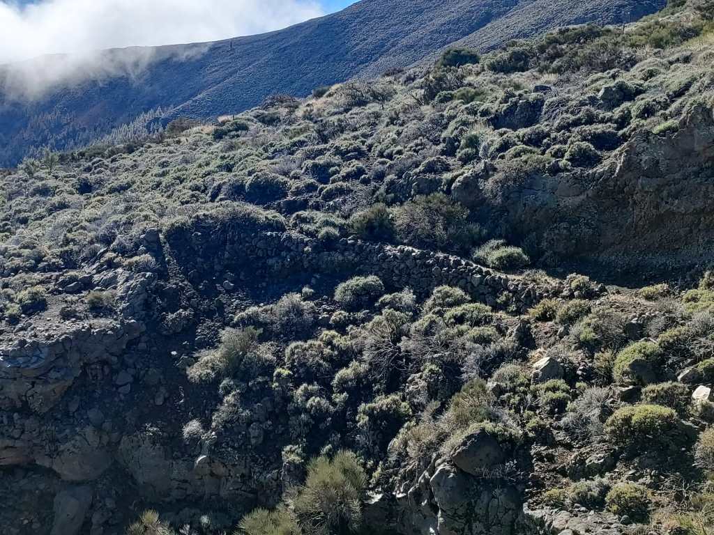 A partir de este punto comienza el descenso por una montaña de picón donde todavía se puede intuir ligeramente, el sendero que hace muchos años se transitaba, y donde hoy en día hay que prestar atención para no perderse.