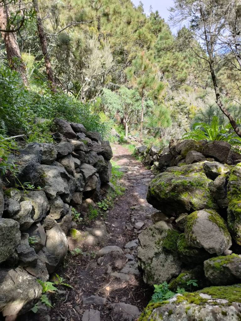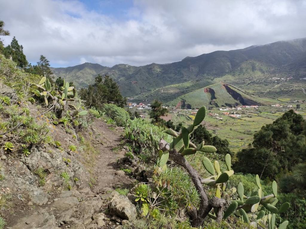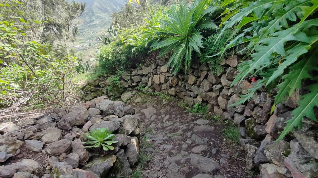 El descenso por este camino hasta El Palmar es un zigzagueante sendero con un fuerte descenso en algunos tramos, y donde la mayor parte del recorrido discurre entre muros y empedrado, que cuando la vegetación nos lo permite podemos ver de nuevo unas vistas de todo el valle. Una última parte donde el brusco descenso que realizamos para bajar hasta nuestro final de la ruta puede hacer mella en nuestras rodillas.